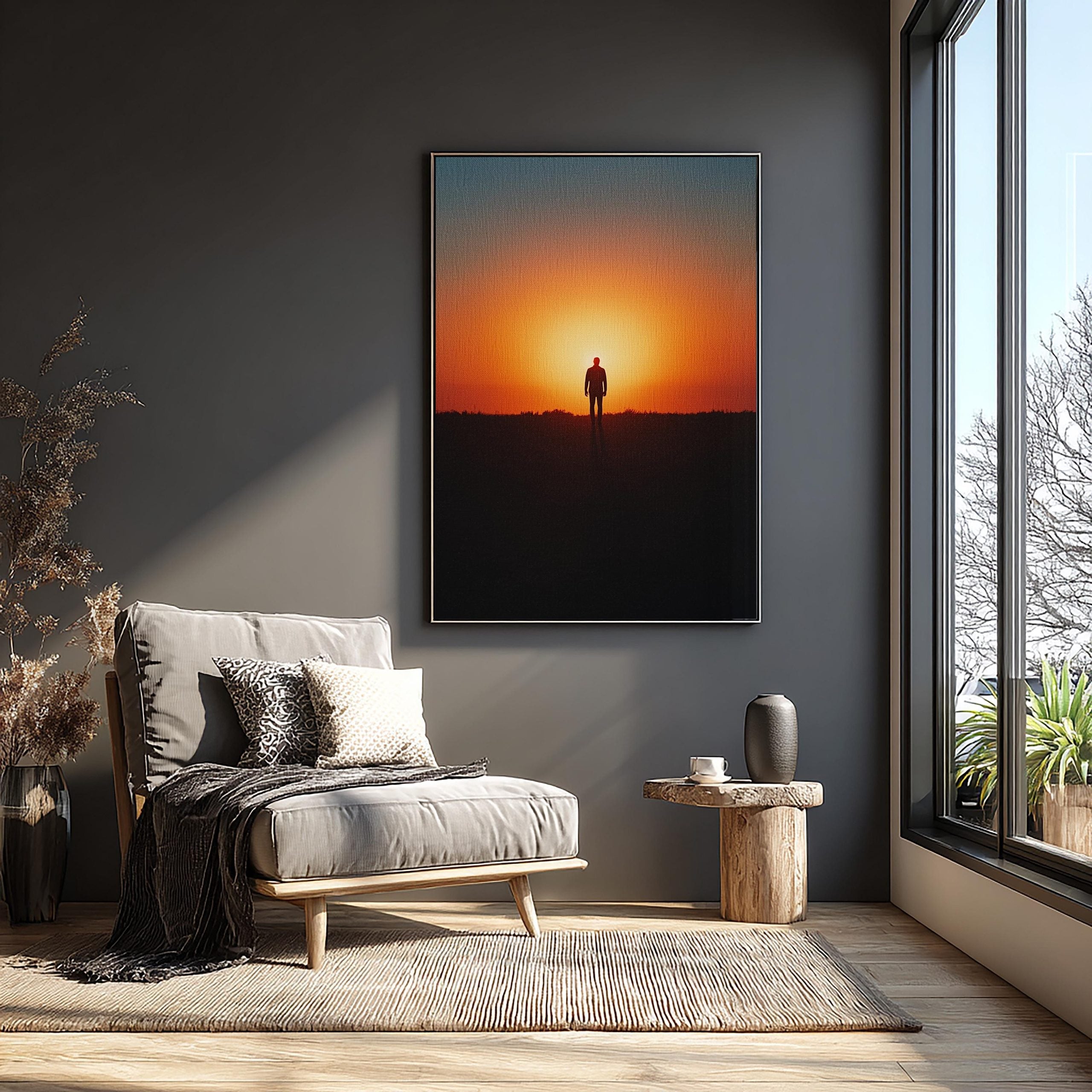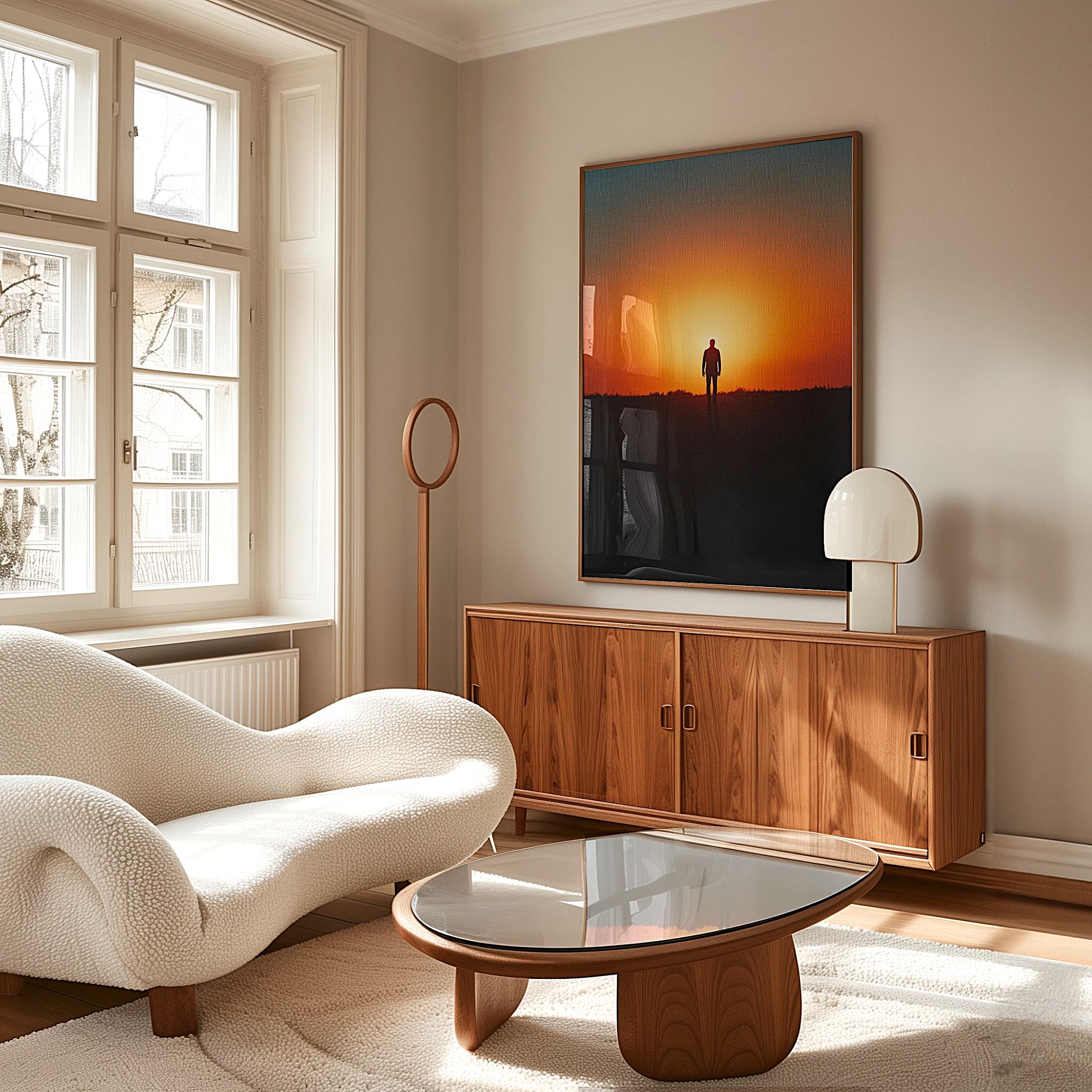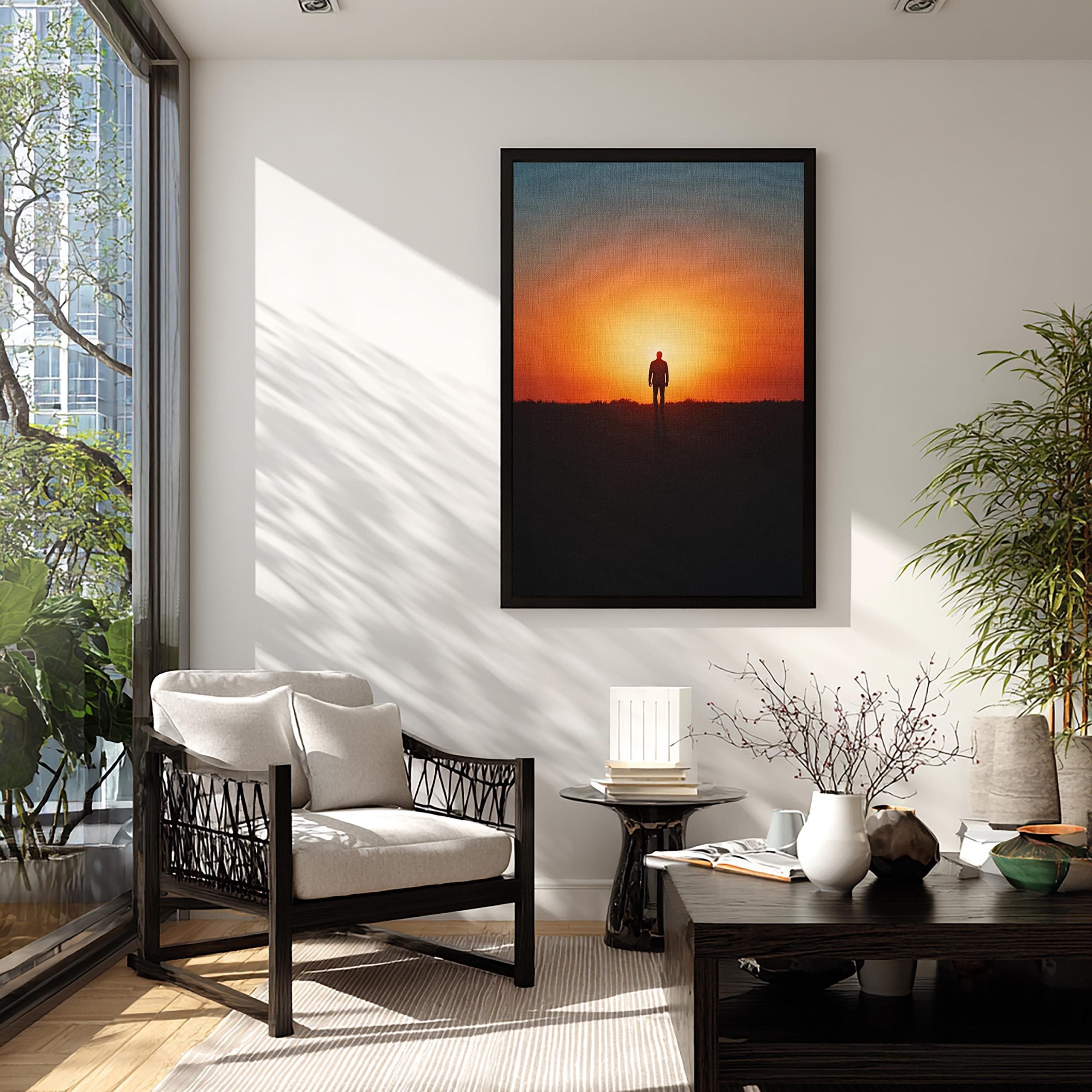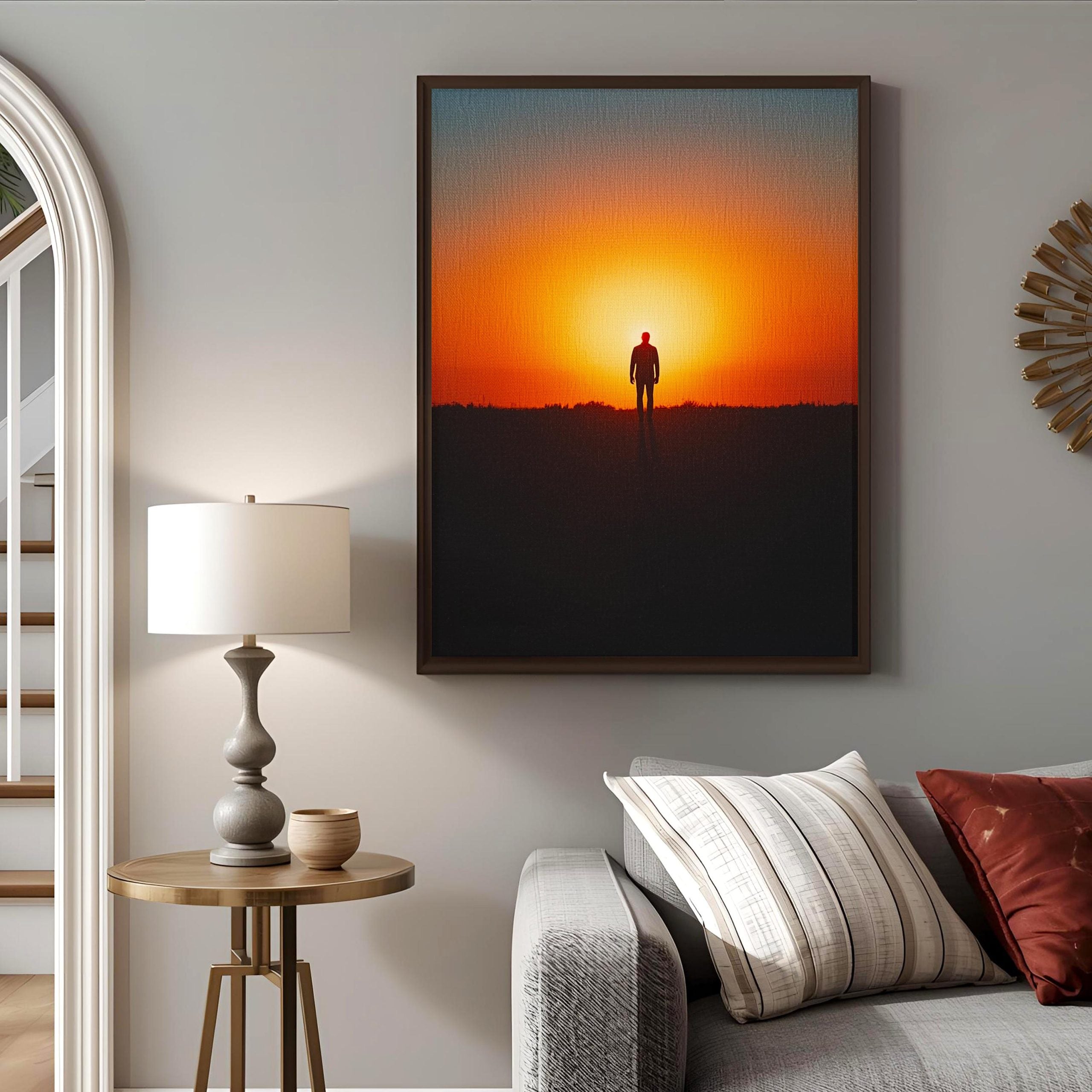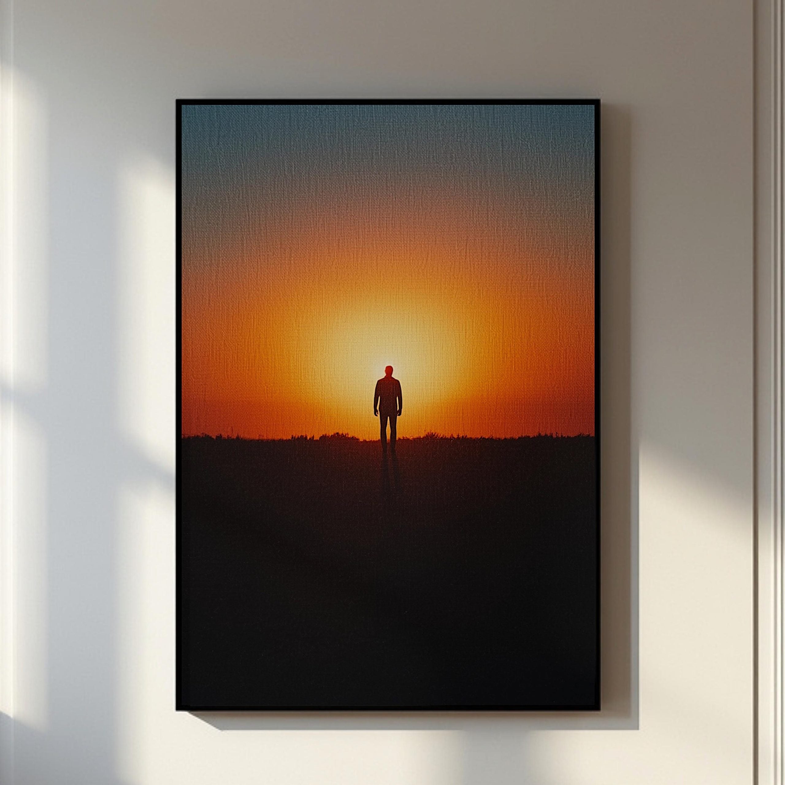 Evoke peace, hope, and inner strength with this striking minimalist silhouette artwork featuring a lone man walking toward a blazing sunset.
