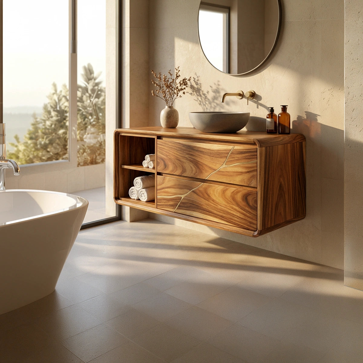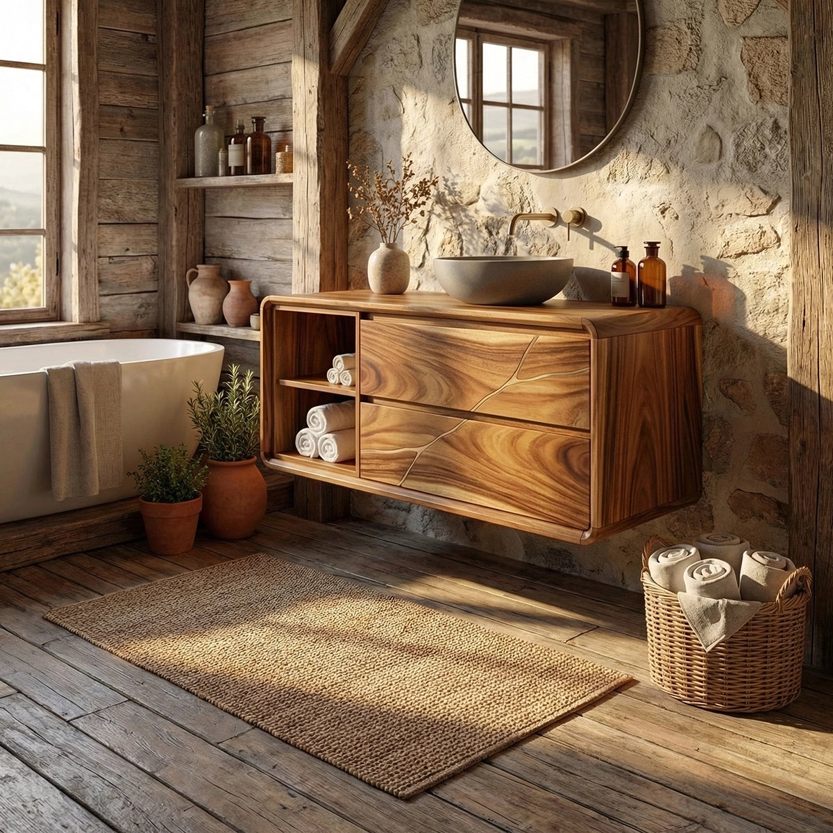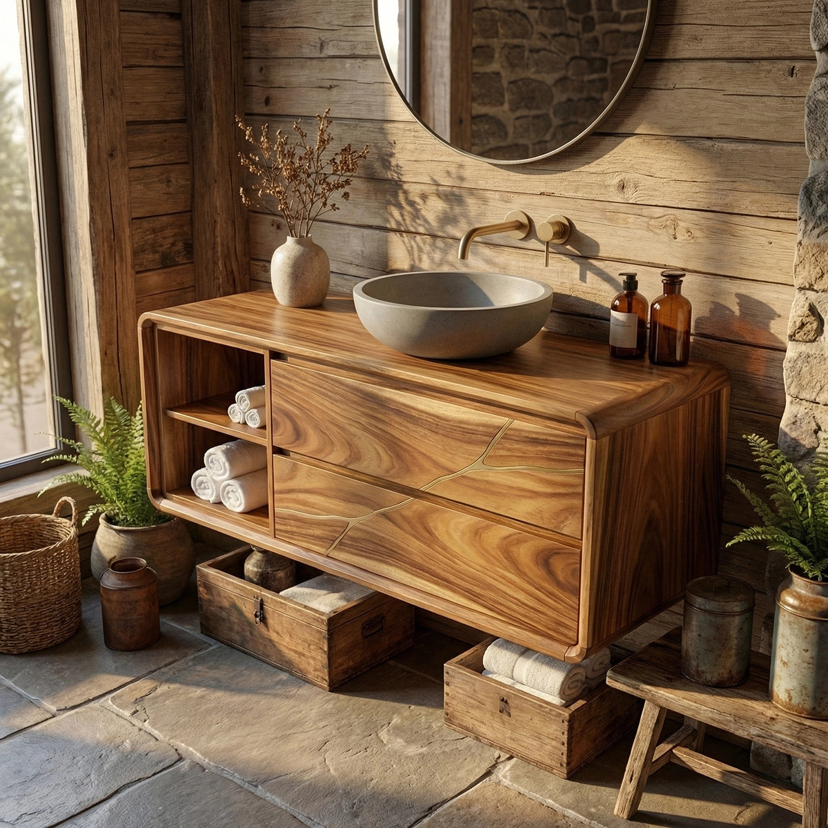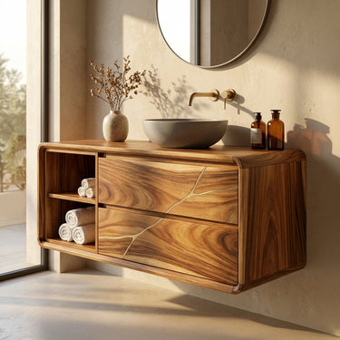 The Artisan Solid Wood Vanity with Inlay Detail and Open Shelf Storage brings together refined craftsmanship, natural warmth, and practical storage in one beautifully balanced bathroom piece. Designed with a softly contoured frame, spacious drawers, and an open shelf section, this vanity creates a calm and inviting presence while adding subtle artisanal detail to the space. Its natural wood character and understated design make it a versatile focal point for bathrooms shaped by texture, simplicity, and thoughtful styling.