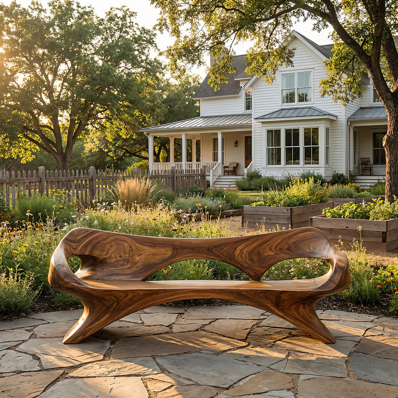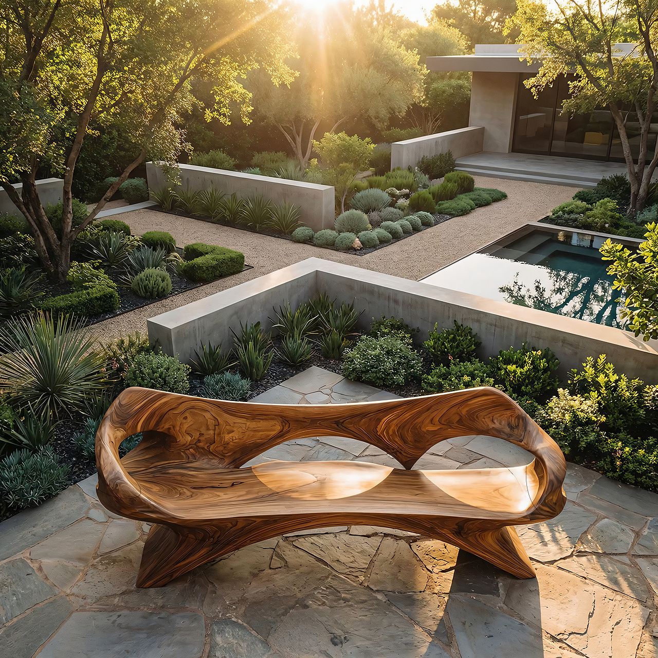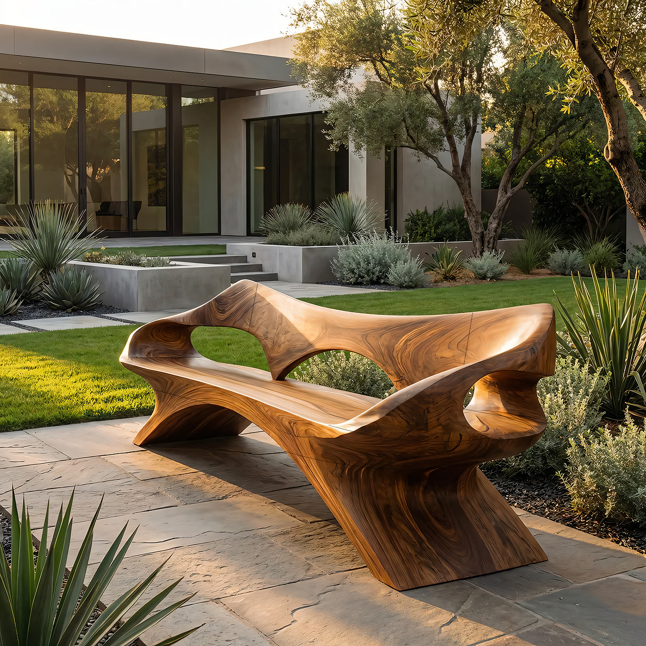 Bring sculptural drama and natural warmth into your space with this artistic wood lounge bench, designed as a functional seat with the presence of a collectible design piece. Its flowing silhouette, integrated backrest, and deeply carved open frame create a striking composition that feels both organic and architectural. The rich wood tone and bold contours make it especially suited to modern landscapes, gallery-inspired interiors, and refined outdoor living areas with a strong design point of view.