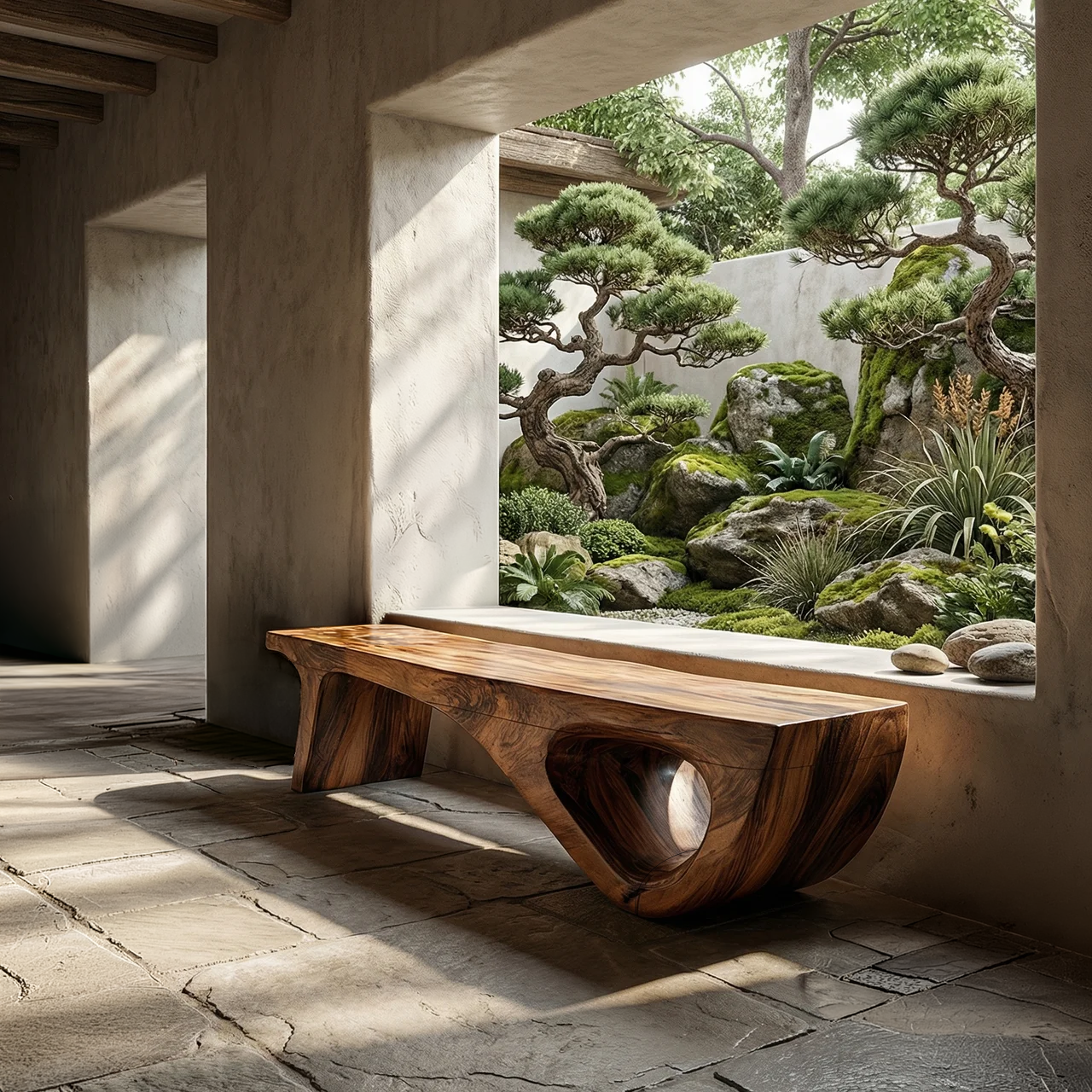 The design is defined by its carved hollow end detail, which introduces depth, movement, and a striking sense of asymmetry beneath the streamlined top. This sculpted form creates a beautiful contrast between solid mass and open negative space, giving the table a handcrafted presence without making it feel heavy. The warm wood tone and flowing grain patterns enhance the natural richness of the surface, while the softened edges keep the silhouette smooth and composed.