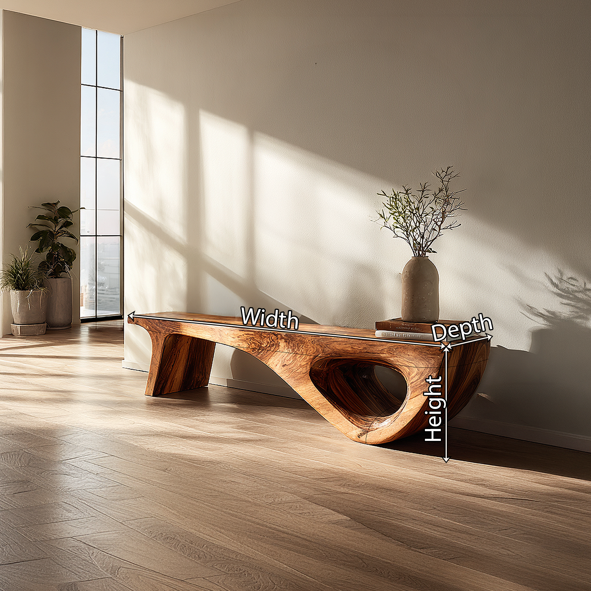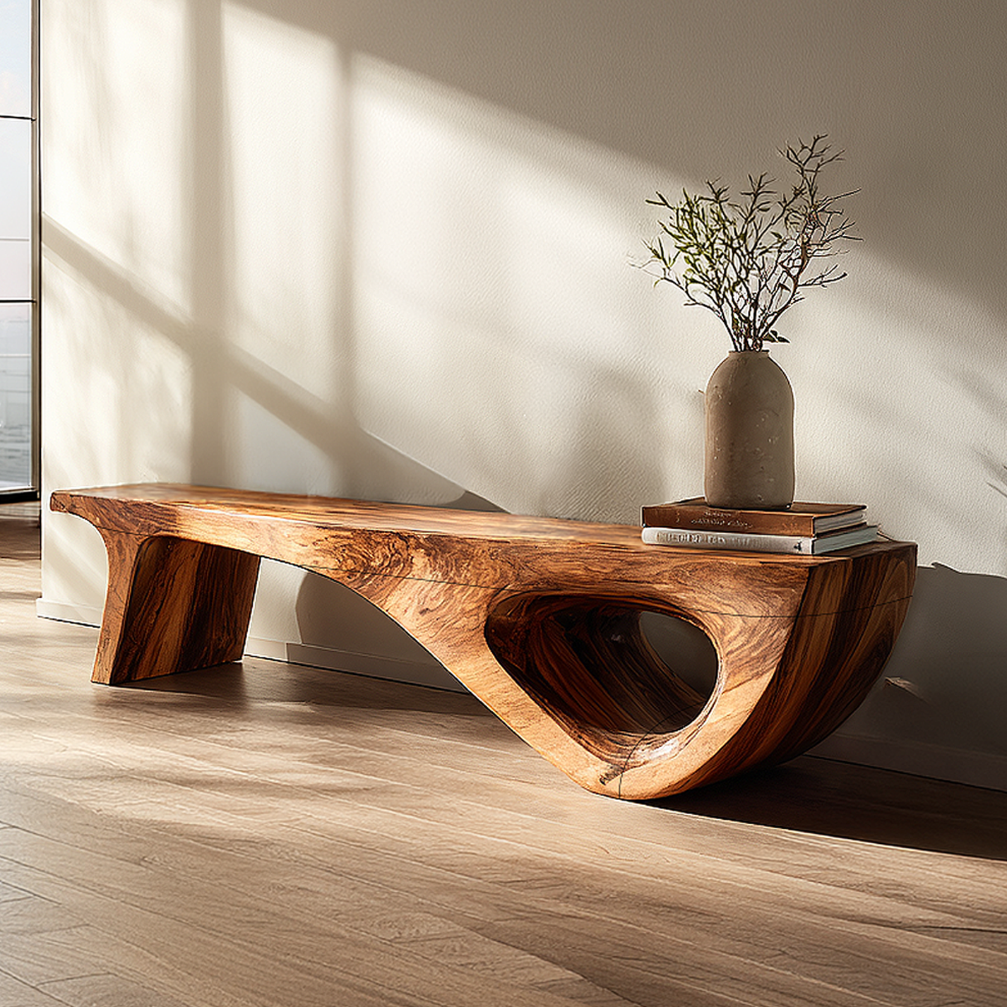 Bring sculptural warmth and quiet sophistication into your home with this gallery style wood console table, designed to pair artistic form with everyday function. Its long, low silhouette and richly expressive wood grain create a refined focal point that feels calm, grounded, and visually distinctive. The overall composition suits modern, organic, and minimalist interiors where natural material character and clean architectural lines are central to the space.