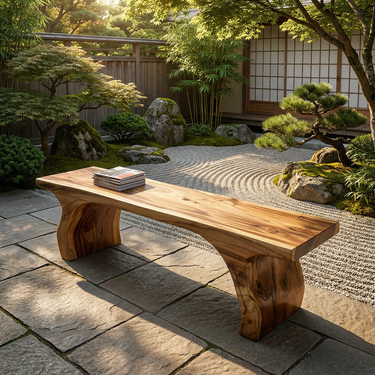 Bring quiet warmth and sculptural simplicity into your home with this handcrafted wood bench, designed to offer both practical seating and a strong natural presence. Its elongated seat, softly contoured edges, and solid waterfall-style legs create a refined silhouette that feels grounded yet fluid. The rich variation in tone and grain gives the piece an inviting character, making it especially suited to warm minimalist, Japandi, and organic modern interiors.