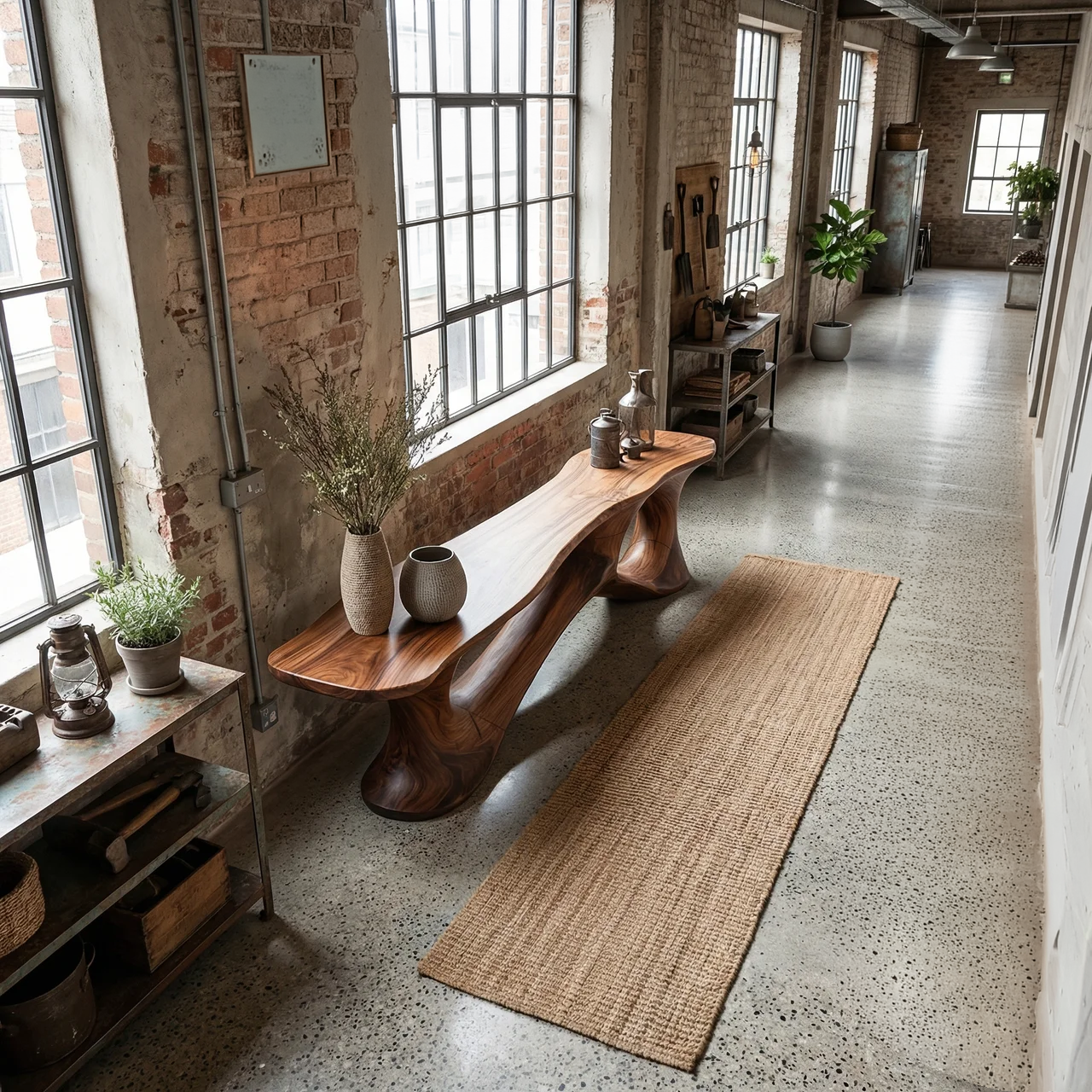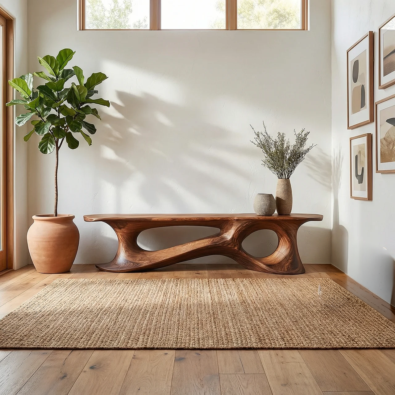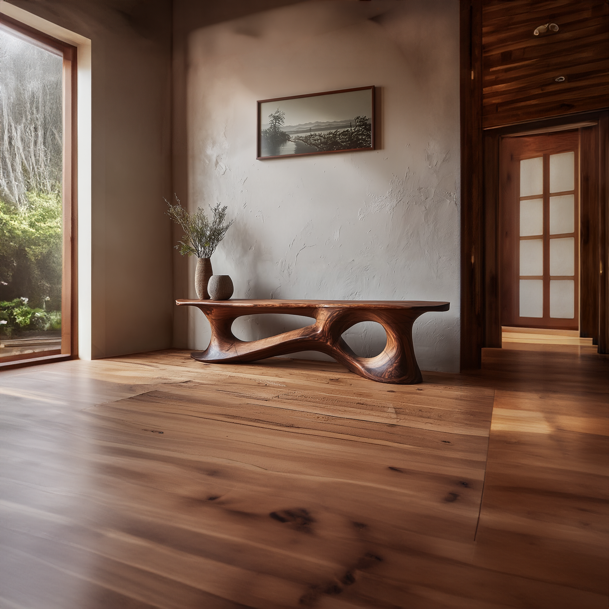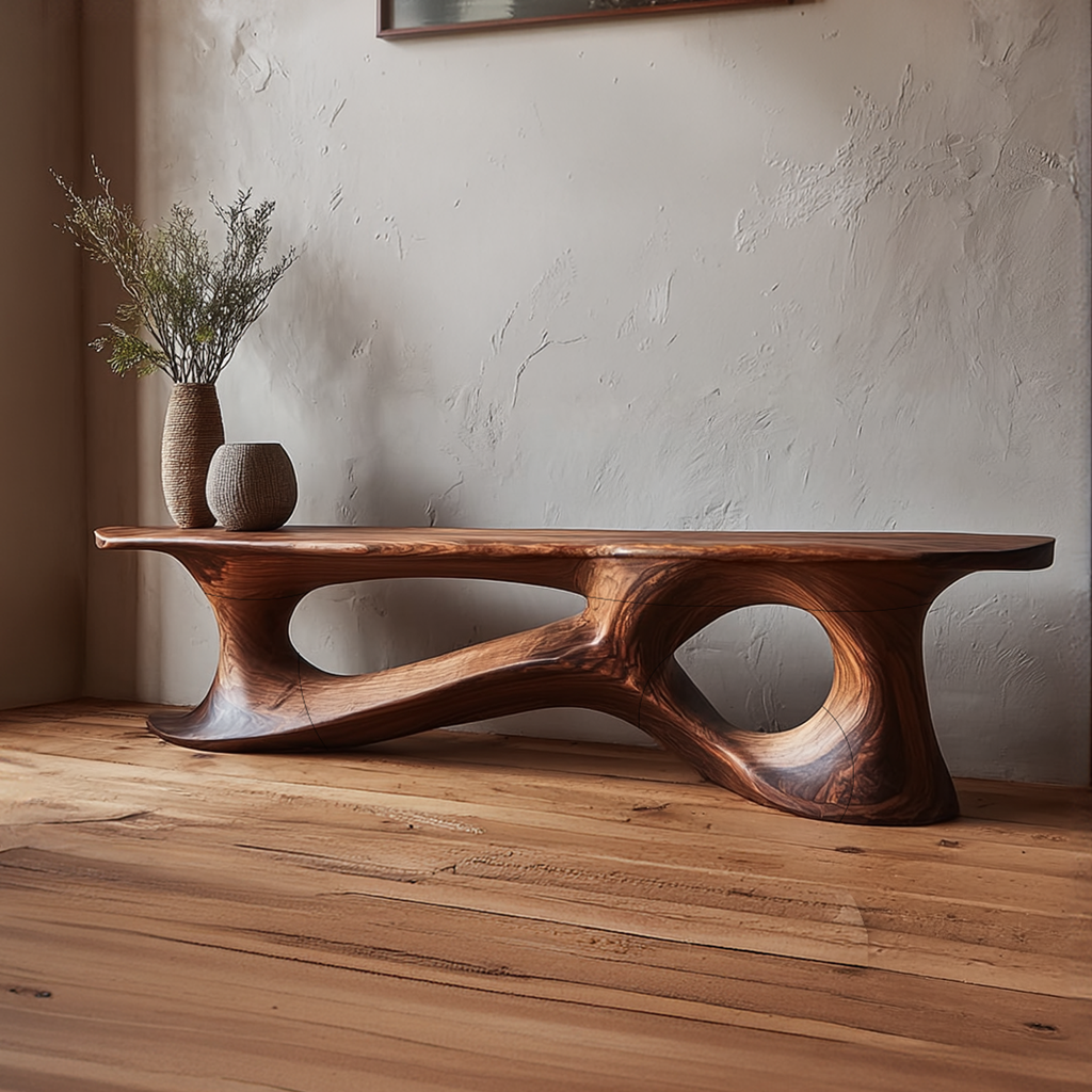 Bring sculptural warmth and understated artistry into your home with this low profile wood console table, designed to create a calm focal point while preserving a clean, open feel. Its elongated silhouette, rich wood tone, and fluid carved base give the piece a refined presence that feels both grounded and contemporary. The overall composition suits minimalist, organic modern, and design-led interiors where natural material character and quiet visual impact matter equally.