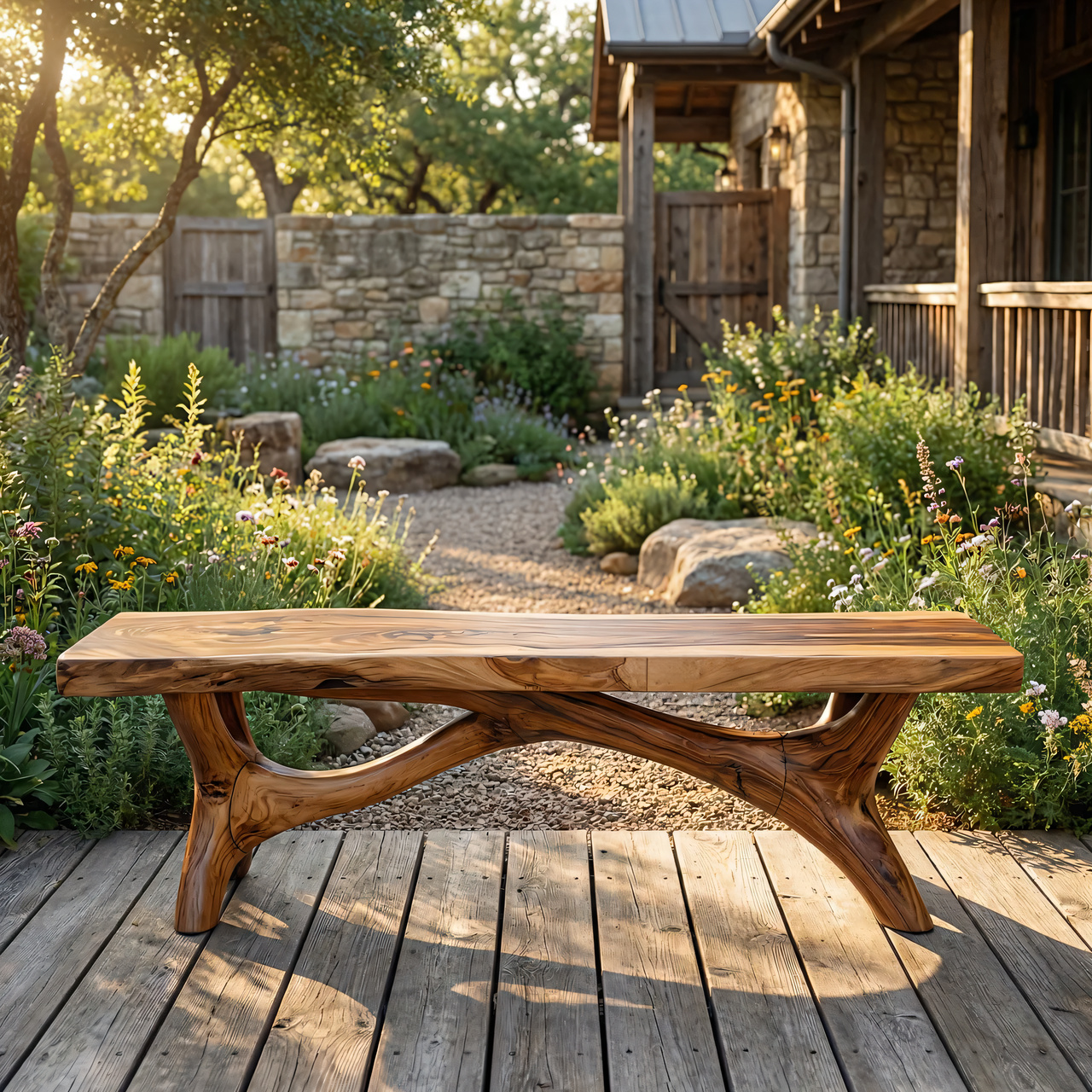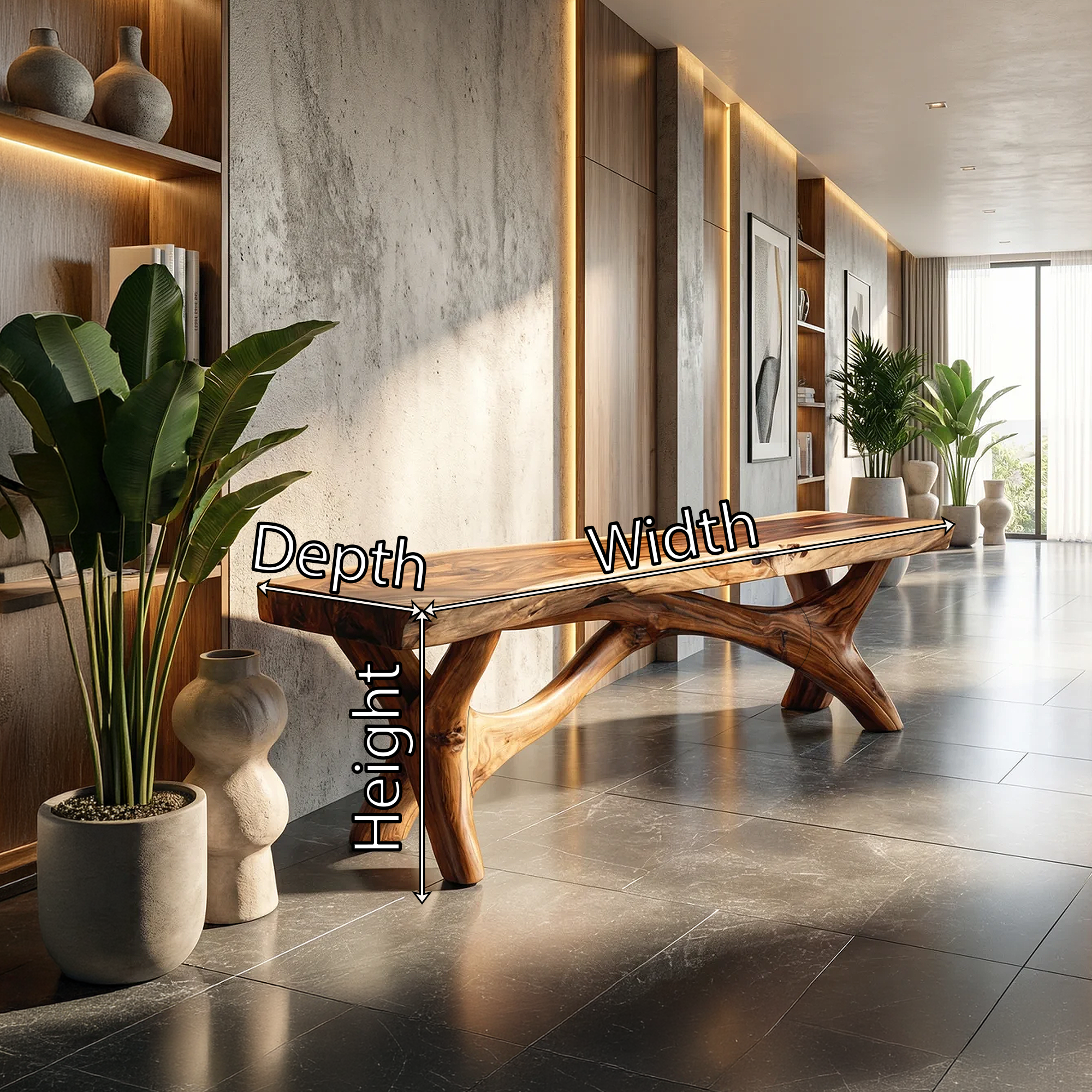 Bring natural artistry and grounded warmth into your space with this solid wood bench, designed to pair sculptural form with everyday functionality. Its long plank-style seat, rich wood grain, and branch-inspired base create a striking silhouette that feels organic yet refined. The overall look suits architectural interiors, modern rustic homes, and organic contemporary spaces where natural materials are used to make a quiet but memorable statement.