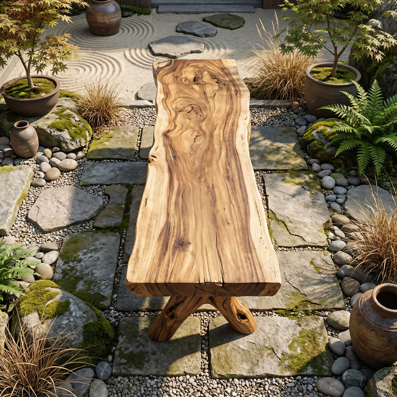 The design is defined by its expressive base, where intersecting wood supports resemble branching limbs beneath the bench seat. This sculptural framework adds movement and handcrafted character while maintaining a balanced, open profile. The thick top highlights the beauty of natural wood through visible grain variation, tonal depth, and softly irregular edges, giving the piece a substantial presence that still feels warm and approachable.