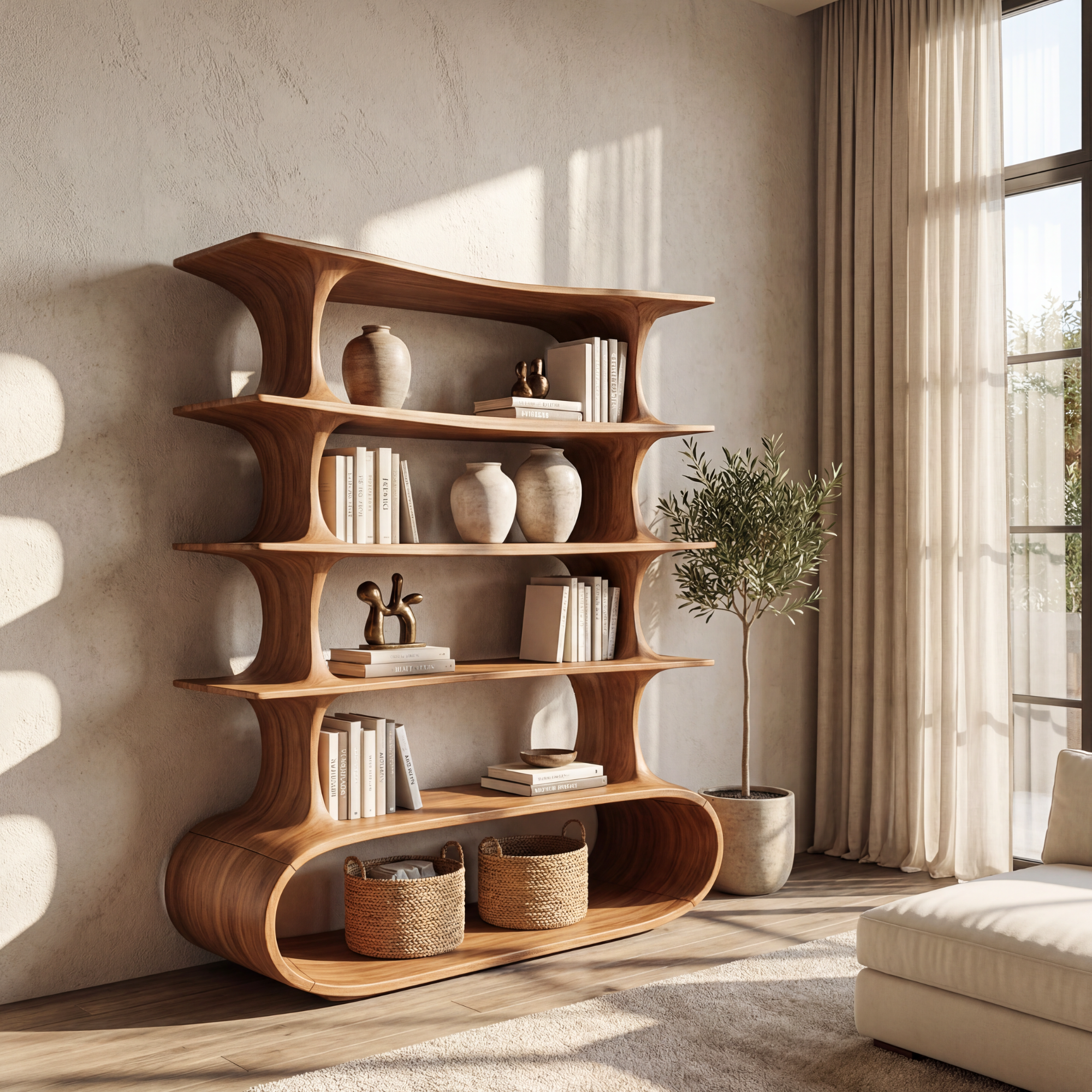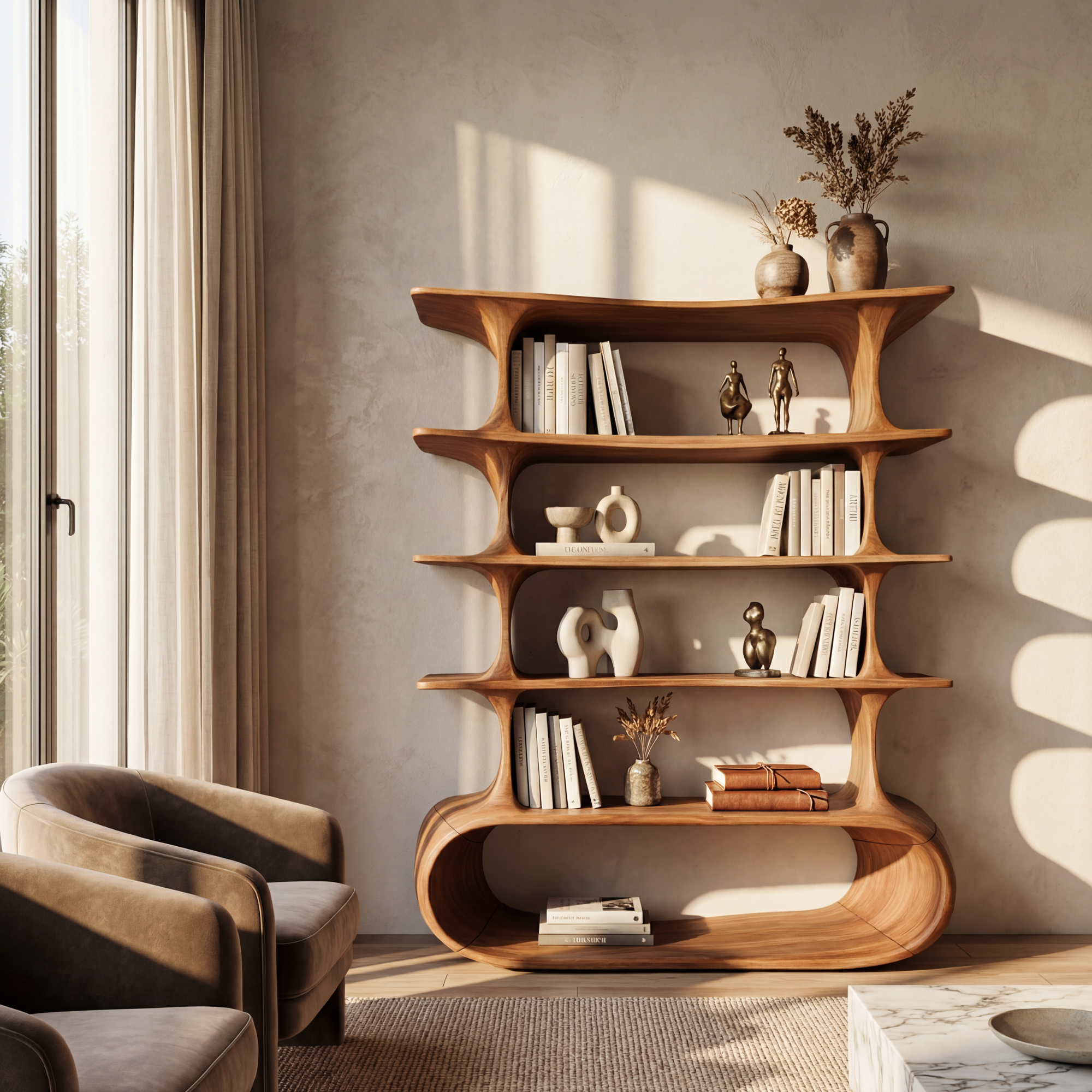 This bookshelf features a balanced, tiered layout with evenly spaced shelves that create a sense of order and stability. The sculpted side supports introduce gentle curves, softening the structure while maintaining a clean, modern silhouette. Its symmetrical composition makes it ideal for interiors that favor harmony, clarity, and understated sophistication.