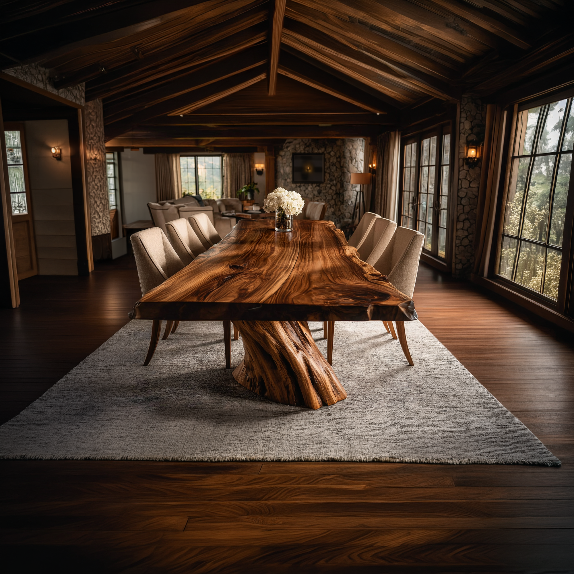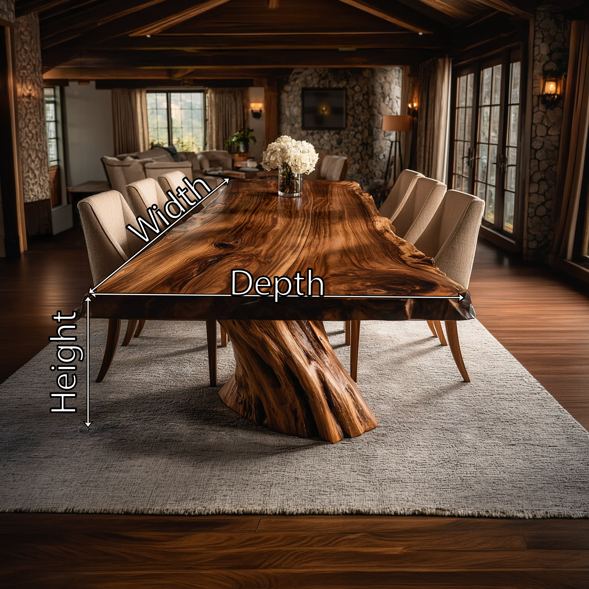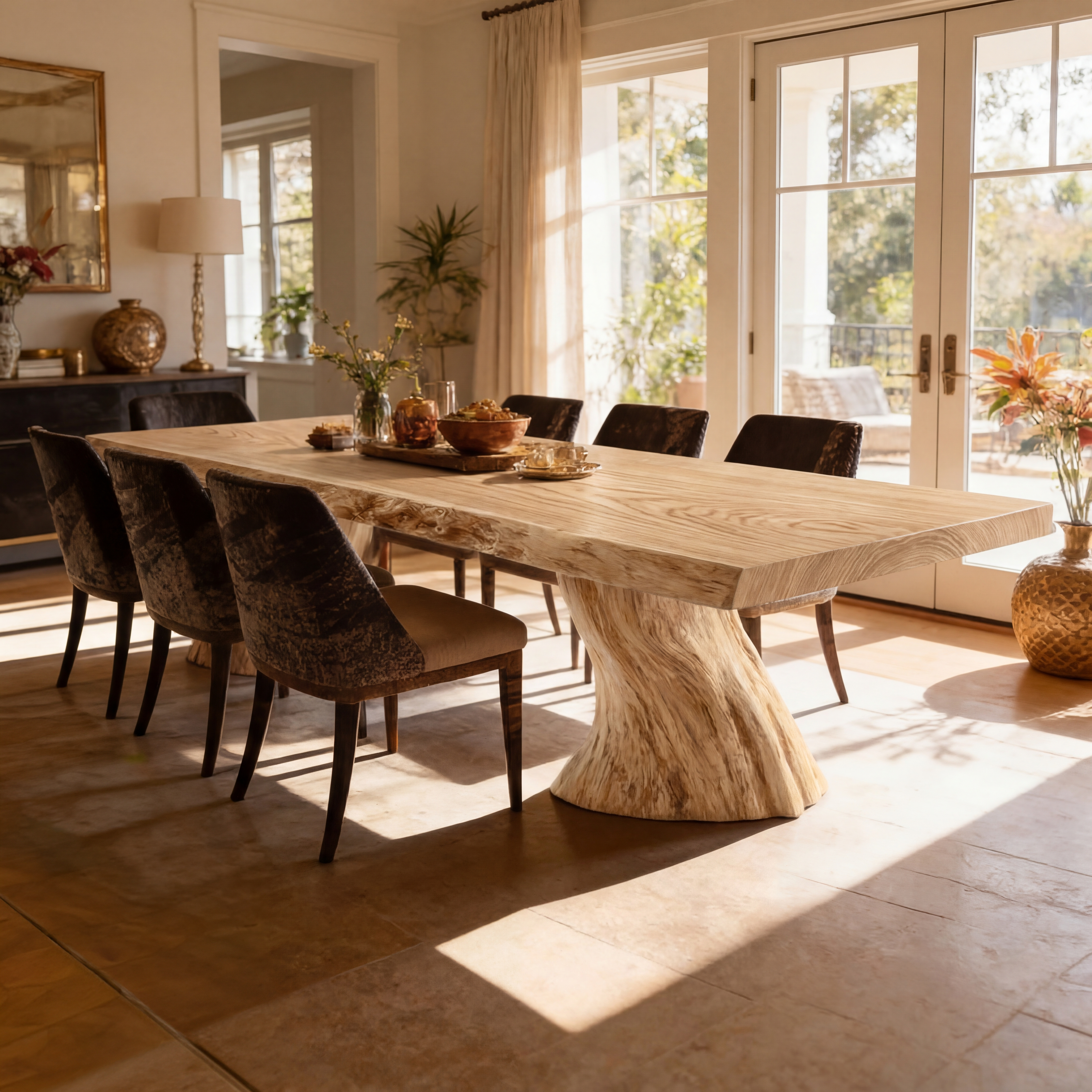 A bold fusion of natural artistry and refined design, this sculptural solid wood dining table captures attention through its dramatic form and rich organic texture. The expansive live edge tabletop reveals intricate grain patterns that flow like natural landscapes, while the hand-carved base evokes the strength and movement of a rooted tree. Together, they create a striking balance between raw beauty and modern sophistication.