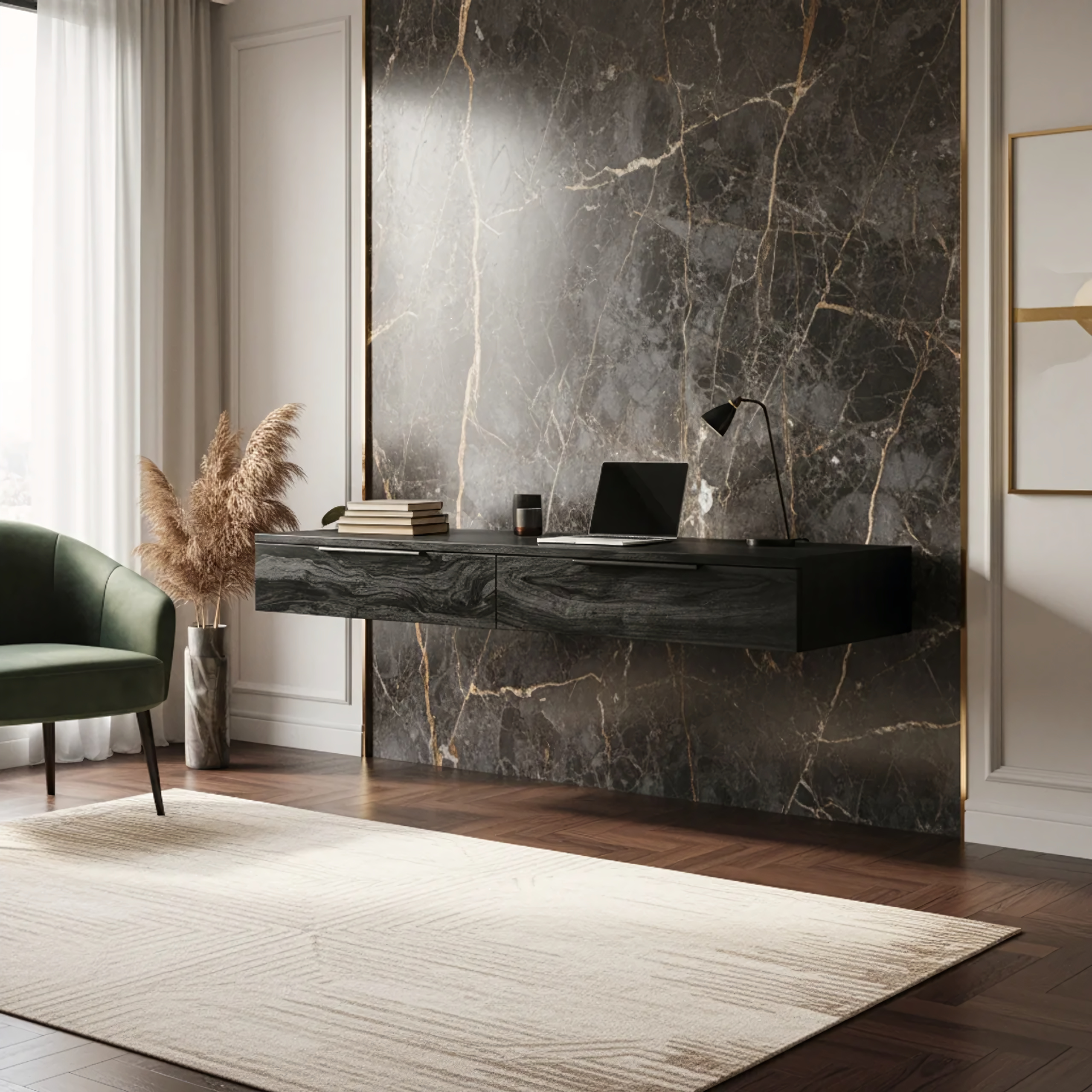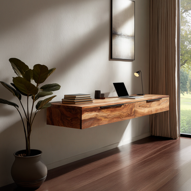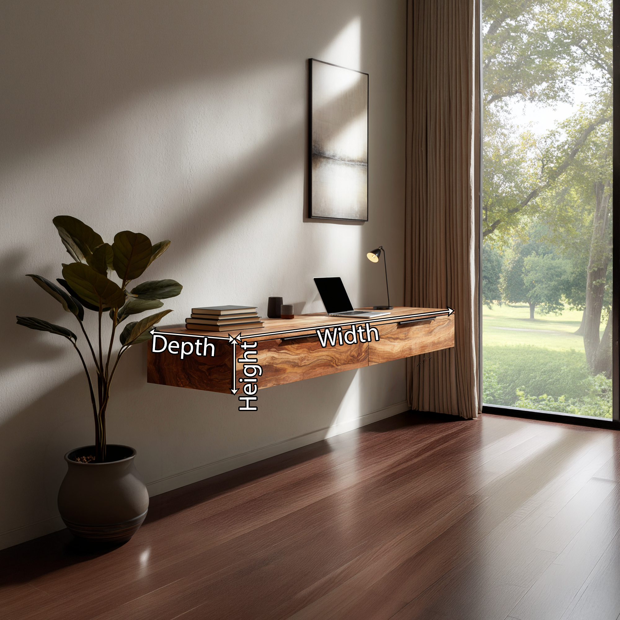 A striking fusion of artistry and function, this floating desk transforms the workspace into a refined design statement. Its elongated silhouette is enhanced by the natural movement of the wood grain, creating a sculptural surface that feels both dynamic and grounded. The seamless wall-mounted form keeps the space open and uncluttered, making it an ideal centerpiece for modern interiors that value simplicity and elegance.
