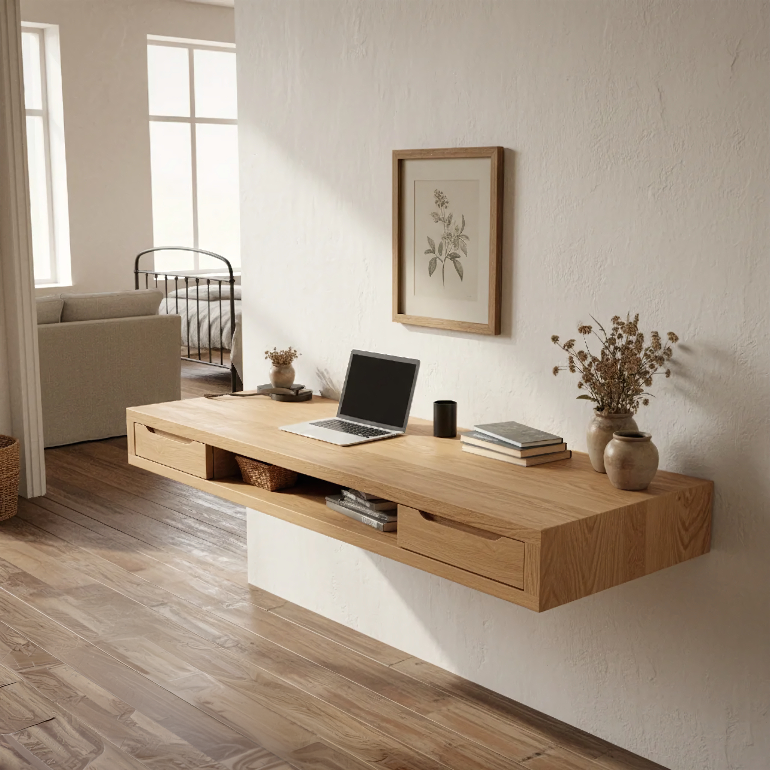 This solid wood floating desk is a refined expression of modern simplicity, designed to elevate everyday workspaces with warmth and clarity. Its clean, horizontal profile creates a balanced visual presence, while the natural wood tones soften the structure with organic character. Suspended against the wall, it enhances the sense of openness, making it an ideal choice for minimalist and contemporary interiors.