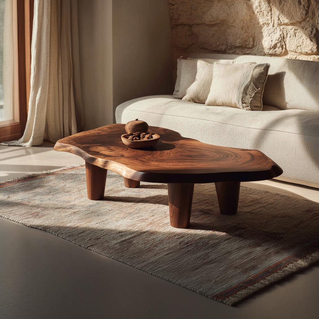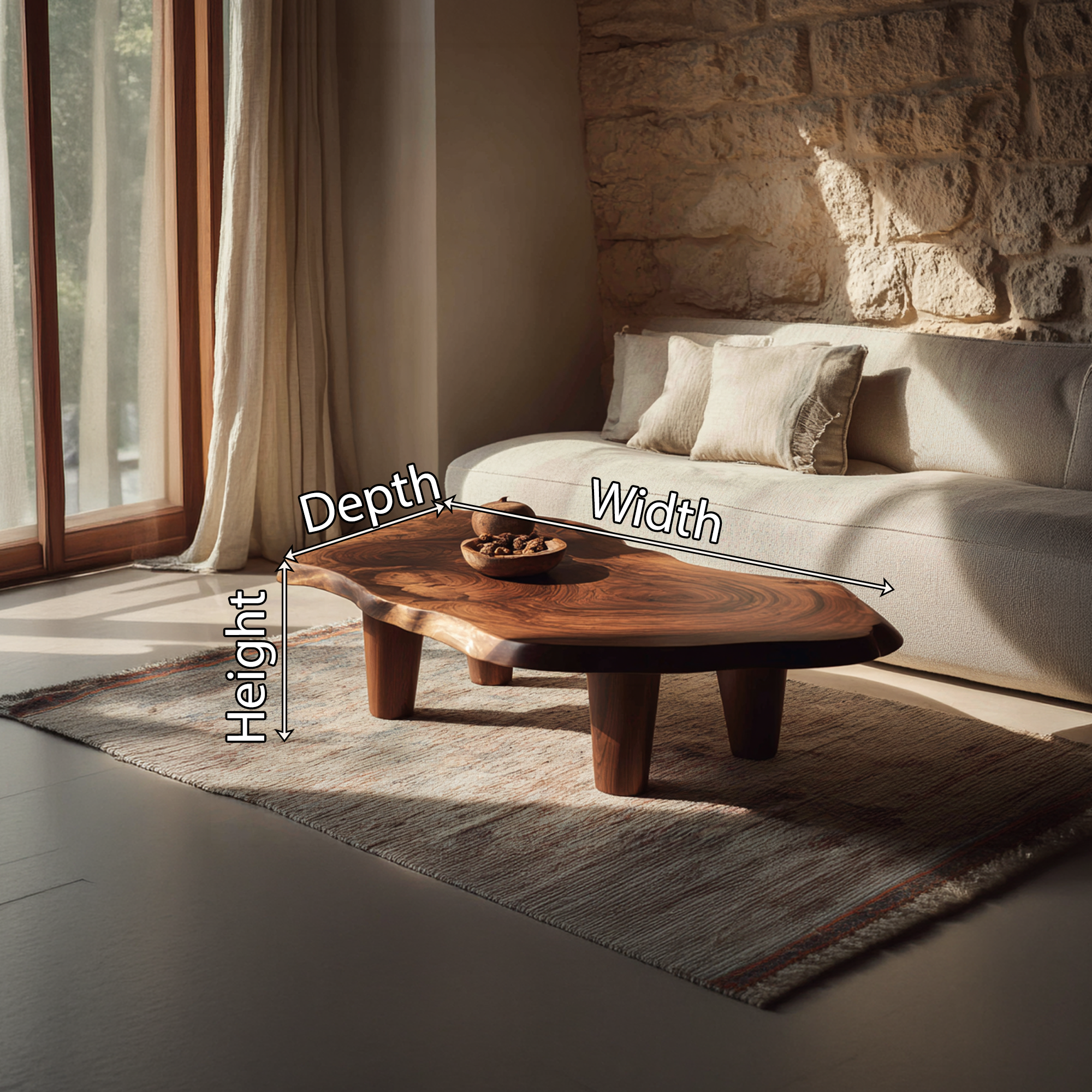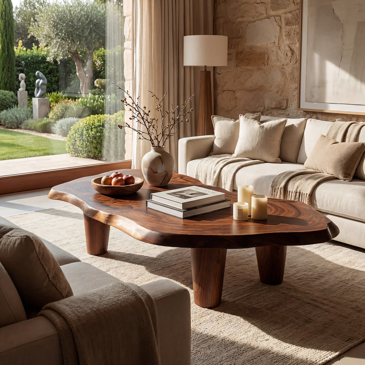 The Organic Live Edge Coffee Table with Rounded Solid Legs introduces a warm and grounded presence to the living space through its natural form and balanced proportions. Its freeform tabletop reflects the organic flow of the material, while the low, solid legs provide a stable and harmonious foundation. Designed to serve as both a functional surface and a sculptural element, this table enhances interiors with quiet elegance and natural character.