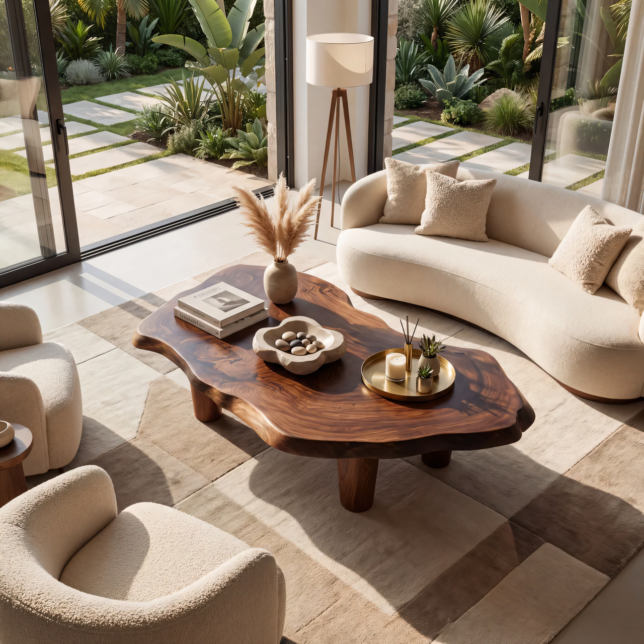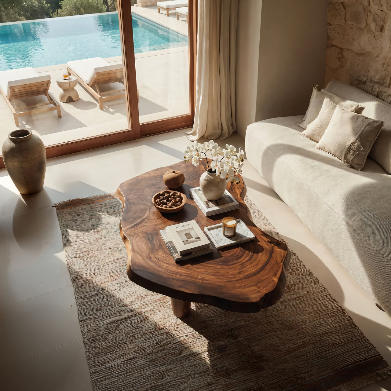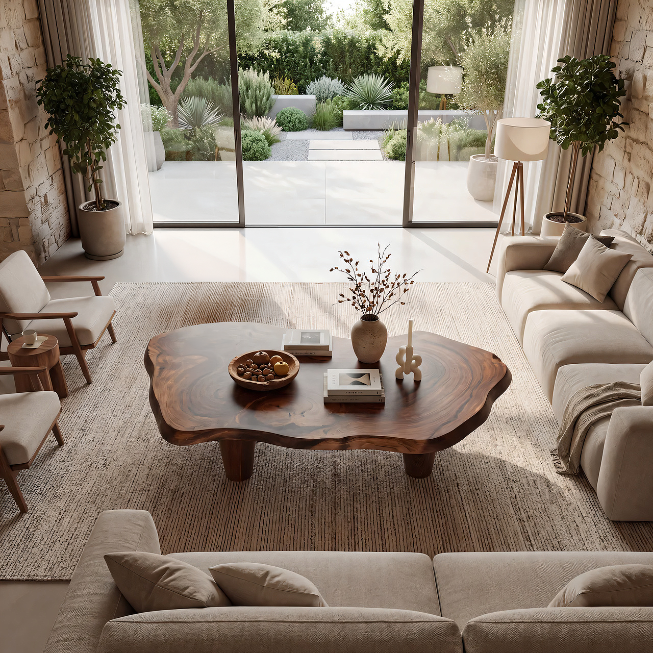 The Organic Live Edge Coffee Table with Rounded Solid Legs introduces a warm and grounded presence to the living space through its natural form and balanced proportions. Its freeform tabletop reflects the organic flow of the material, while the low, solid legs provide a stable and harmonious foundation. Designed to serve as both a functional surface and a sculptural element, this table enhances interiors with quiet elegance and natural character.