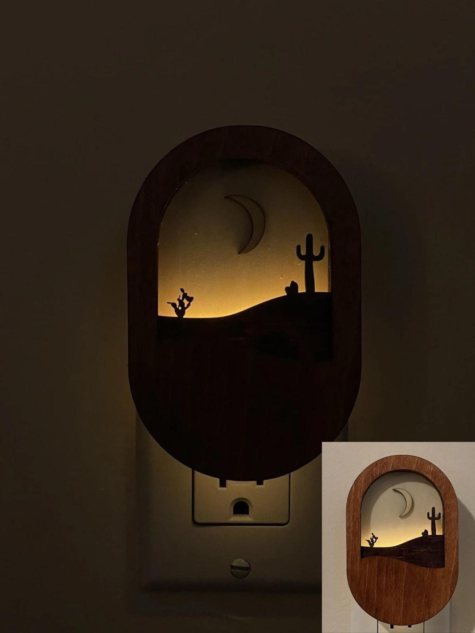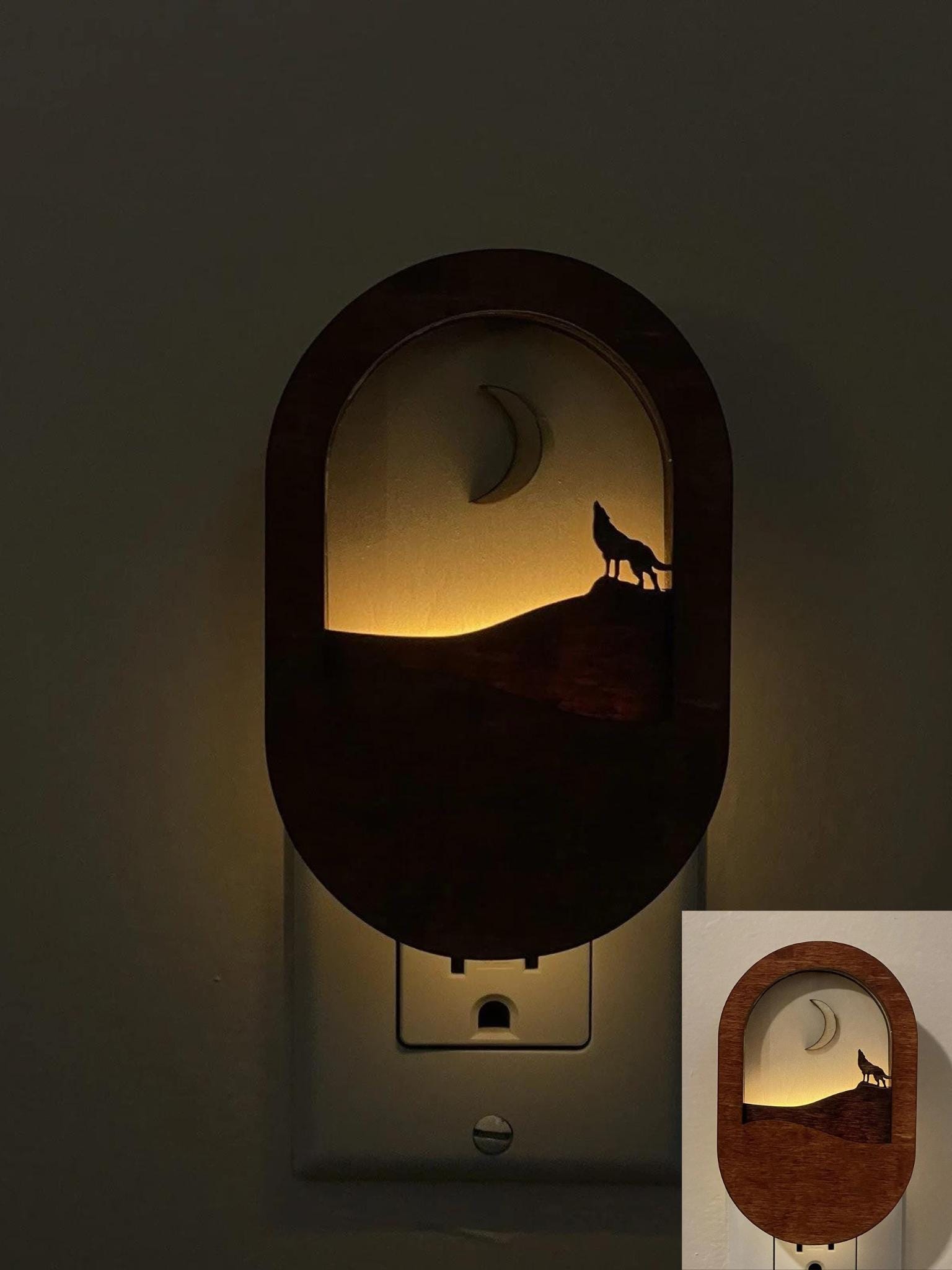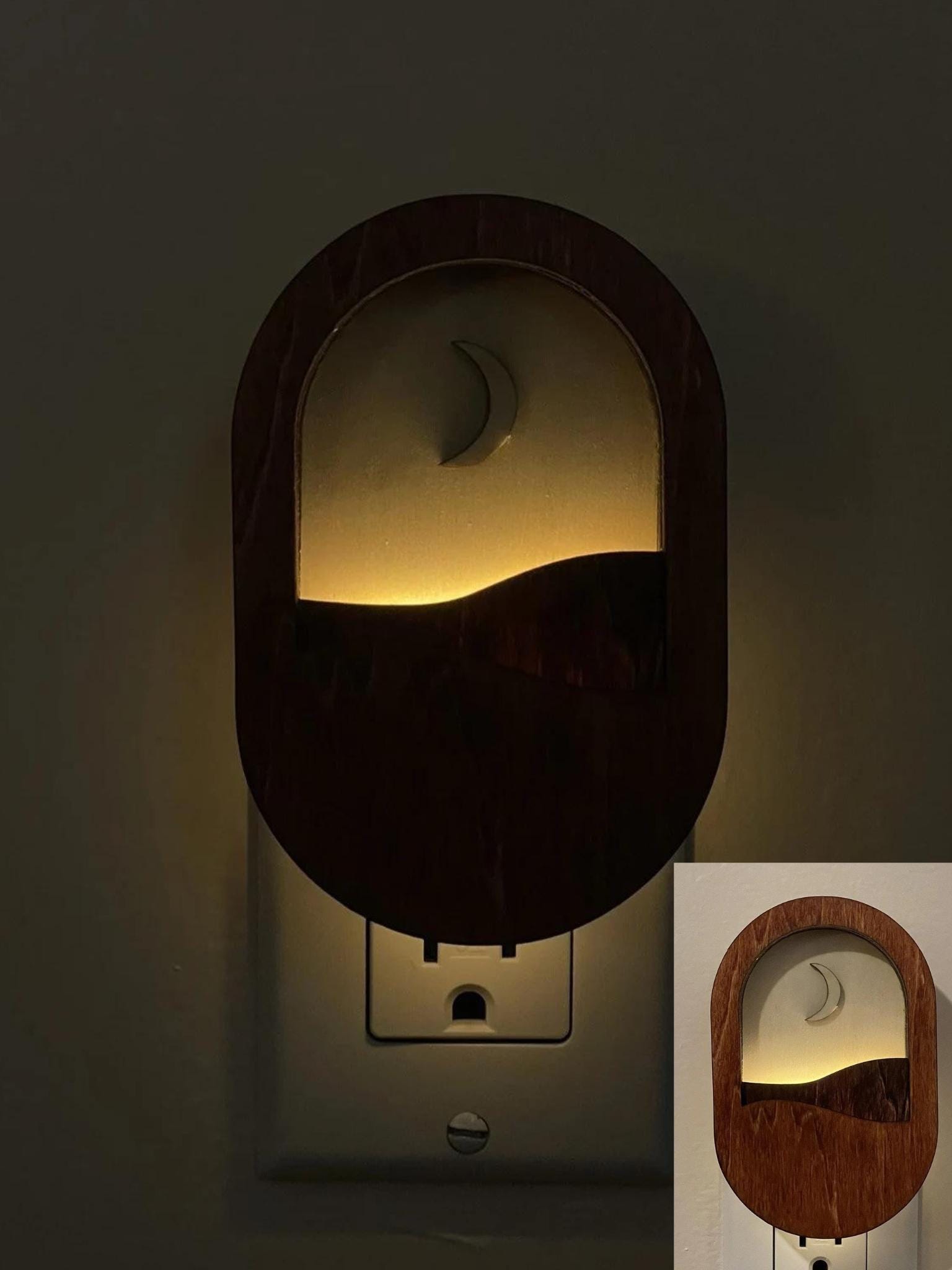 This handmade wall plug nightlight features a peaceful scene of the moon shining over rolling hills, bringing a calm and natural atmosphere to your space. Crafted from natural wood, the design highlights the beauty of the material while creating a warm and gentle glow.