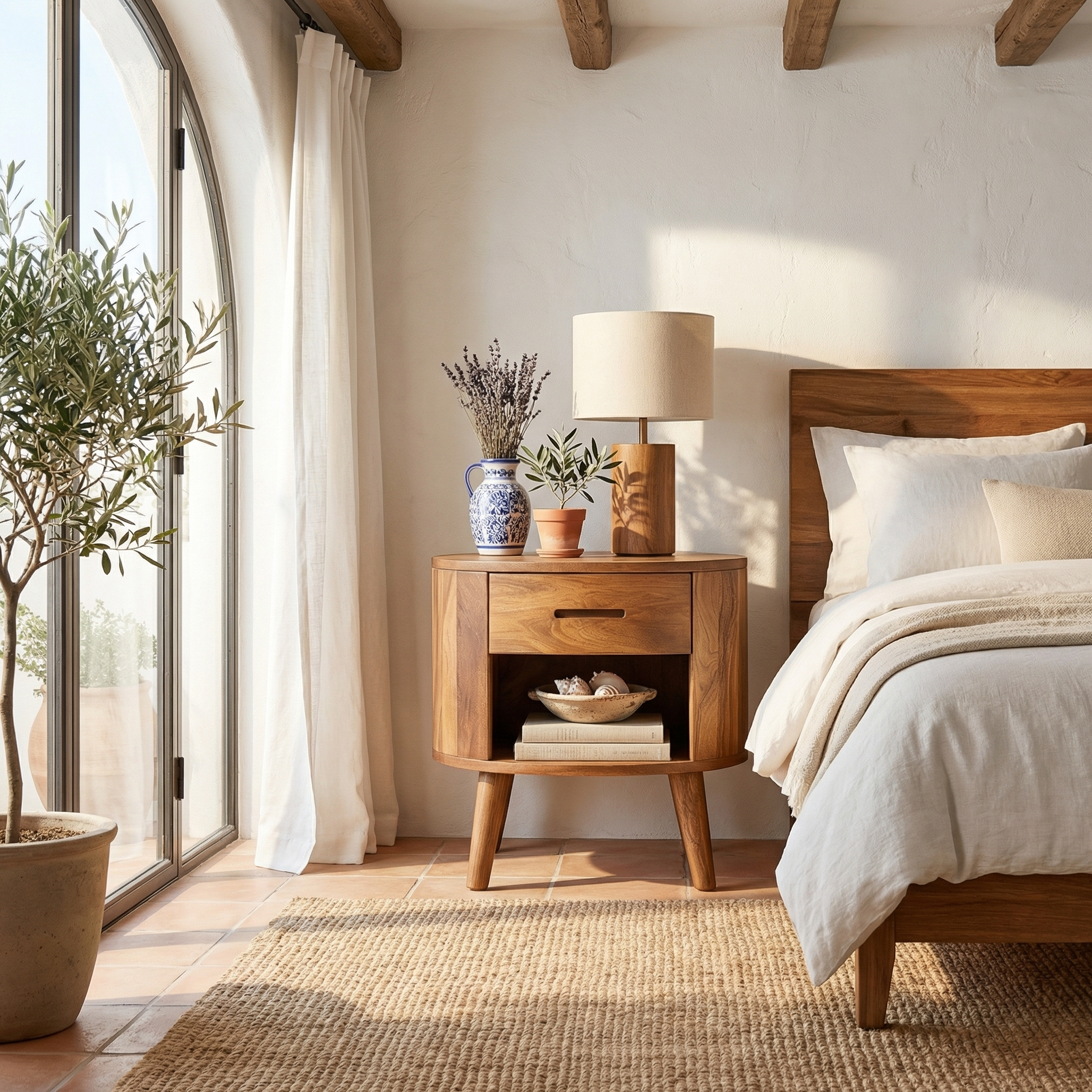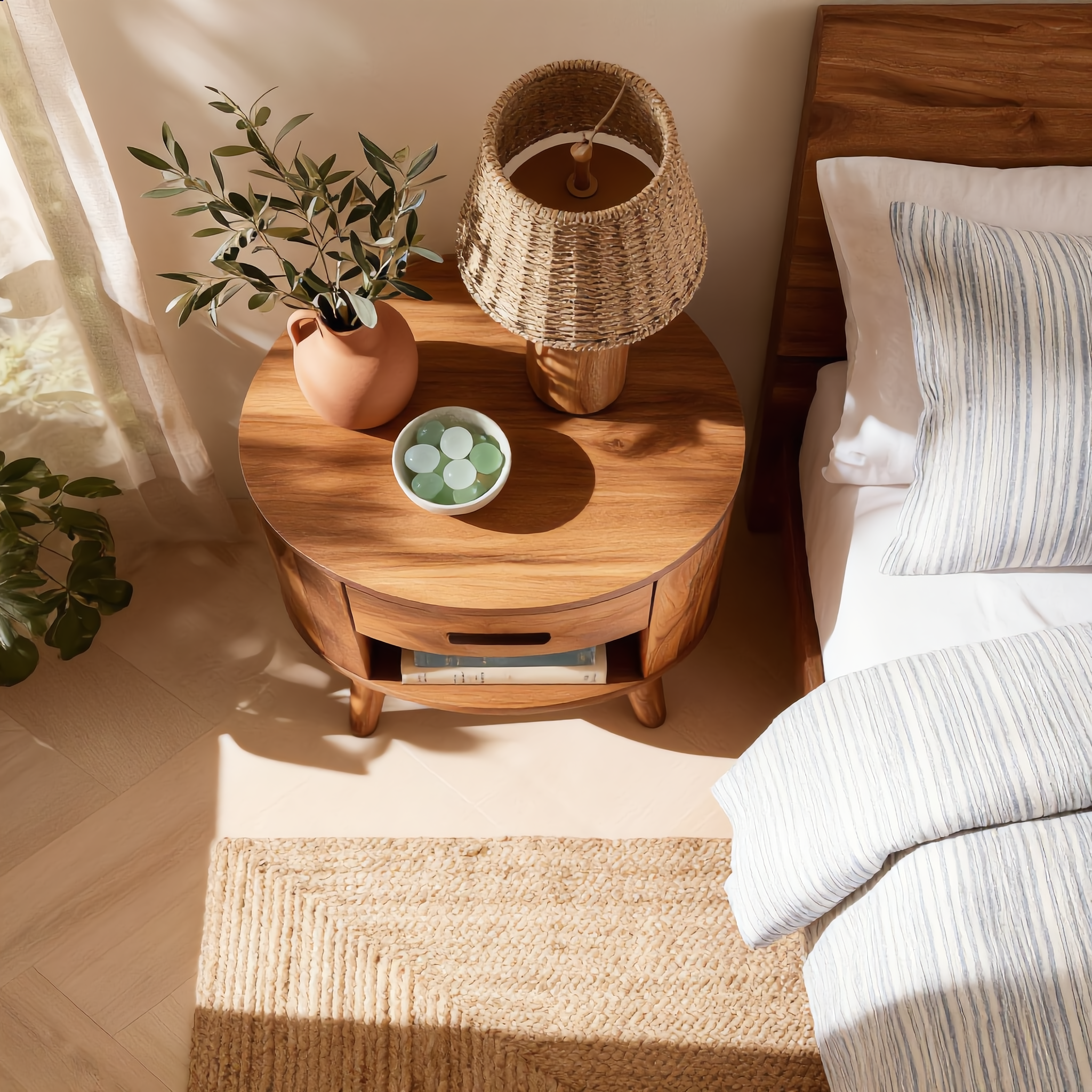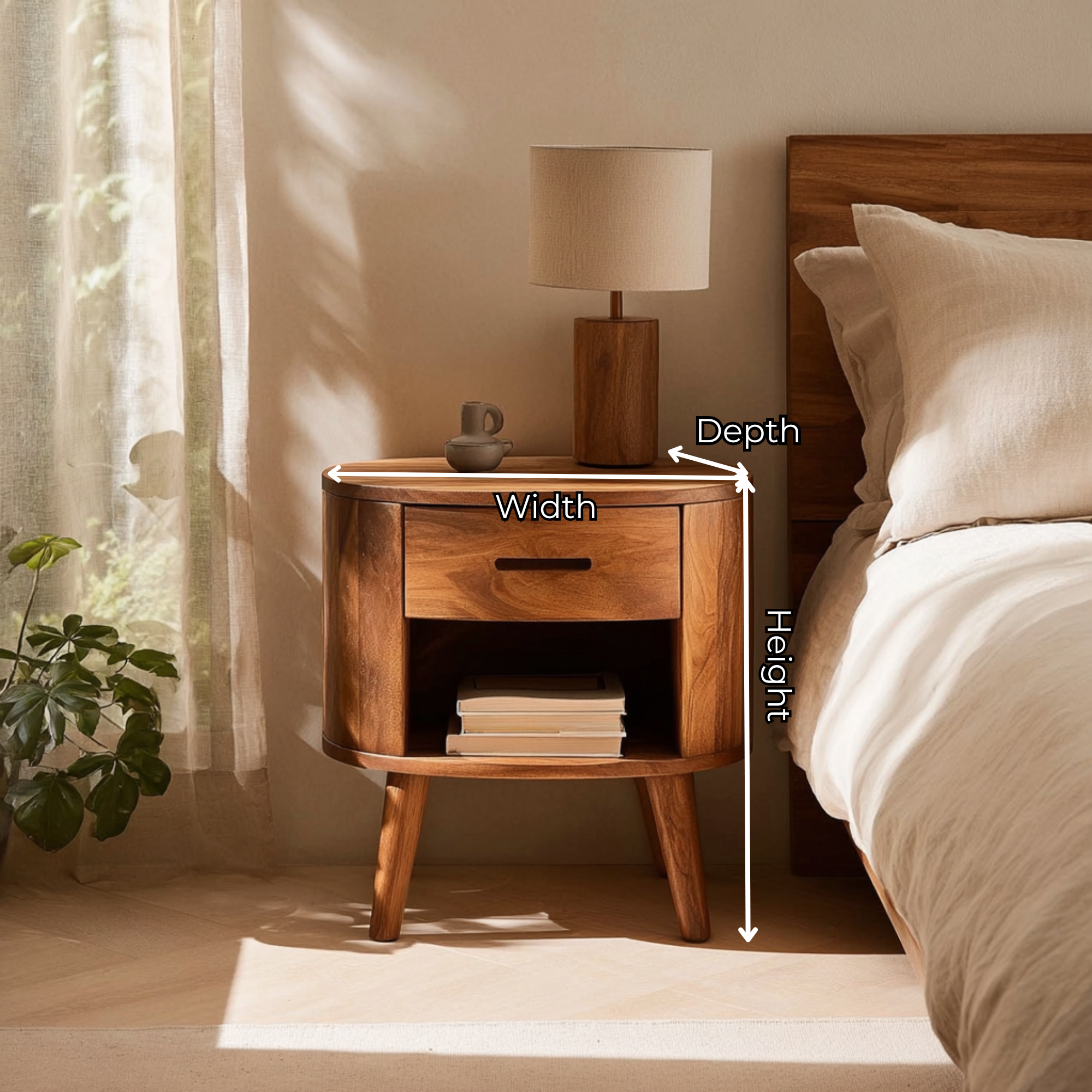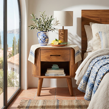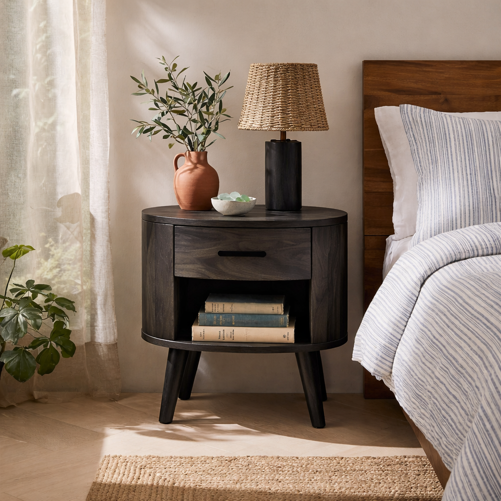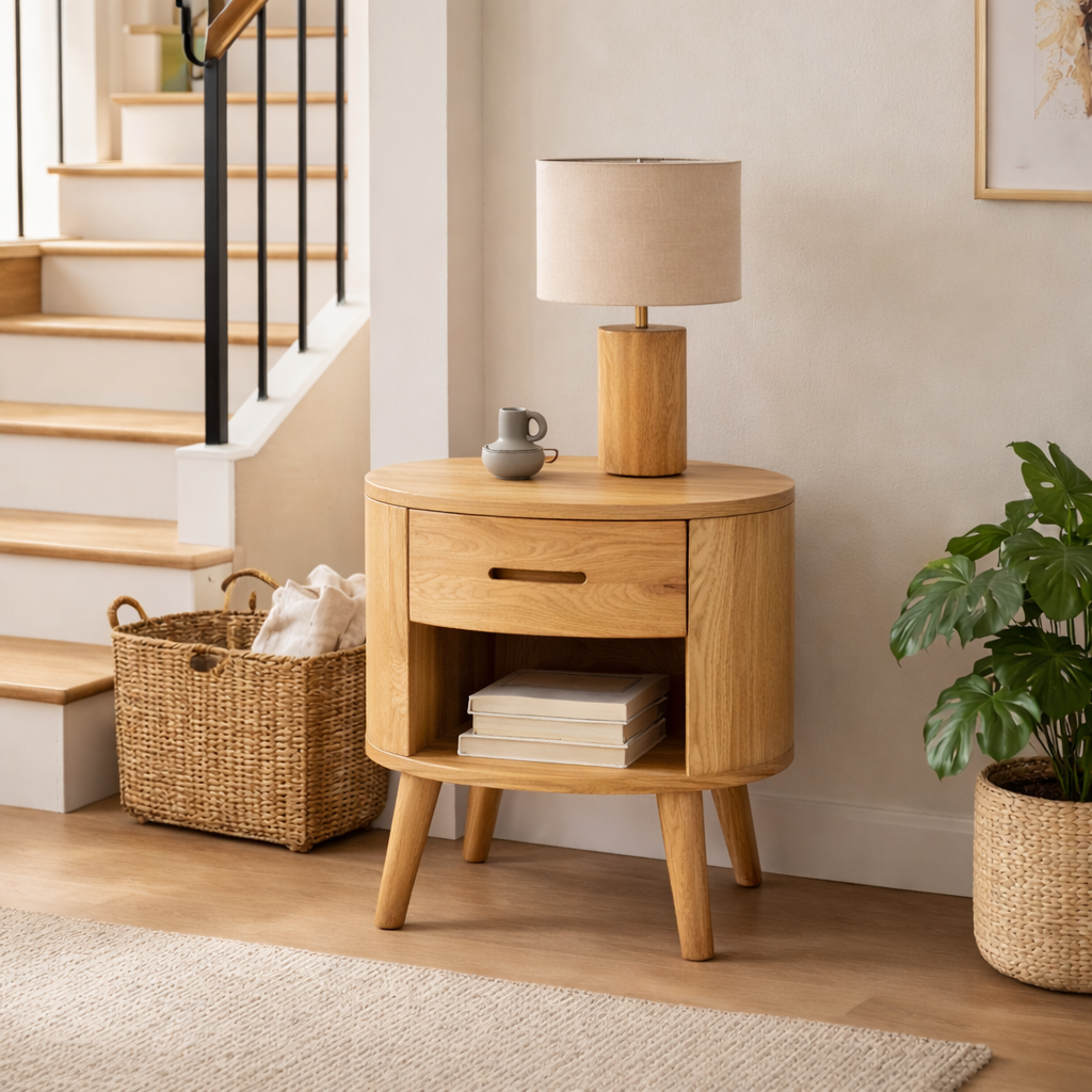 Create a soft and inviting bedside space with our Rounded Solid Wood Nightstand With Drawer And Open Shelf. Designed with smooth curved edges and a balanced silhouette, this piece brings warmth, simplicity, and everyday functionality into modern bedrooms. The combination of a discreet drawer and an open shelf allows for easy organization while maintaining a clean and refined aesthetic.