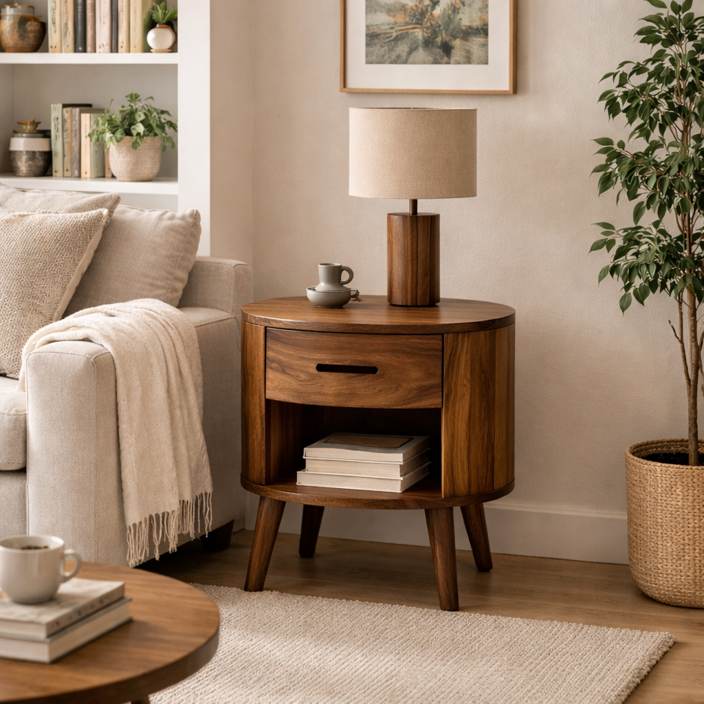 - Next to a sofa as a compact wood end table