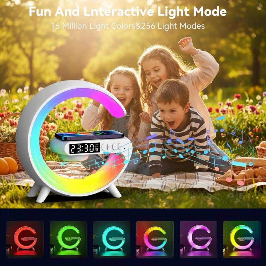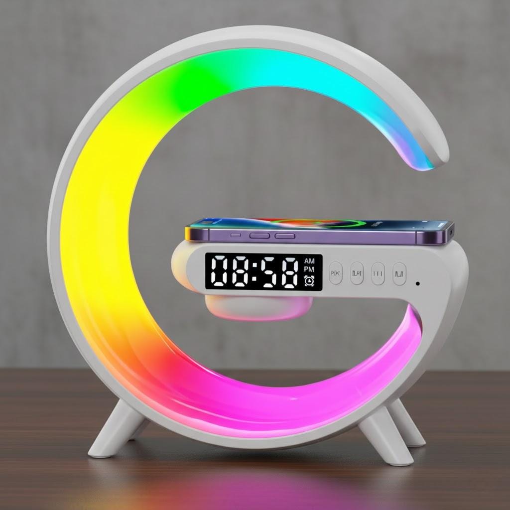 Upgrade your bedside routine with this modern all-in-one smart station that combines a sunrise alarm clock, RGB ambient light, wireless charger, and Bluetooth speaker. Designed to simplify your mornings and create a relaxing evening atmosphere, this multifunction device keeps your phone powered while adding stylish lighting and music to your space.