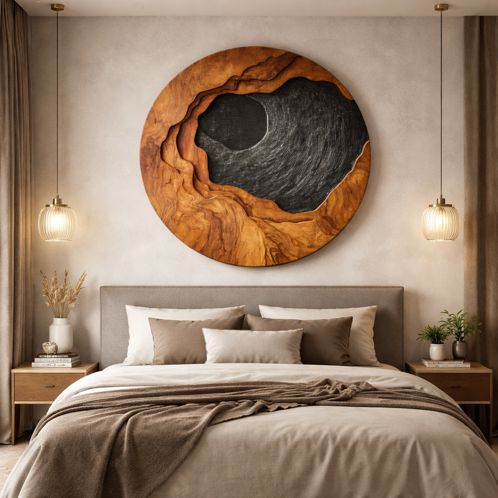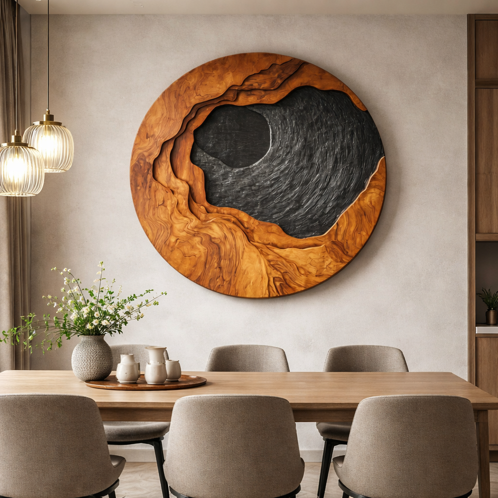 A carved solid wood wall art piece designed as a bold circular sculpture that brings depth, movement, and natural warmth into modern interiors. Crafted from thick natural wood, the layered carving creates a flowing landscape-like form, where organic textures meet smooth sculpted surfaces. The contrast between the rich wood grain and the dark textured center gives the piece a dramatic visual presence while keeping a calm and balanced composition.