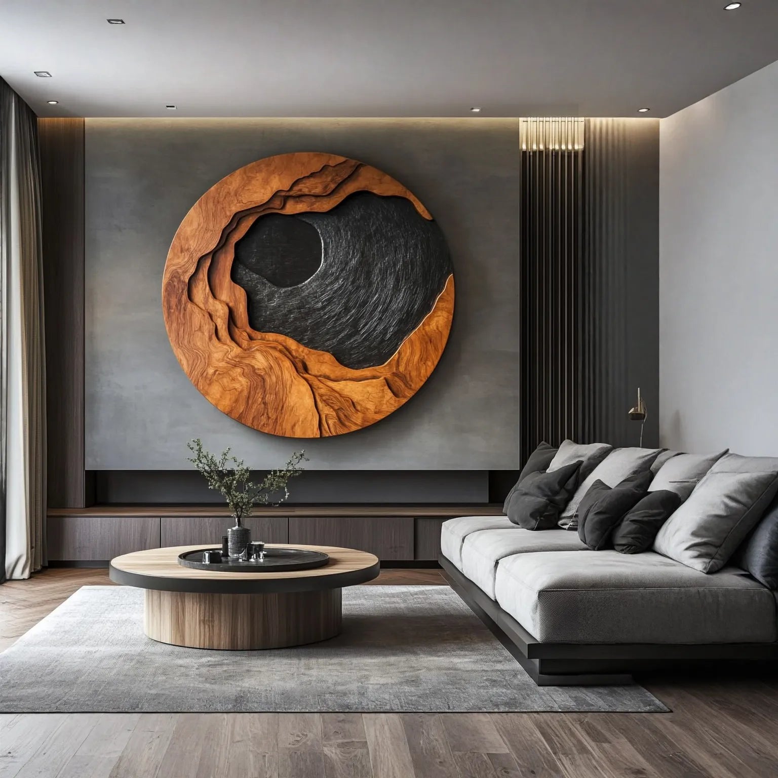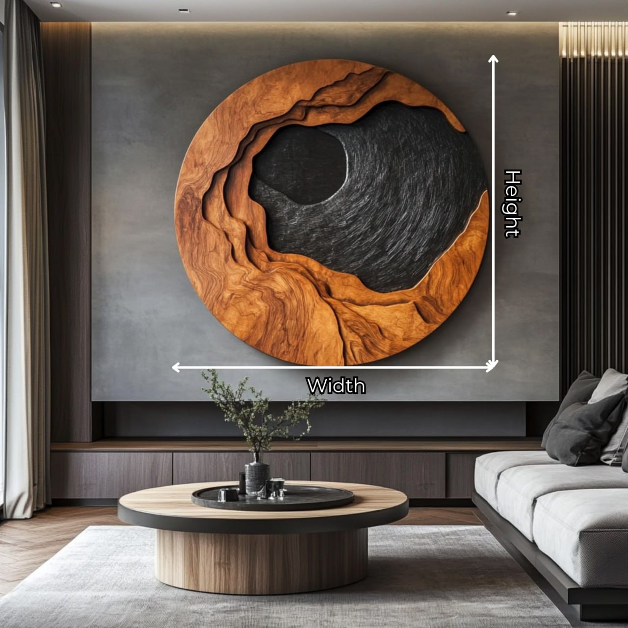 This round solid wood wall sculpture works beautifully as a statement piece in living rooms, entryways, offices, bedrooms, or gallery-style interiors. Its organic modern style pairs naturally with stone walls, neutral tones, minimalist furniture, and warm lighting. Whether placed above a sofa, console table, or bed, the piece creates a strong focal point while maintaining a refined and peaceful atmosphere.