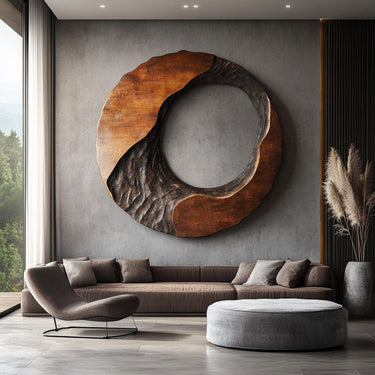 A large round wood wall decor piece handcrafted to bring sculptural depth and natural warmth into modern interiors. The circular form features an organically carved opening that flows through the surface, blending smooth polished wood with deeply textured areas to create a striking contrast. The natural grain patterns and layered carving give the sculpture a sense of movement, making it feel like a piece shaped by nature rather than manufactured.