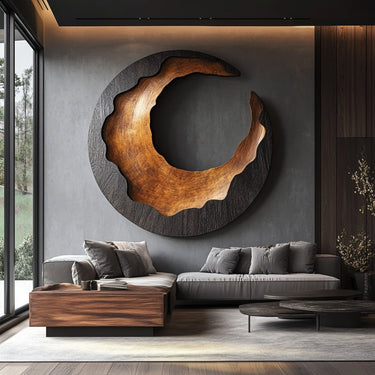 A sculptural solid wood wall art piece designed in a bold circular form, created to bring depth, warmth, and artistic presence to modern interiors. Handcrafted from natural wood, the layered design features a flowing organic cutout that creates movement within the circle, giving the sculpture a sense of balance and harmony. The contrast between the warm natural wood tones and the darker textured background adds dimension, making the piece stand out as a refined focal point.