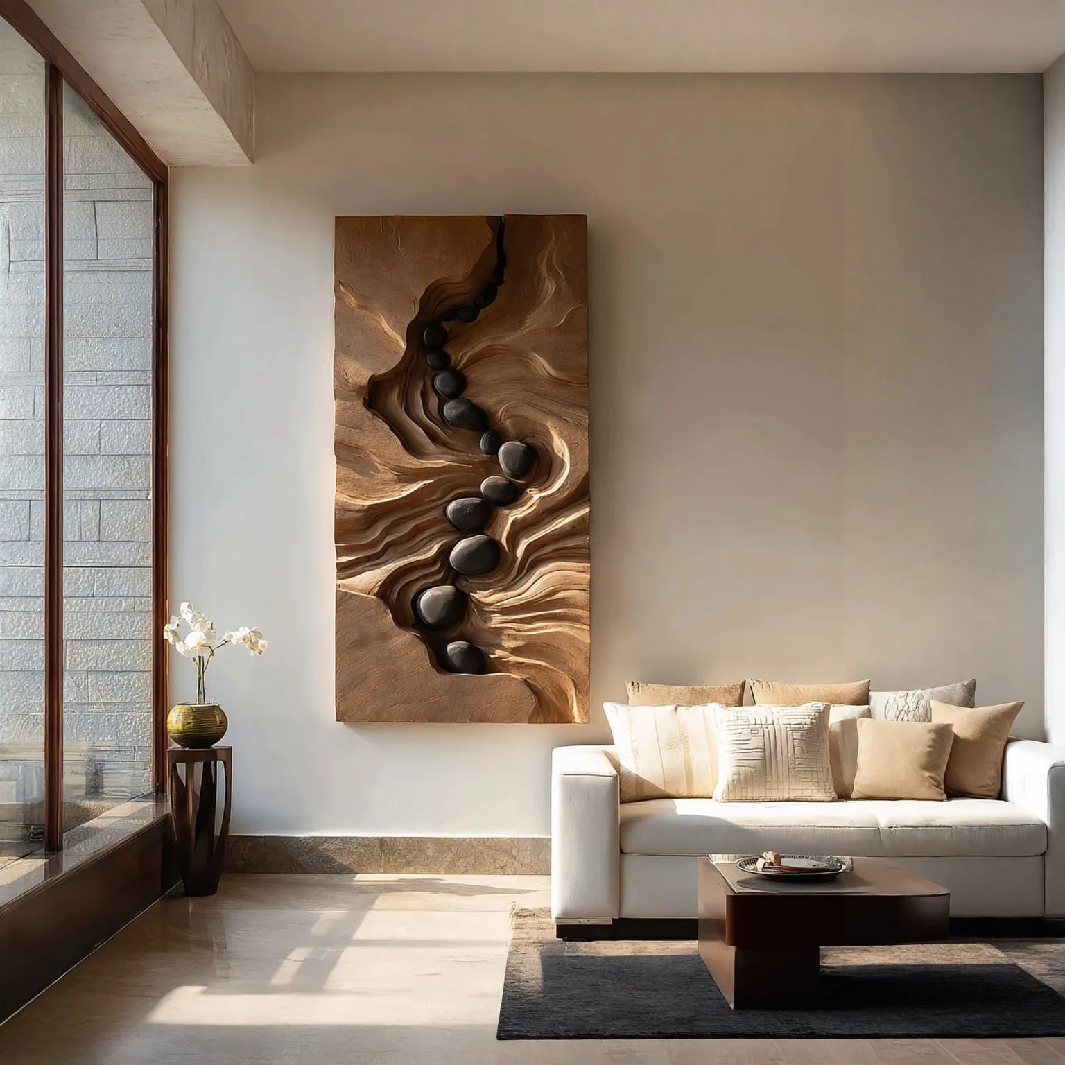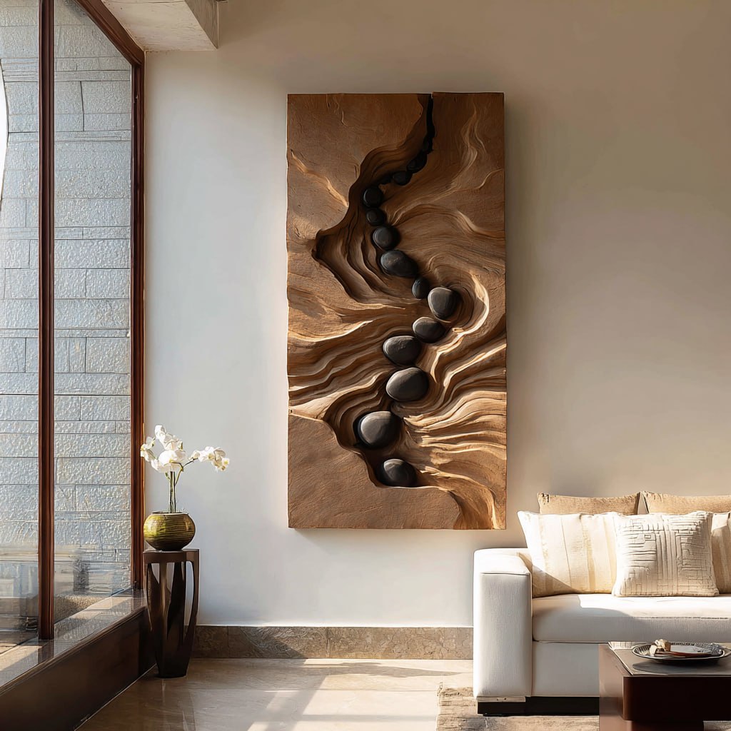 The panel features flowing carved contours that move across the surface like eroded terrain, with rounded raised forms that suggest a path of smooth river stones. Crafted in natural wood, the piece reveals layered grain movement, soft tonal variation, and a hand-finished surface that enhances its tactile appeal. The contrast between the sculpted ridges, recessed channels, and darker rounded accents gives the artwork a strong sense of dimension, allowing light and shadow to shift beautifully throughout the day.