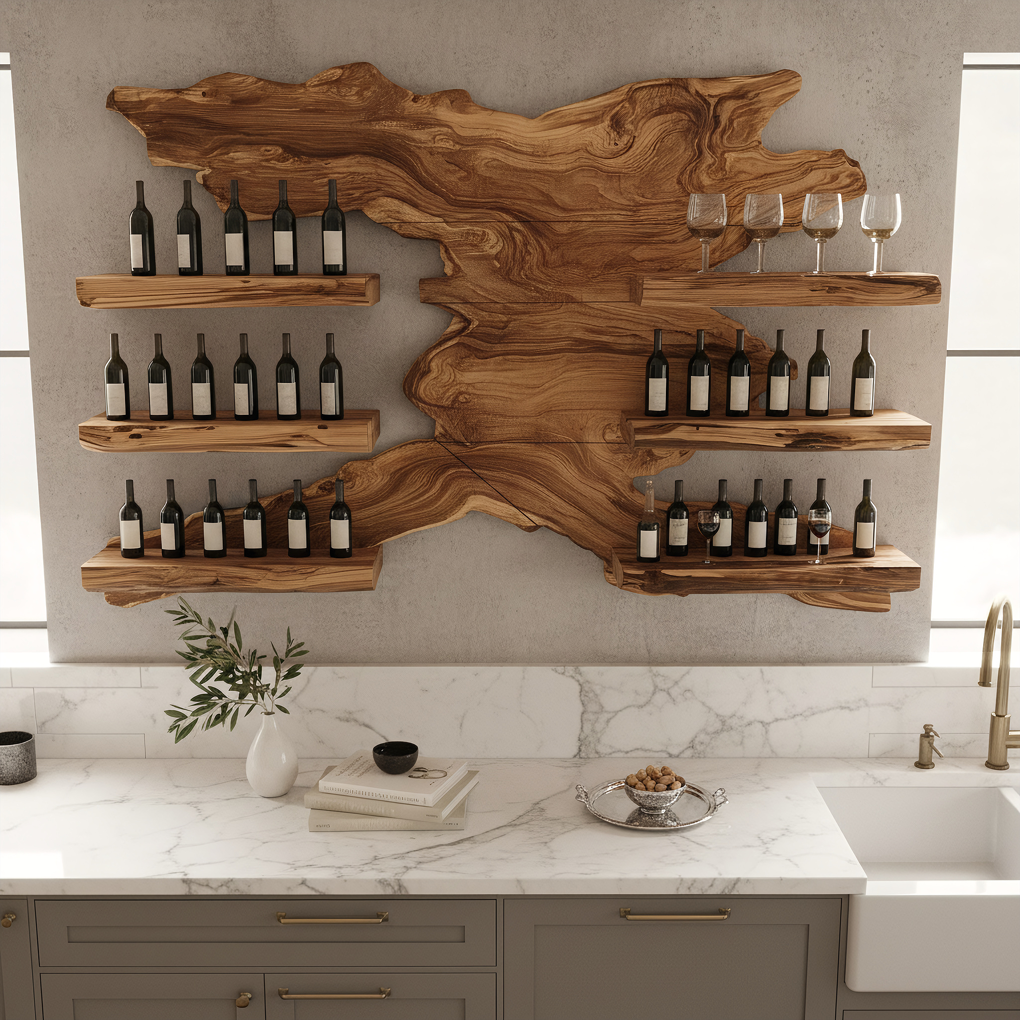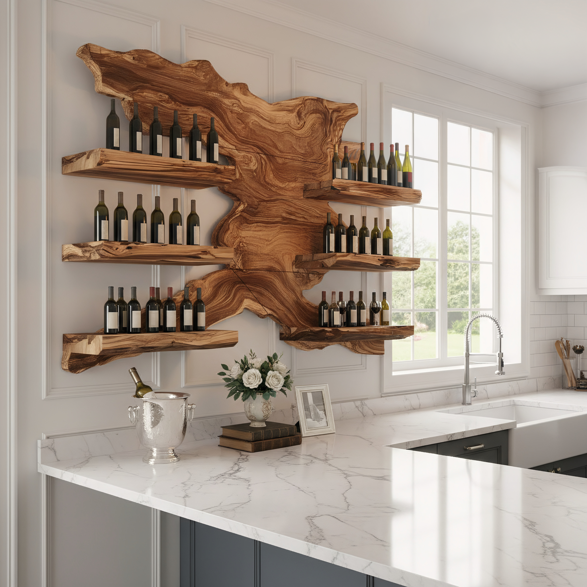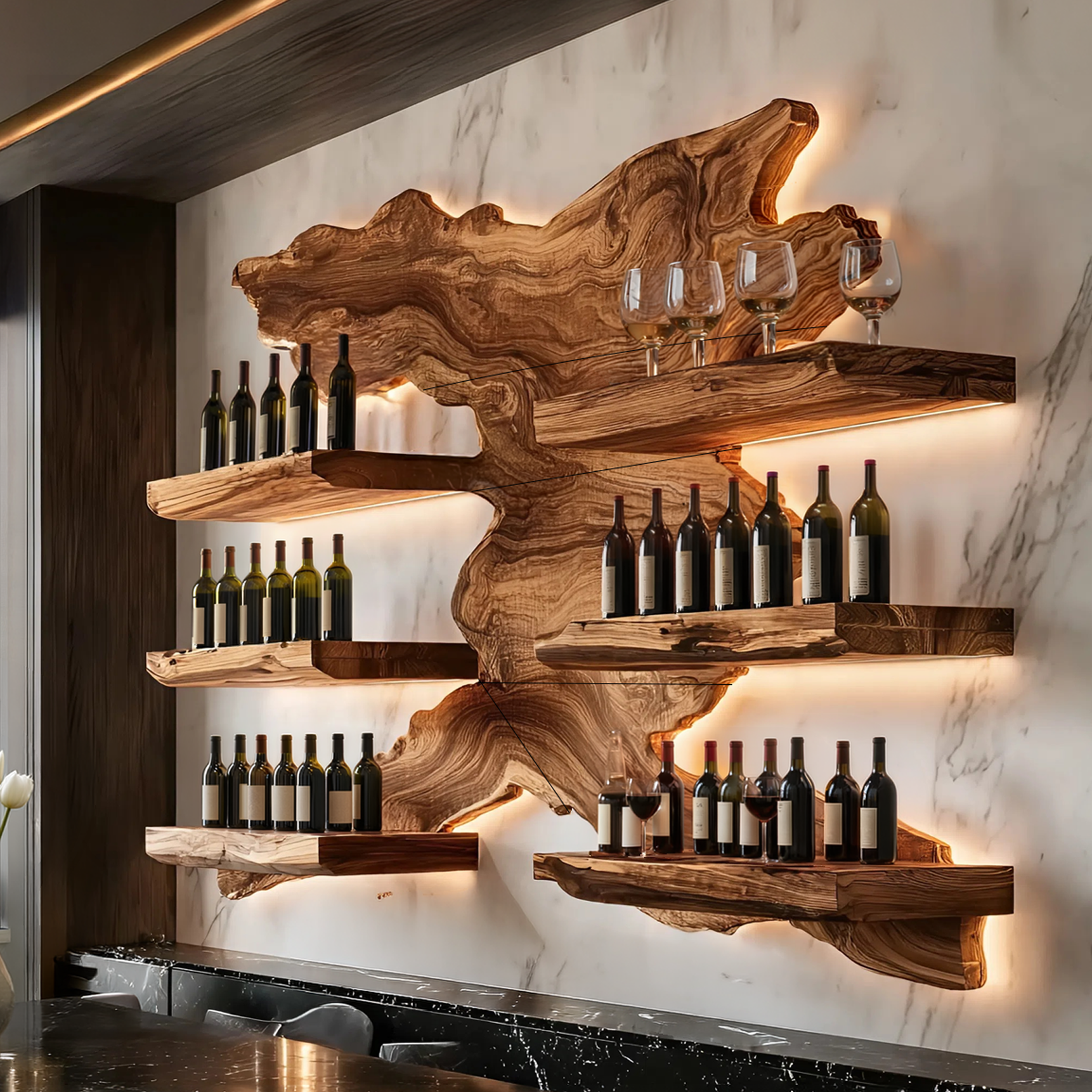 Create a stunning focal point in your home interior with this large, solid wood wine rack, designed as a unique wall-mounted bar counter, blending natural beauty with modern lighting. Crafted from a single large piece of wood, the design retains the organic lines, impressive wood grain, and natural texture, making each piece truly one-of-a-kind.