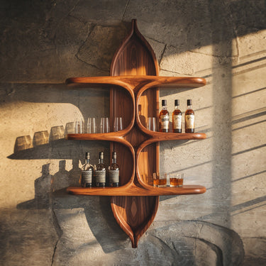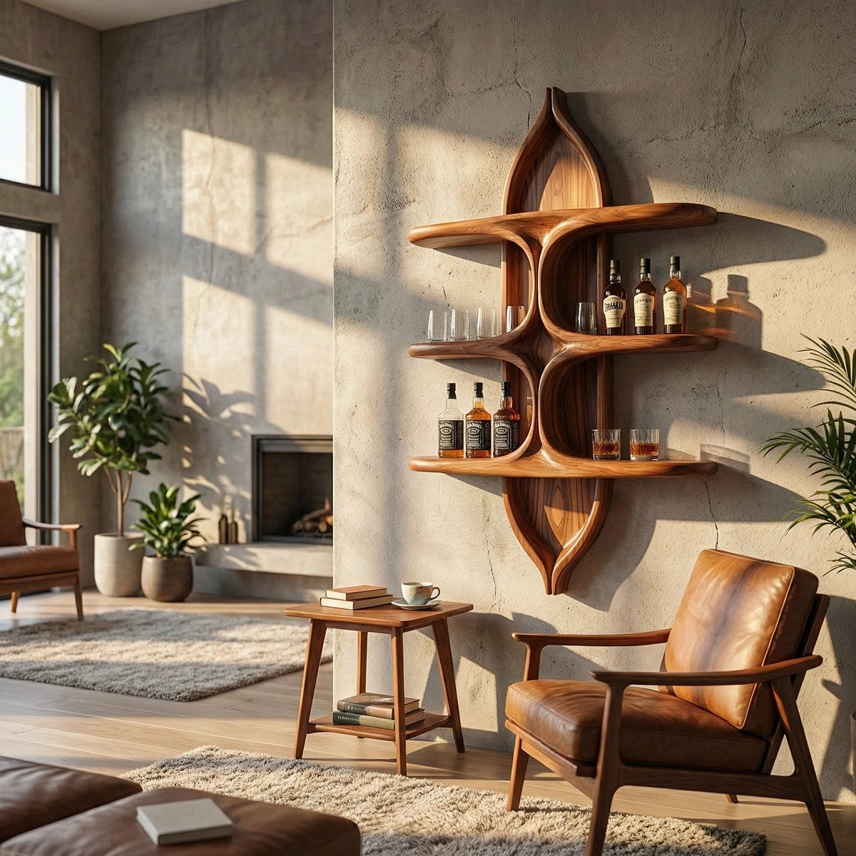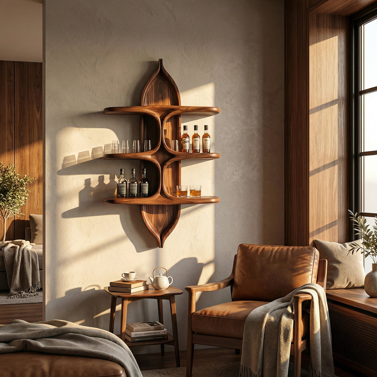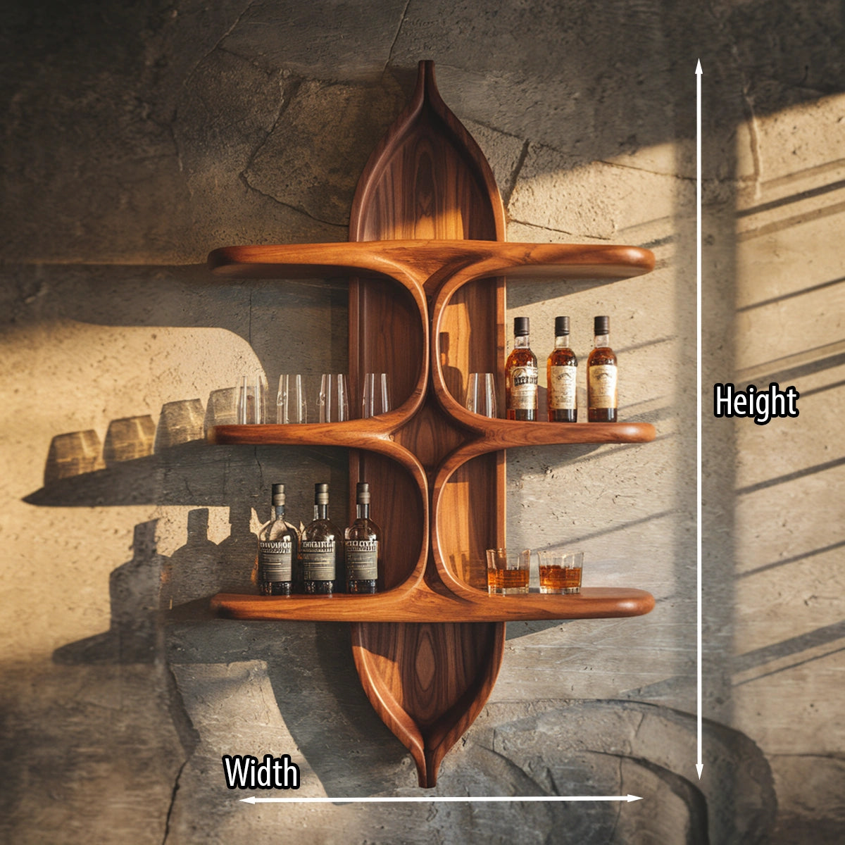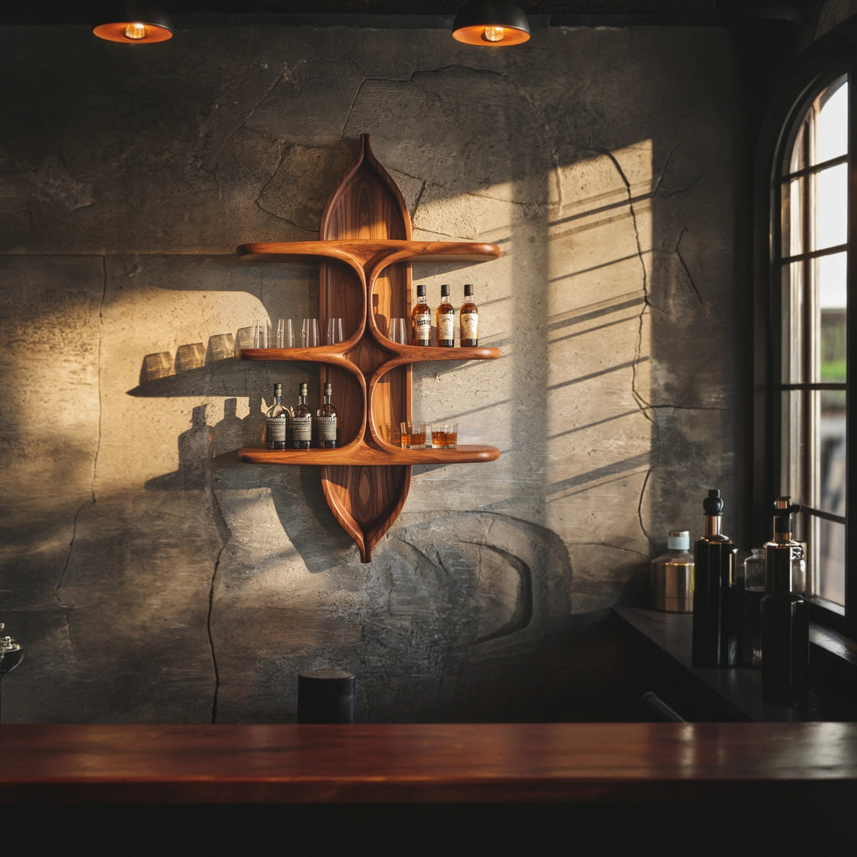 The Mid-Century Sculptural Solid Wood Wall Shelf for Whiskey & Bar Display brings together balanced form, natural warmth, and practical display storage in one refined wall-mounted piece. Inspired by mid-century design and shaped with a flowing sculptural silhouette, this shelf transforms everyday bar storage into a striking focal point. Its symmetrical composition and curved tiers make it a beautiful addition to home bars, living rooms, or curated entertaining spaces.
