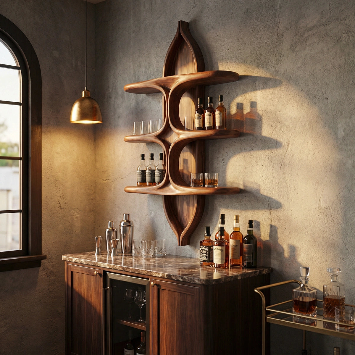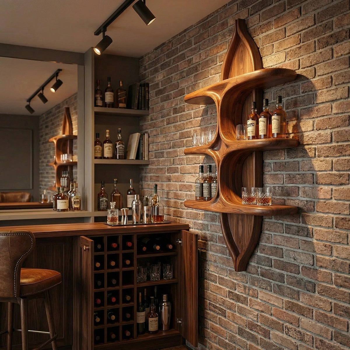 - Wall-mounted storage for bottles, glasses, or bar essentials