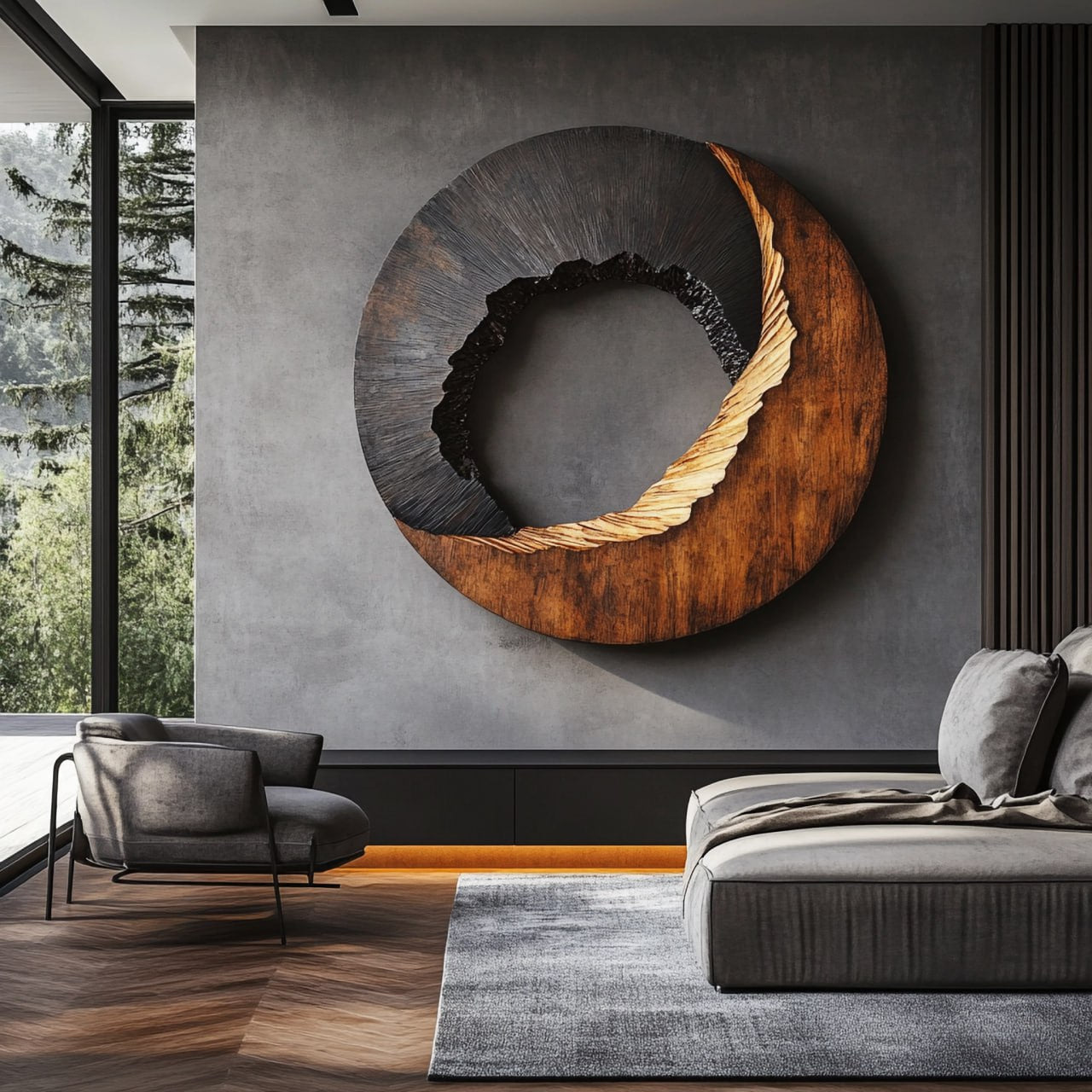 An abstract round wood wall sculpture designed to combine natural texture with modern sculptural form. Handcrafted from solid natural wood, the circular design features a carved open center surrounded by contrasting layers of smooth grain, rough texture, and darkened finish. The flowing organic lines create a sense of motion, giving the piece a dynamic presence while still maintaining balance and harmony.