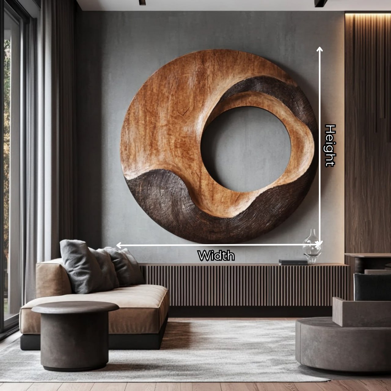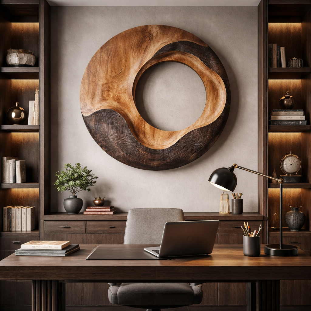 An abstract round wood wall sculpture designed to bring sculptural depth and natural warmth into modern interiors. Handcrafted from solid natural wood, the circular form features a flowing carved opening at the center, creating a sense of movement and balance. The contrast between smooth polished areas and textured carved surfaces gives the piece a dynamic, organic character that changes with light and perspective.