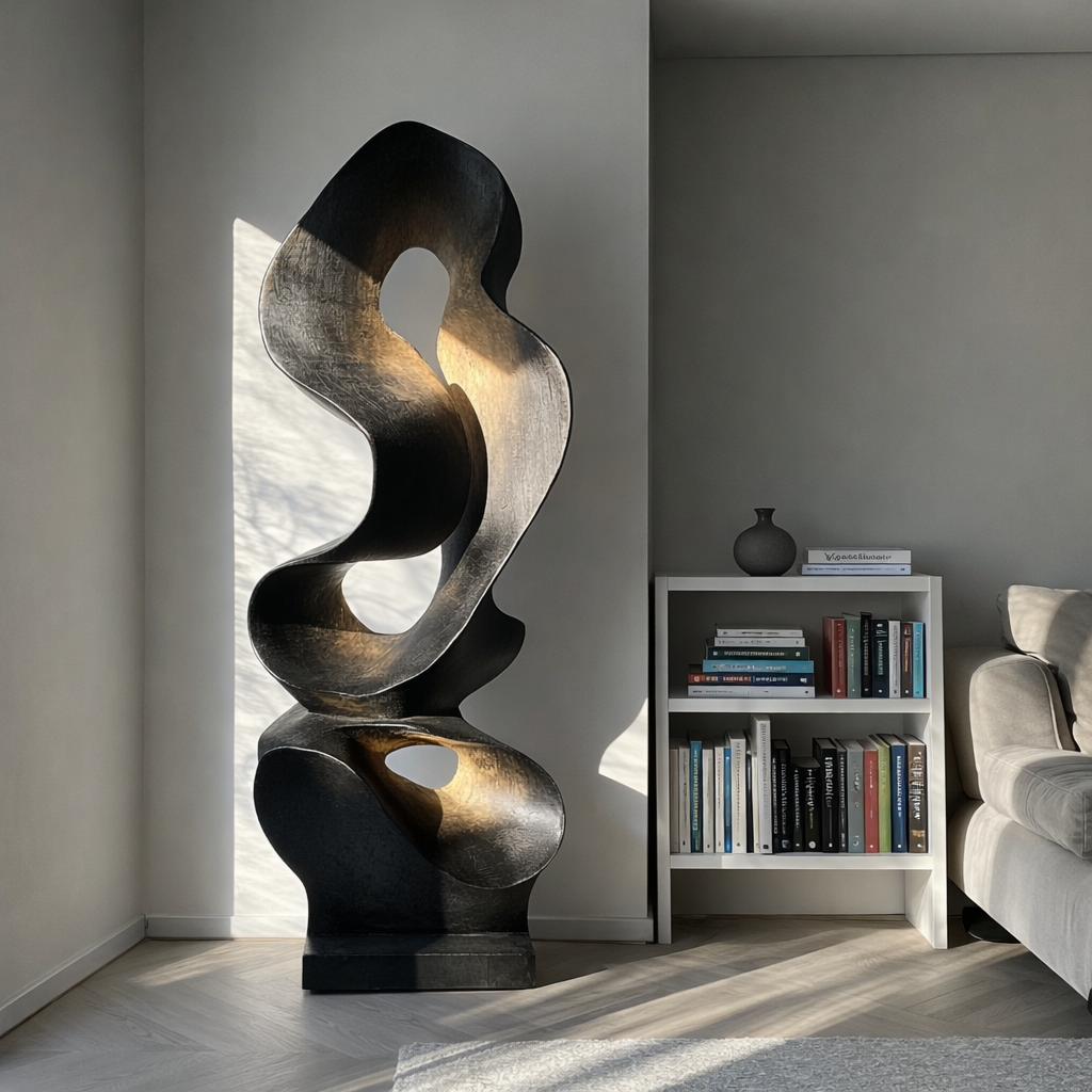 A bold expression of movement and balance, this abstract solid wood sculpture is designed to bring artistic depth to modern living spaces. The flowing, open form creates a dynamic silhouette that shifts with light and shadow, giving the piece a constantly changing presence throughout the day. Its sculptural shape blends organic curves with contemporary design, making it a striking focal point in refined interiors.