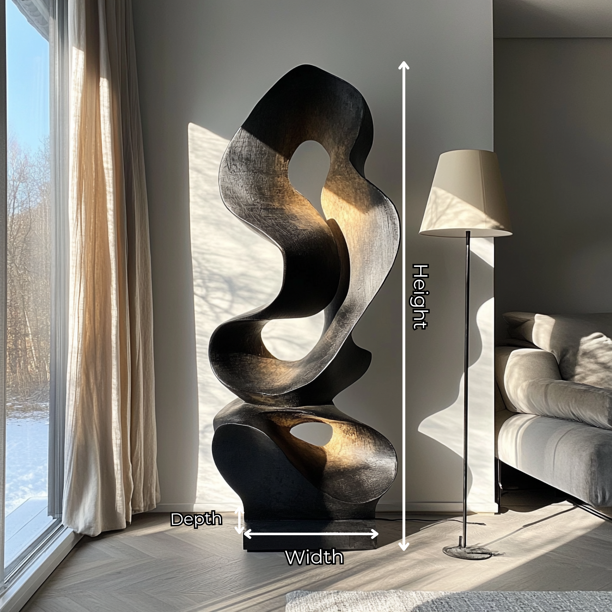Ideal for living rooms, entryways, offices, hotel lobbies, or gallery spaces, this organic modern wood sculpture works beautifully as a floor statement piece placed near a wall, console, or seating area. Its sculptural form interacts with surrounding light, creating shadows that enhance the architectural feel of the space.
