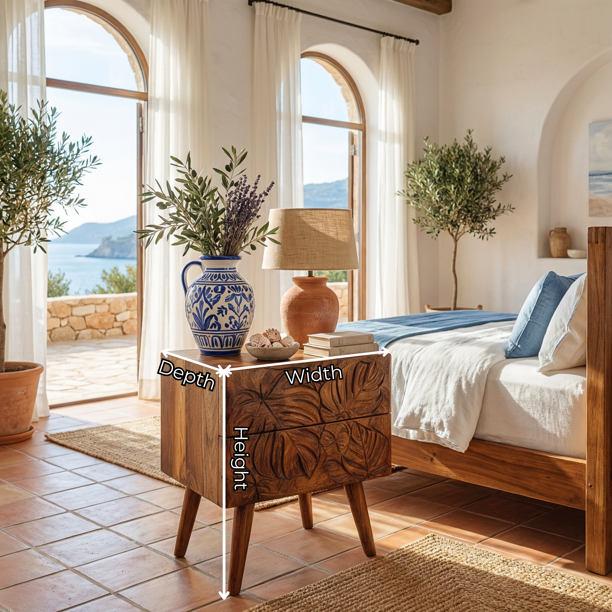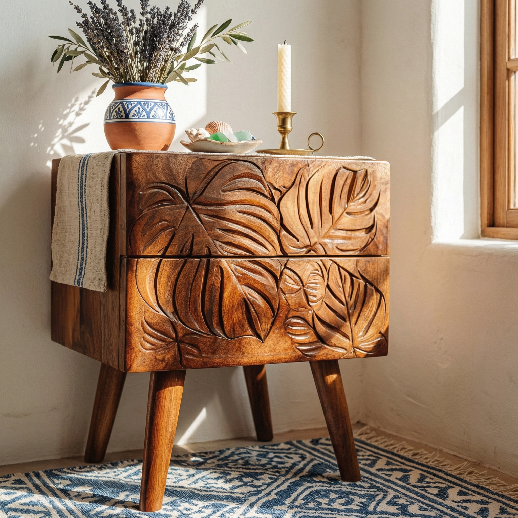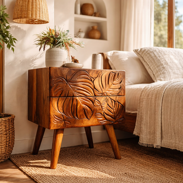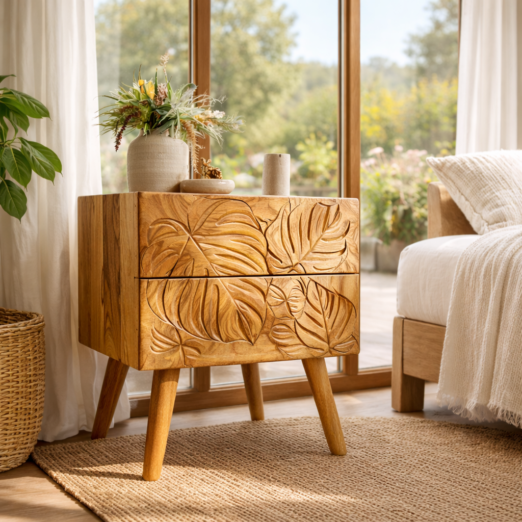 Bring organic elegance and artisanal detail into your bedroom with our Botanical Carved Solid Wood Nightstand With Double Drawers. Featuring intricately carved leaf patterns across the drawer fronts, this piece transforms functional storage into a refined design statement. The rich wood grain and sculptural surface create depth, warmth, and a naturally inspired aesthetic that complements modern and organic interiors.