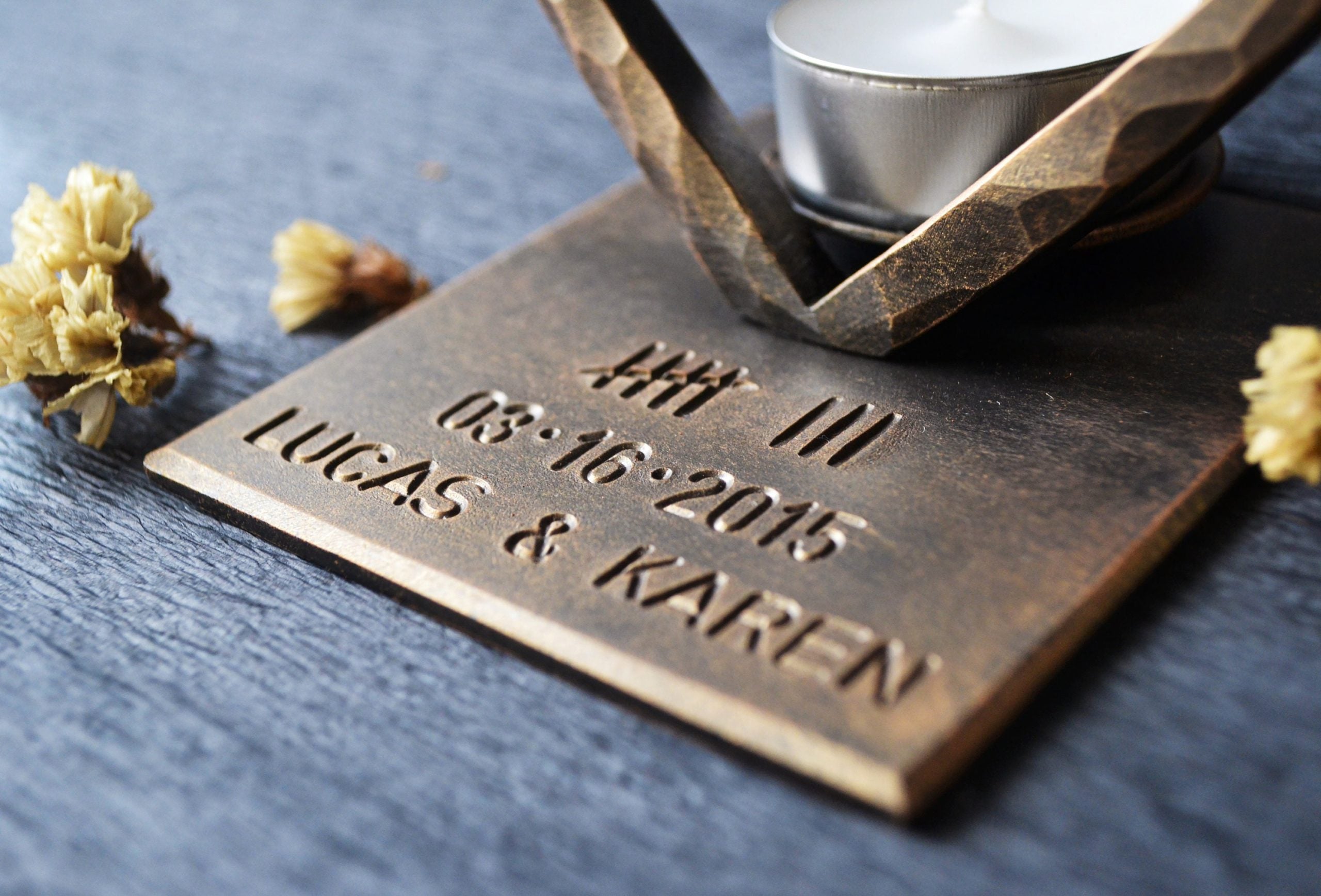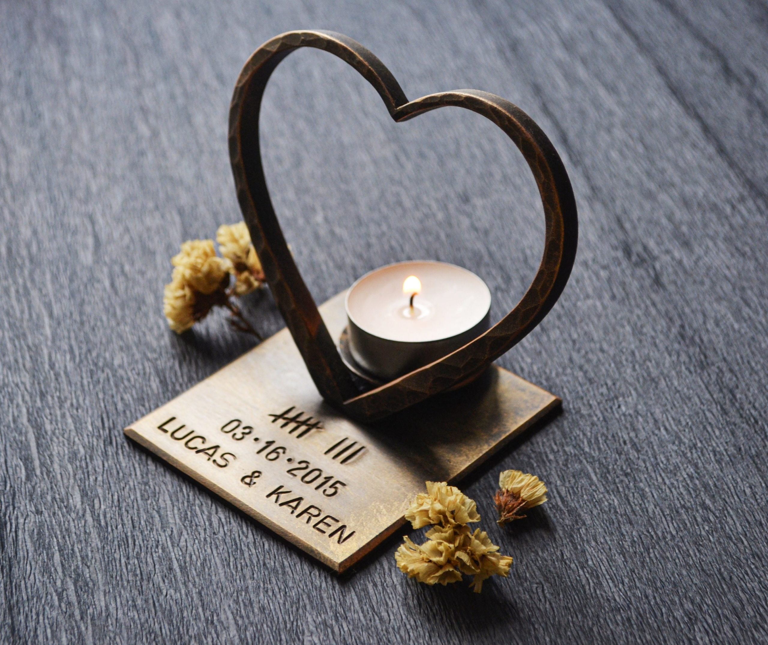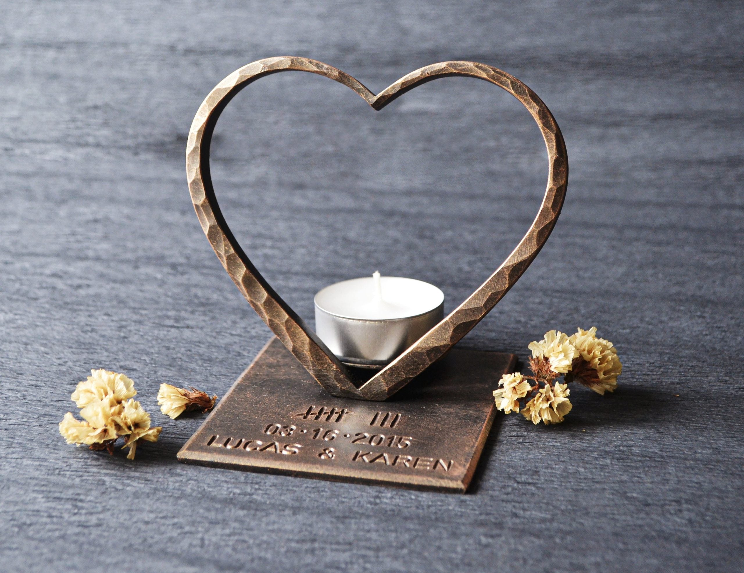 Handmade from iron and finished with a warm bronze patina, this personalized candle holder is crafted with care and attention to detail. Its elegant heart design symbolizes lasting love, making it a perfect gift for your partner on your 8th wedding anniversary.