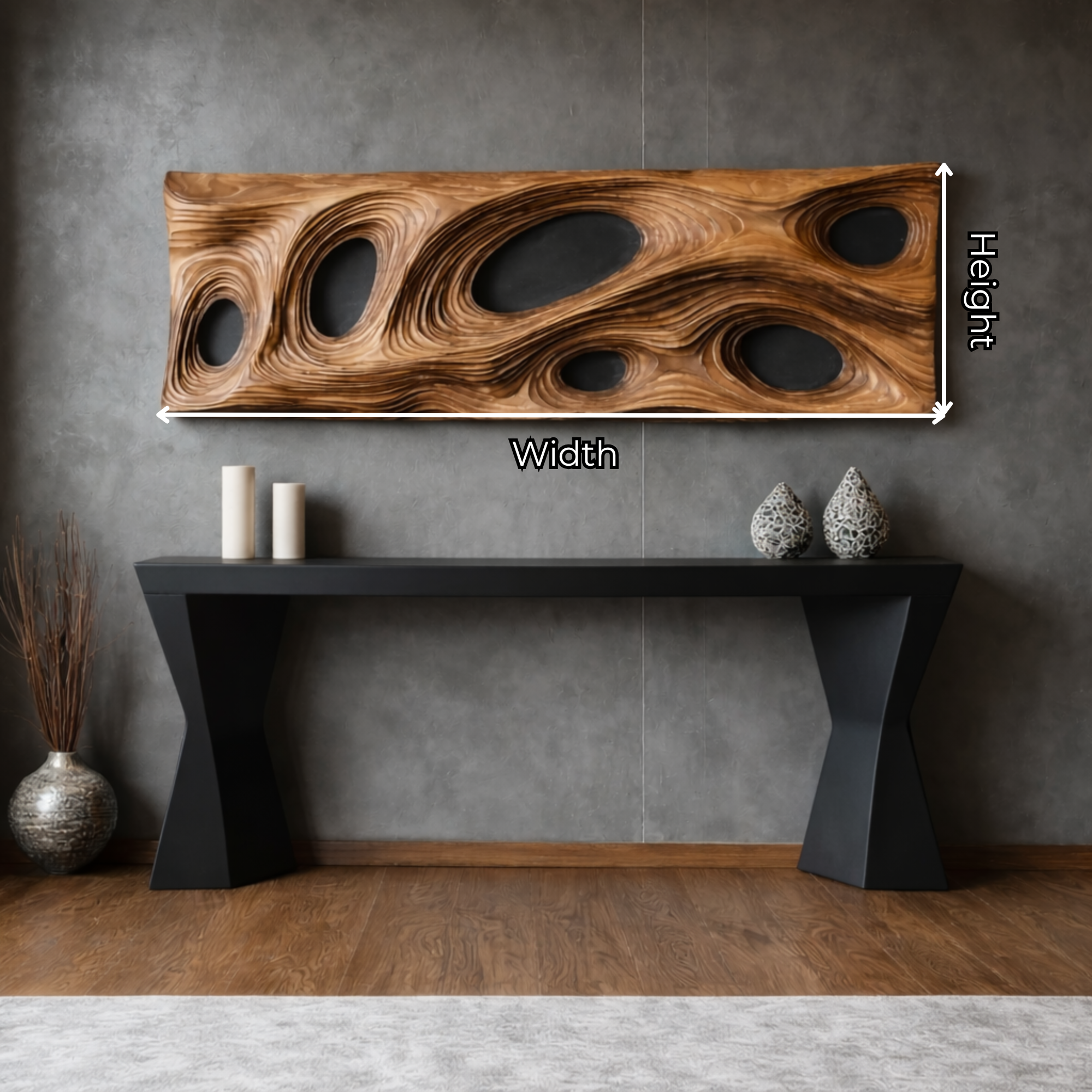 Designed with layered contours and smooth transitions, this wall sculpture highlights a fluid visual movement that draws the eye across its full length. The carved openings and softly shaped edges create a balanced composition that feels both expressive and grounded. Its sculptural depth adds dimension and shadow, allowing the piece to function as more than wall decor, becoming an artistic feature that brings structure and flow into the surrounding space.