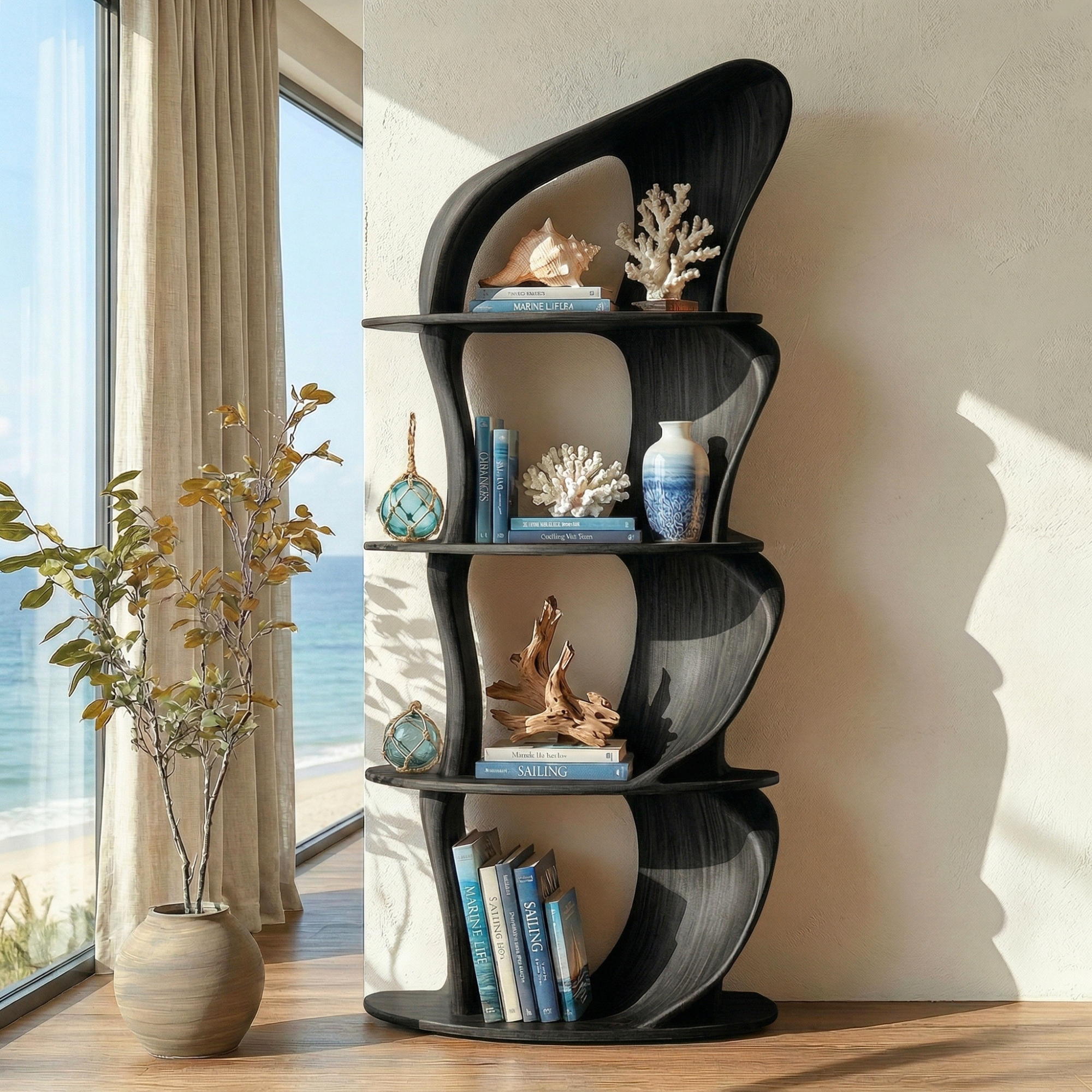 This bookshelf features a softly curved vertical structure that connects each shelf into a continuous, sculptural silhouette. The open compartments are thoughtfully arranged to balance form and function, allowing for both display and storage without visual heaviness. Its organic shape adds fluidity and elegance, making it ideal for contemporary, coastal, or nature-inspired spaces.