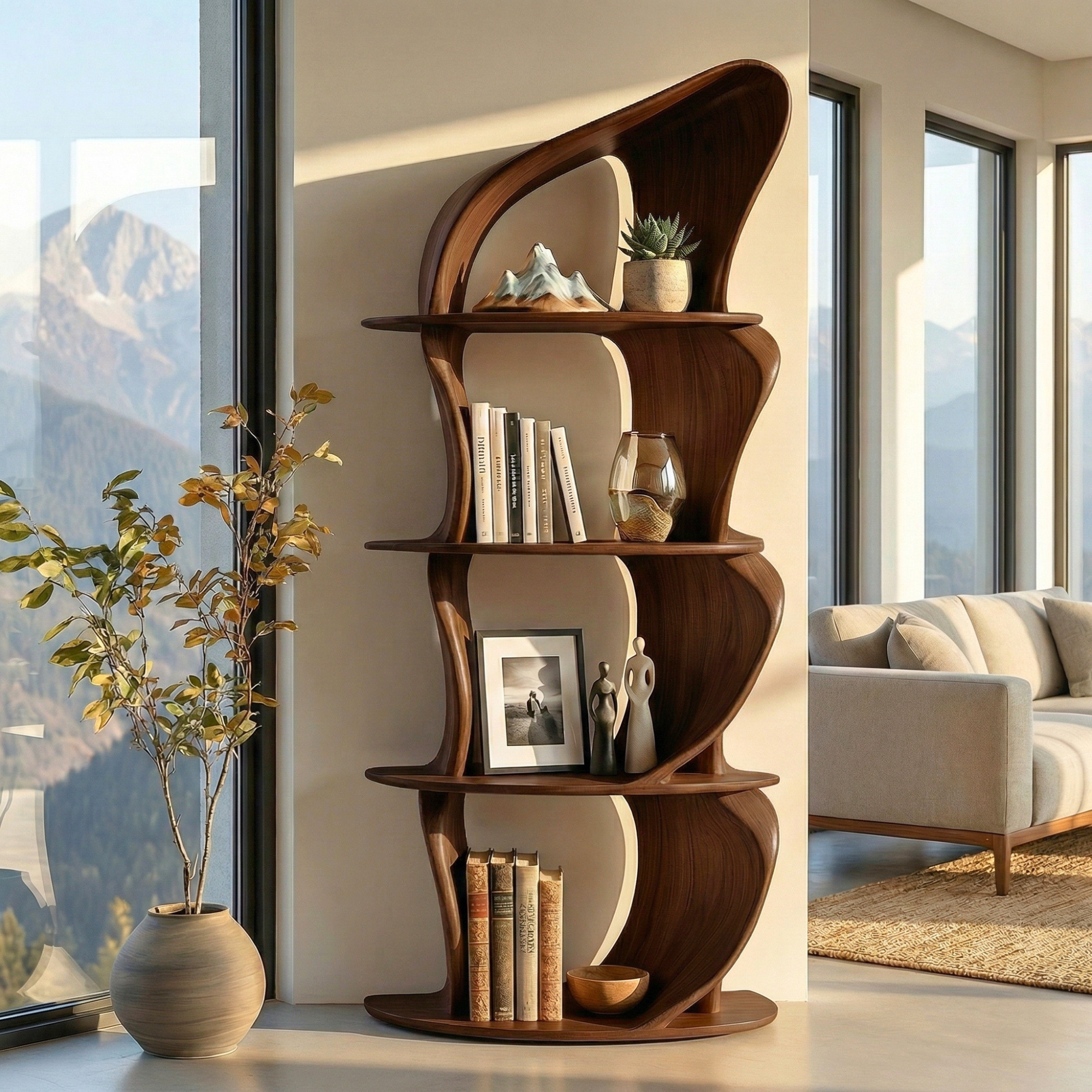 Curved Solid Wood Display Bookshelf With Sculptural Open Shelves