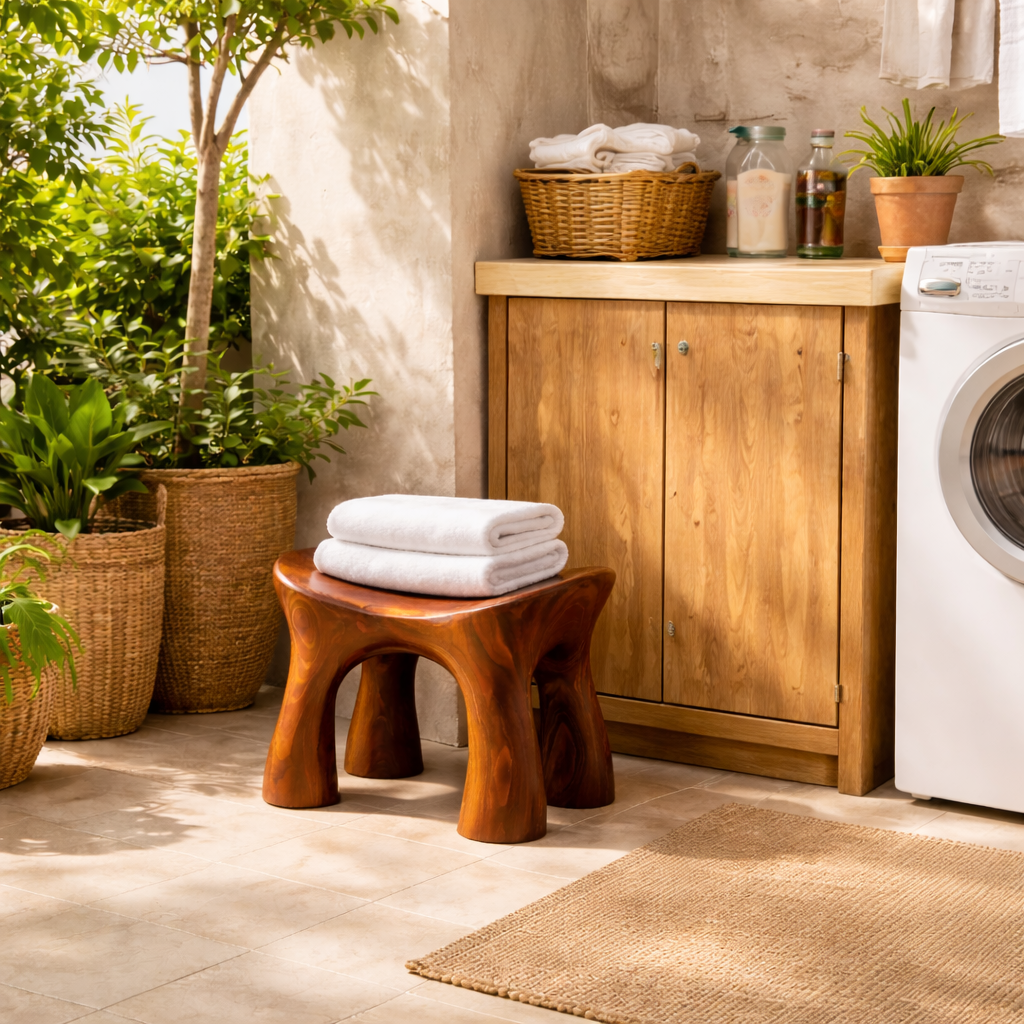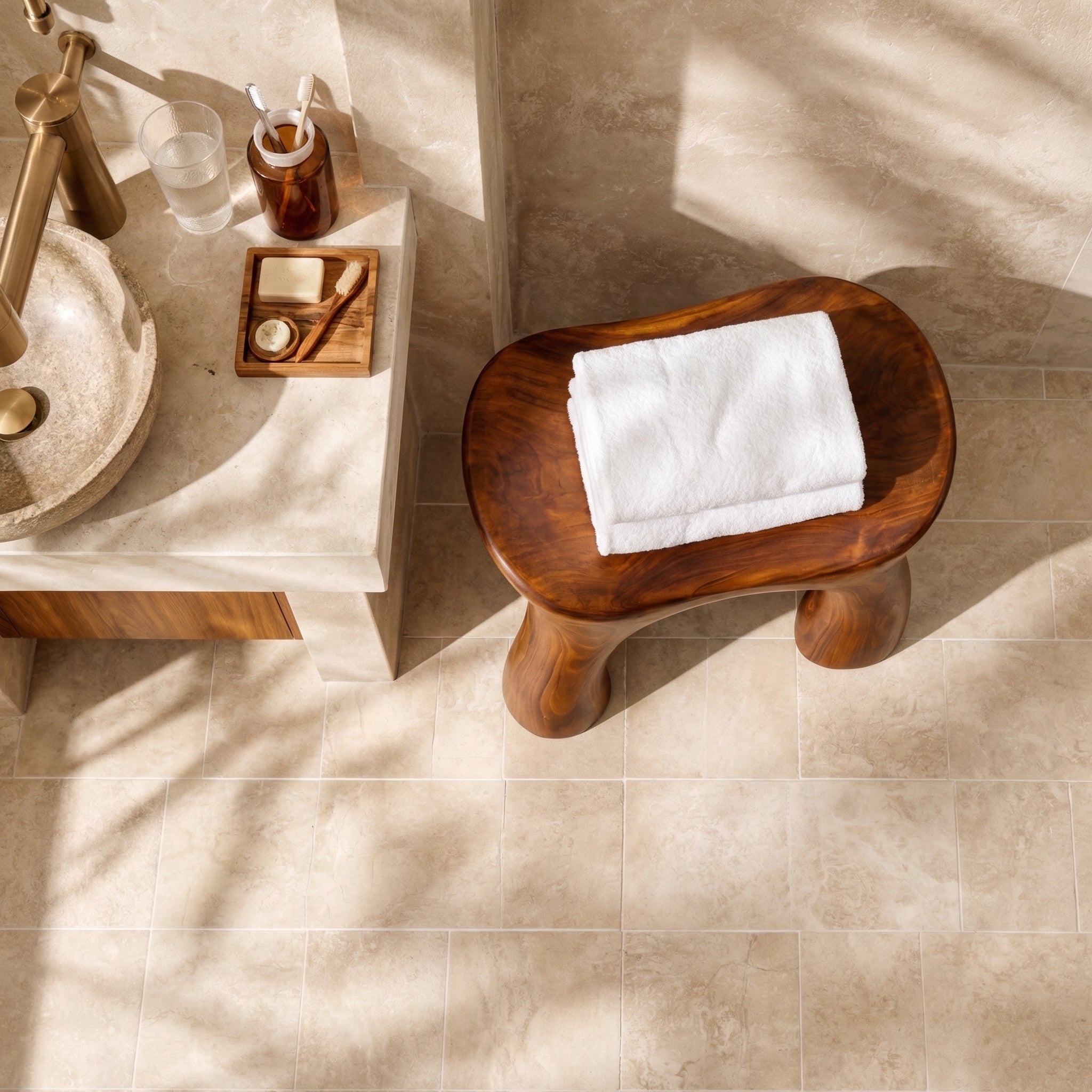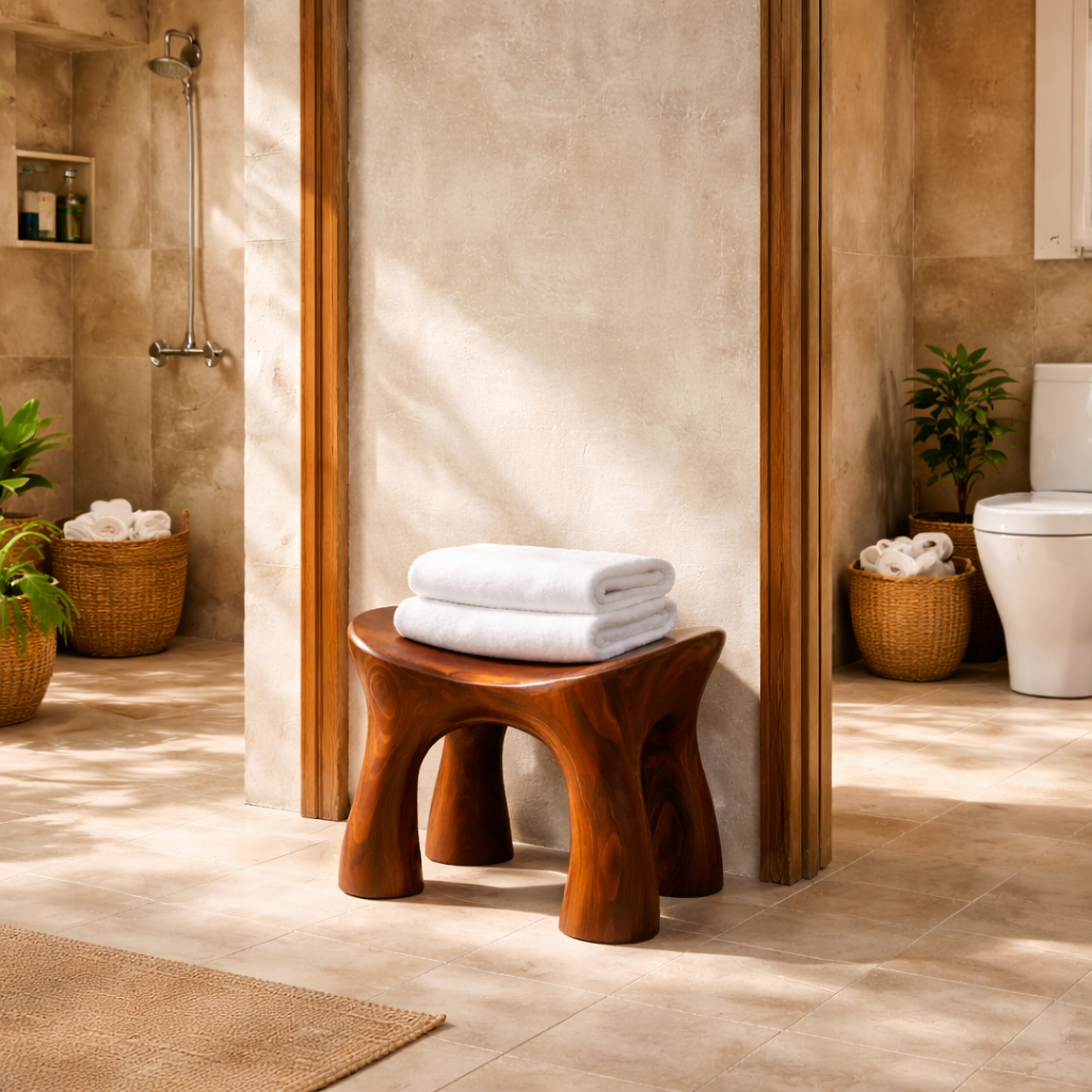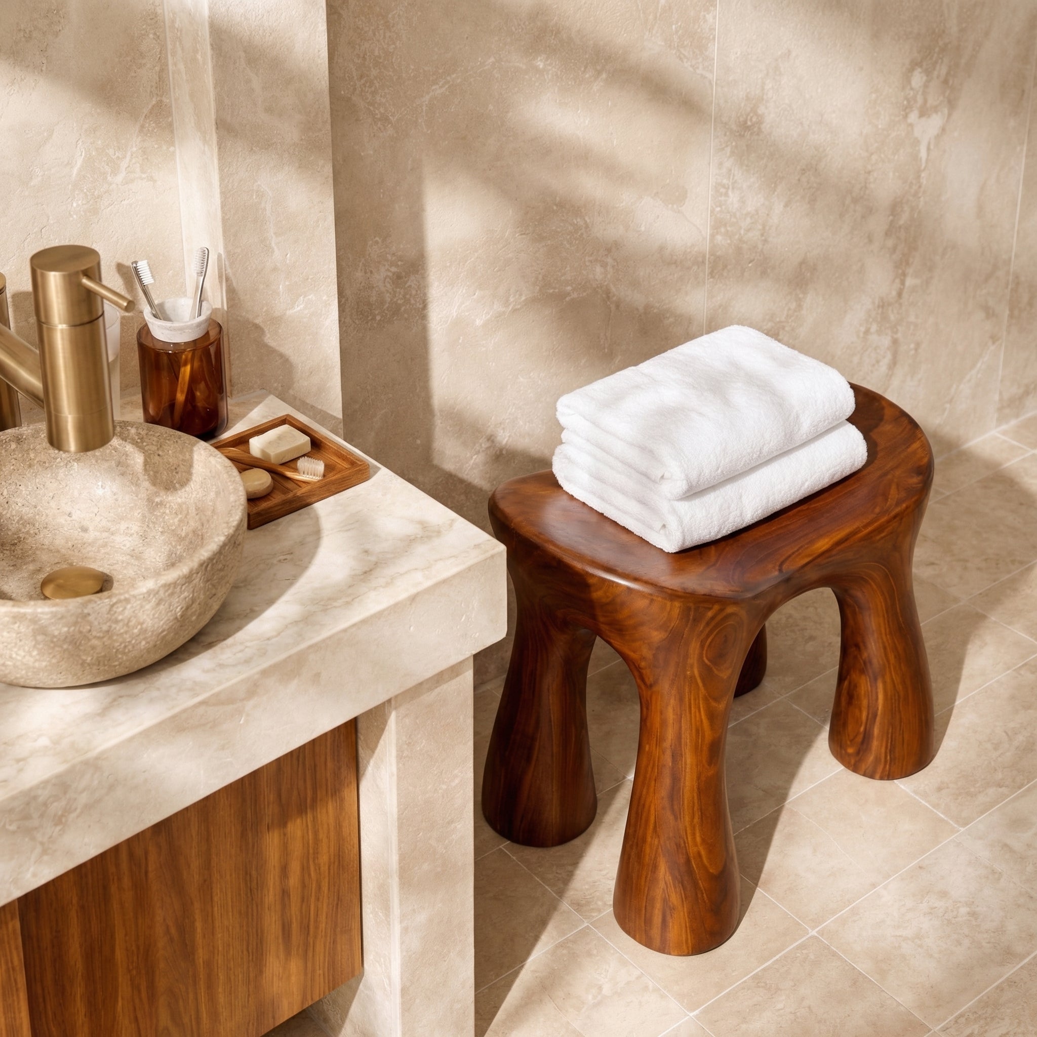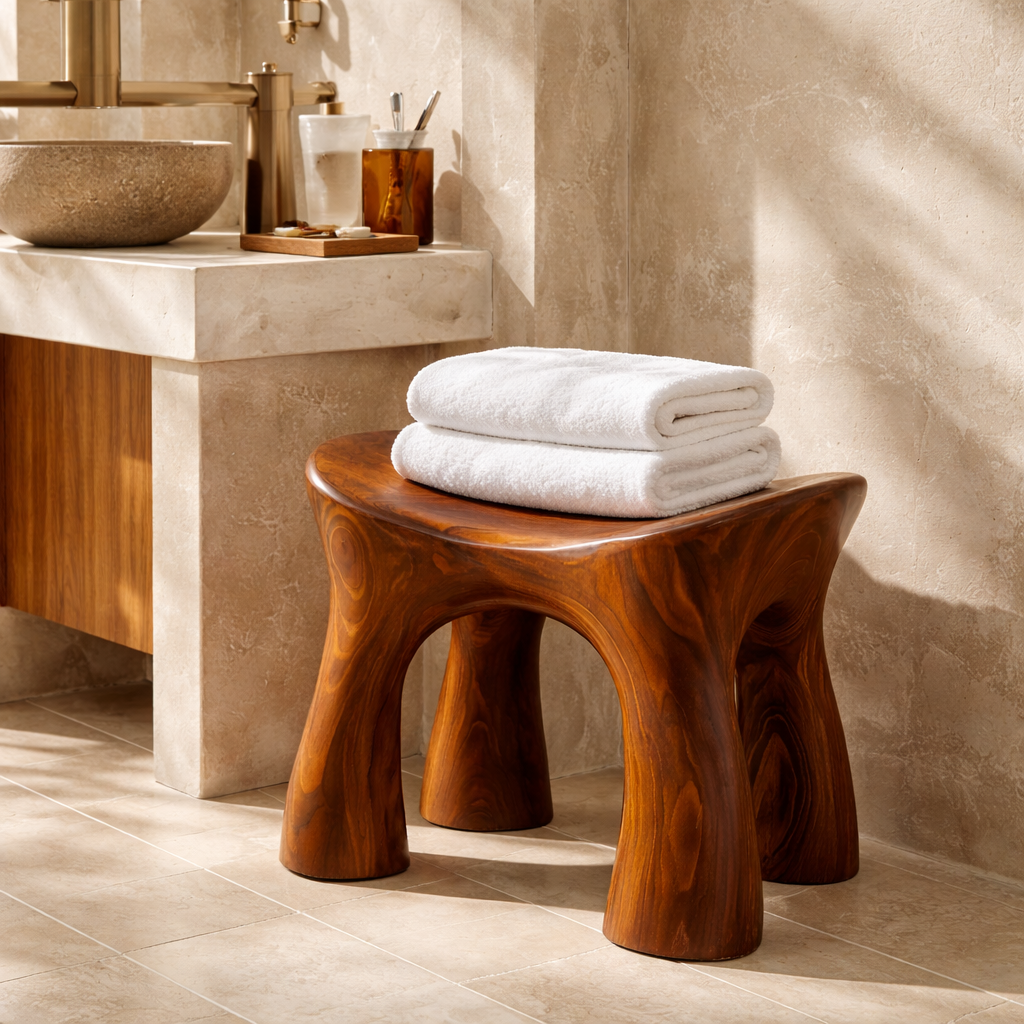 Carefully shaped and finished by skilled artisans, this stool reflects precision and dedication in every detail. The smooth edges and balanced structure demonstrate expert craftsmanship, resulting in a piece that is both sturdy and visually refined. Each stool carries its own character, making it a timeless addition to any modern bathroom environment.