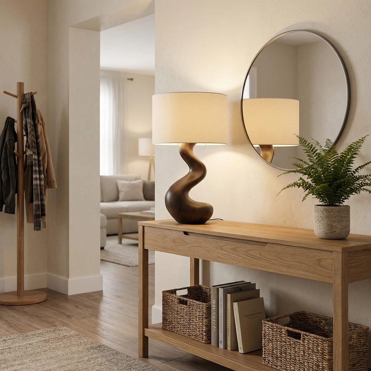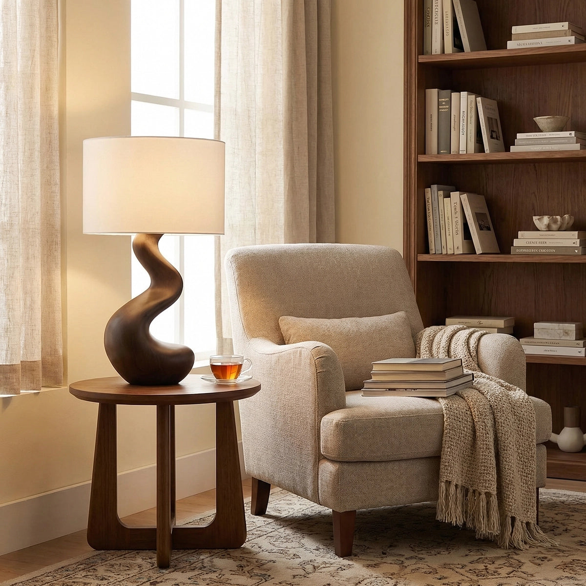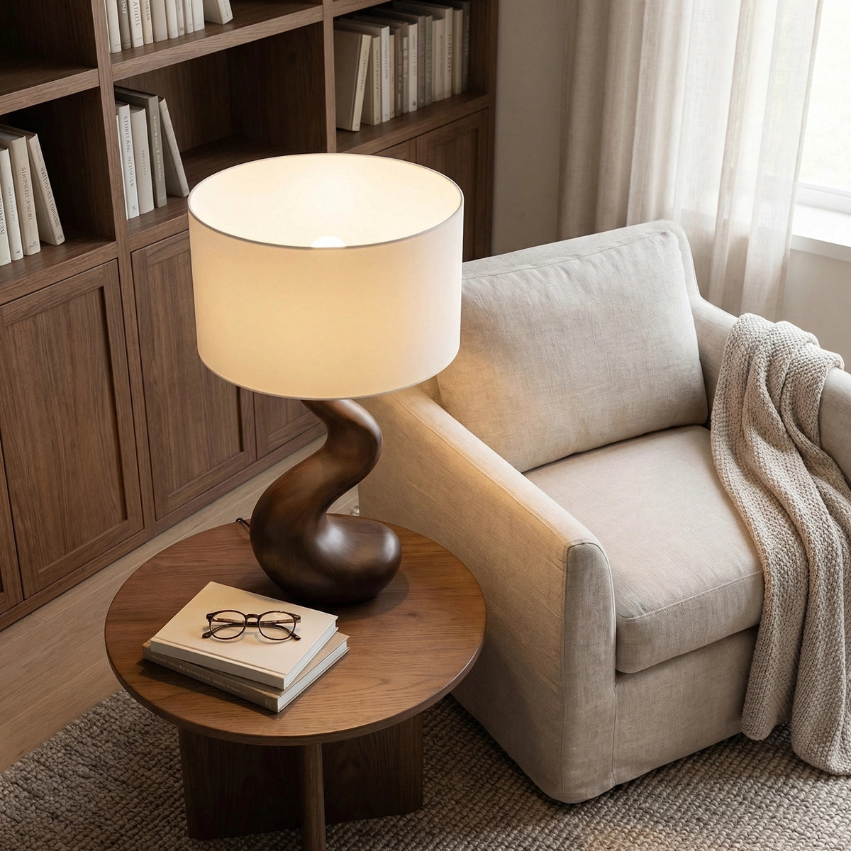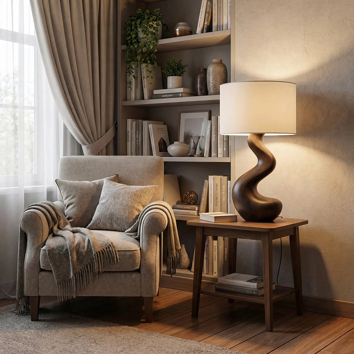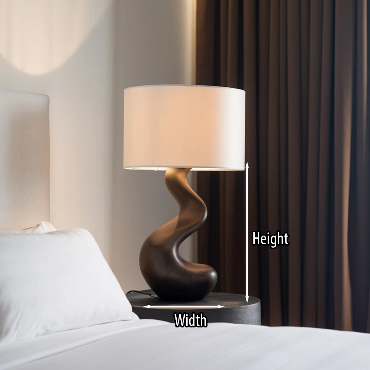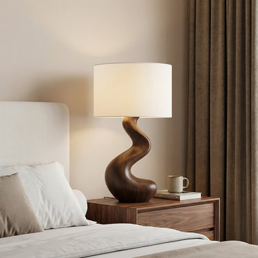 Softly sculpted and effortlessly refined, this handcrafted solid wood table lamp brings a sense of calm movement and natural elegance into modern interiors. Its gently curved silhouette flows upward in a smooth, organic line, creating a subtle sculptural presence that feels both grounded and fluid. Paired with a clean fabric shade, it emits a warm, diffused light perfect for creating a serene and restful atmosphere.