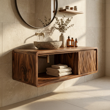 The Fluted Panel Solid Wood Floating Vanity with Open Storage brings together natural warmth, sculptural softness, and refined texture in one thoughtfully designed bathroom piece. Its gently curved outer frame creates a seamless floating silhouette, while the fluted wood panel adds depth and subtle architectural rhythm to the overall form. Designed to feel calm, balanced, and inviting, this vanity is a beautiful addition to modern bathrooms and spa-inspired interiors.