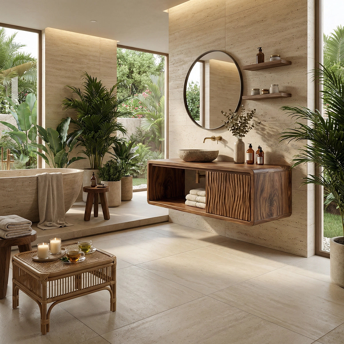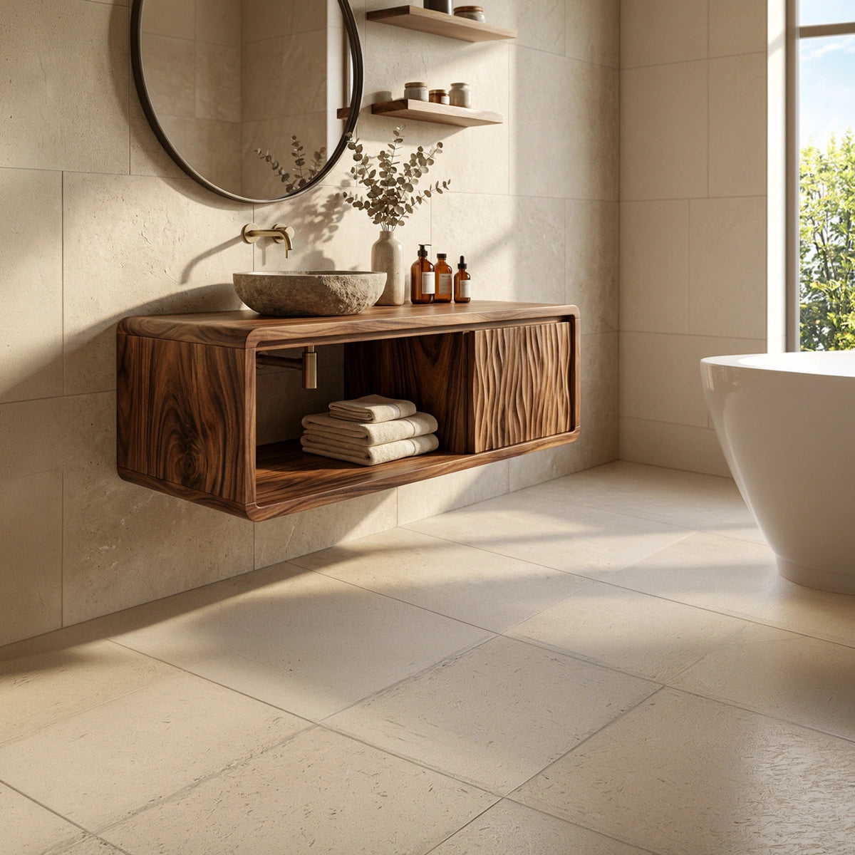 Handcrafted from natural wood, each vanity is carefully shaped and hand-finished to highlight the richness of the grain, tonal variation, and authentic texture of the material. The flowing wood patterns bring warmth and individuality to the piece, while the contrast between smooth surfaces and fluted detailing adds another layer of handcrafted character. These natural details ensure that every vanity carries its own distinct beauty.