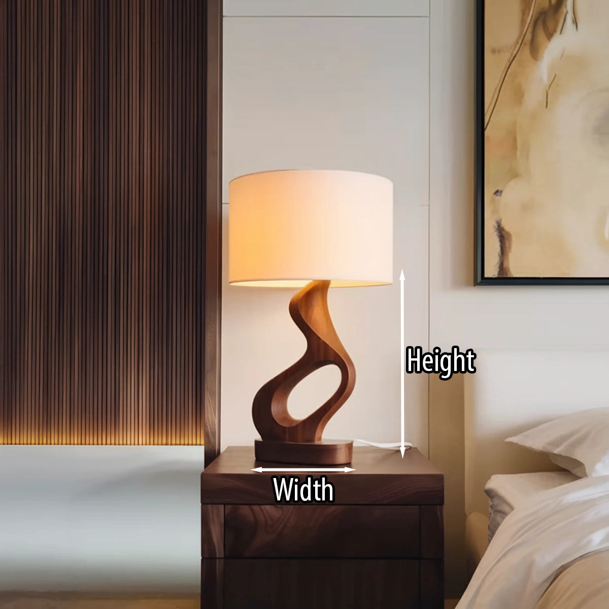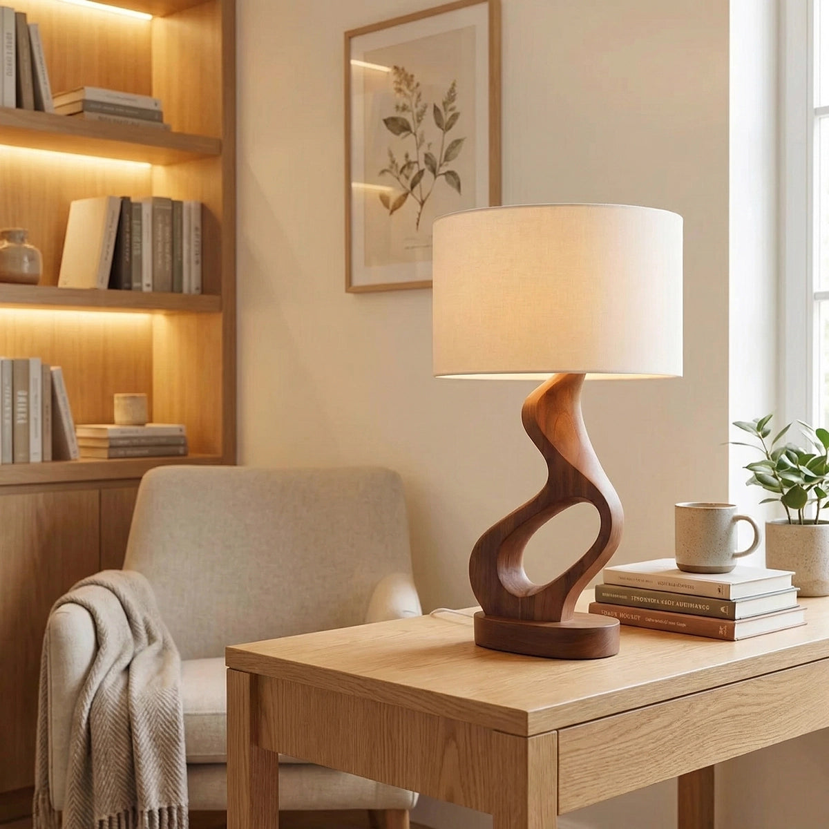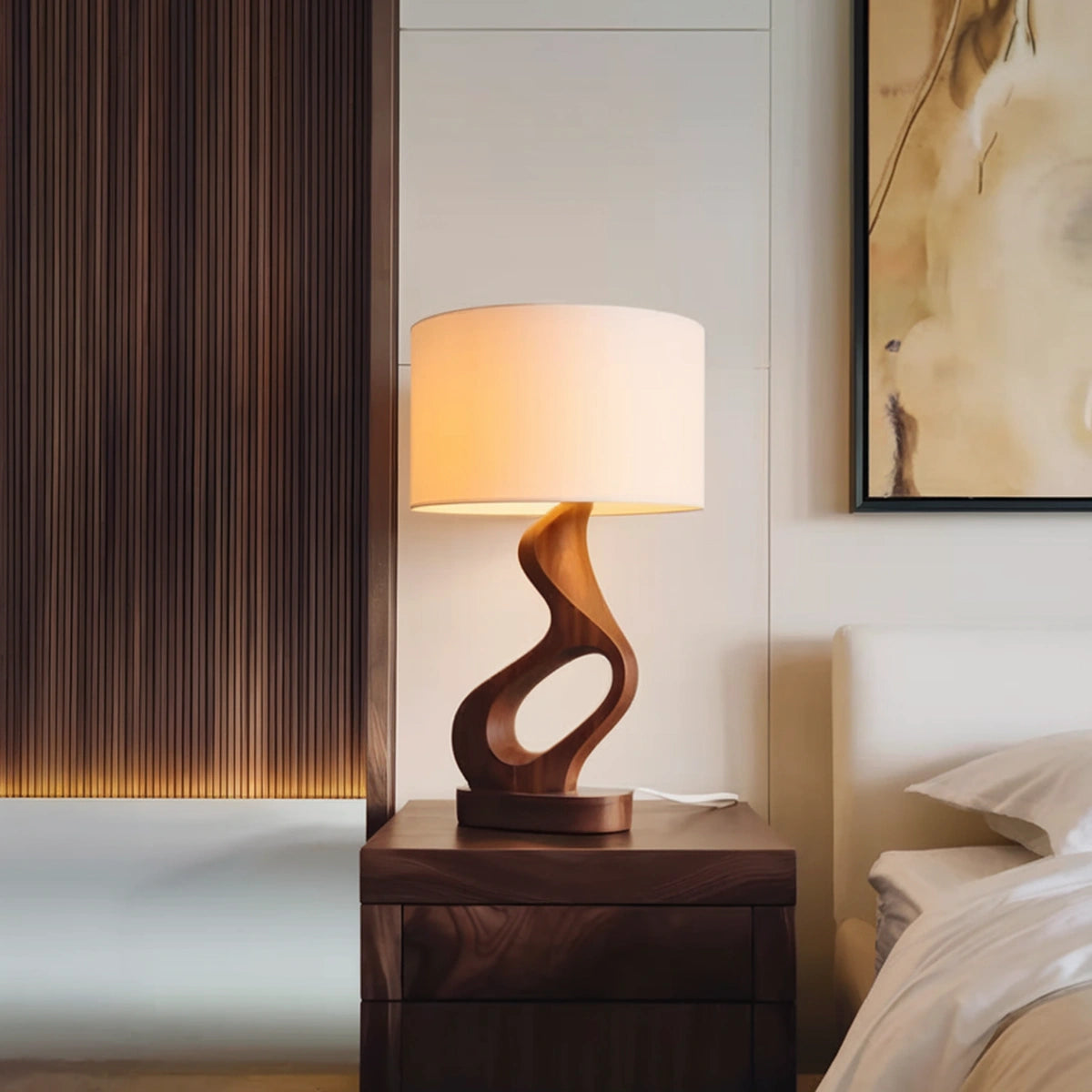 Designed with a flowing sculptural base, this table lamp features soft curves and an open carved form that create a sense of movement, lightness, and visual balance. The twisting silhouette gives the piece an expressive yet grounded presence, making it especially suited to interiors that value warmth, texture, and understated artistry. Paired with a fabric shade, the overall composition feels calm, inviting, and visually refined.