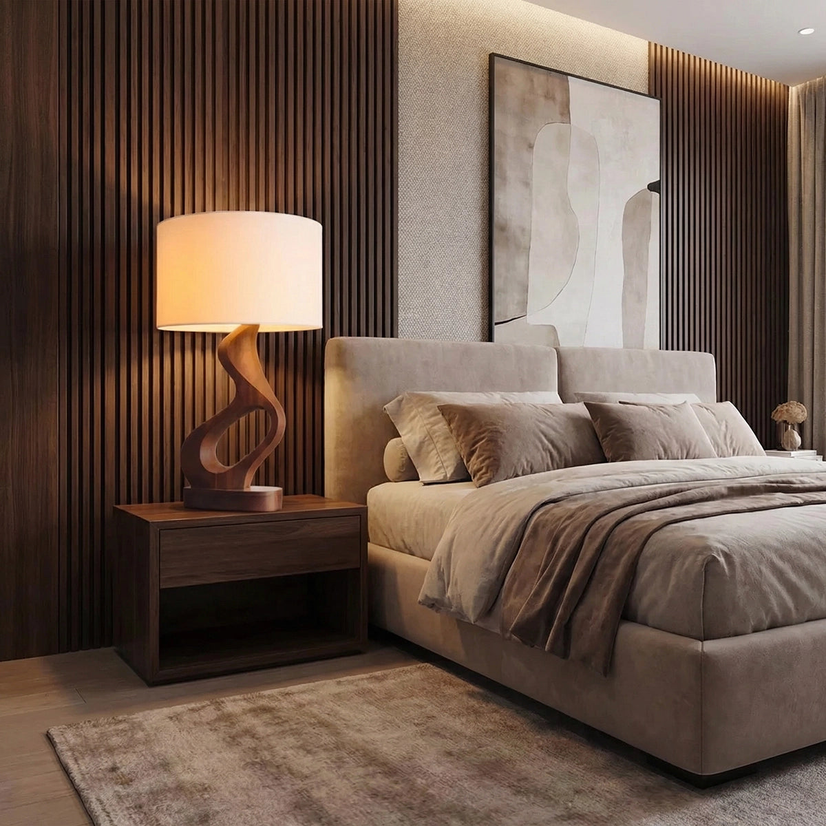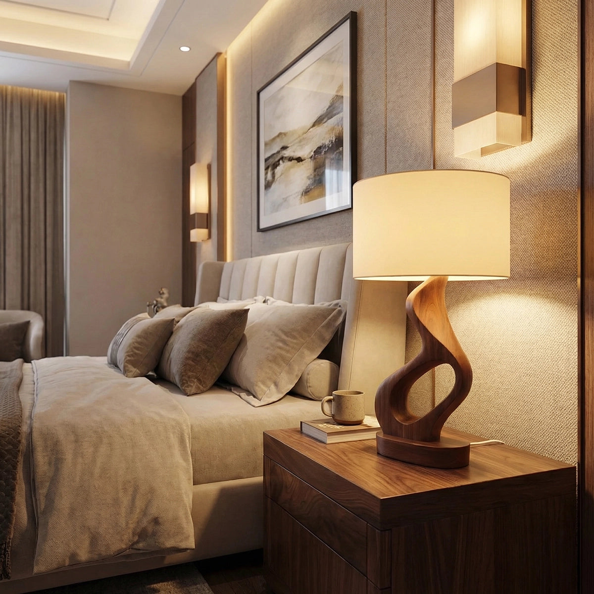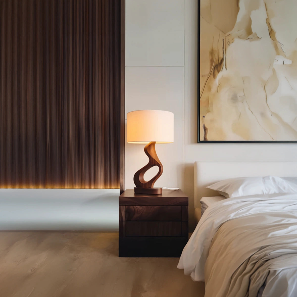 Designed with a flowing sculptural base, this table lamp features soft curves and an open carved form that create a sense of movement, lightness, and visual balance. The twisting silhouette gives the piece an expressive yet grounded presence, making it especially suited to interiors that value warmth, texture, and understated artistry. Paired with a fabric shade, the overall composition feels calm, inviting, and visually refined.