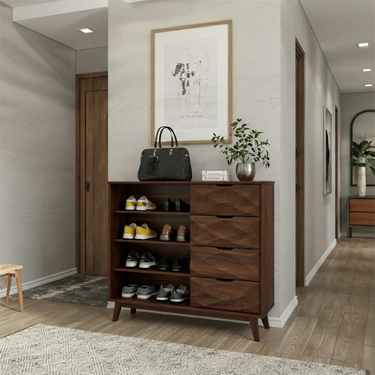 The design is defined by its geometric drawer fronts, which introduce subtle depth and texture while keeping the overall silhouette streamlined. The light wood finish enhances the natural grain and gives the piece a fresh, open character that works beautifully in bright interiors. Open shelves on one side allow easy access to frequently worn shoes, while the drawers keep smaller items tucked away for a more composed appearance. Tapered legs lift the cabinet slightly from the floor, adding a lighter, more elevated feel.