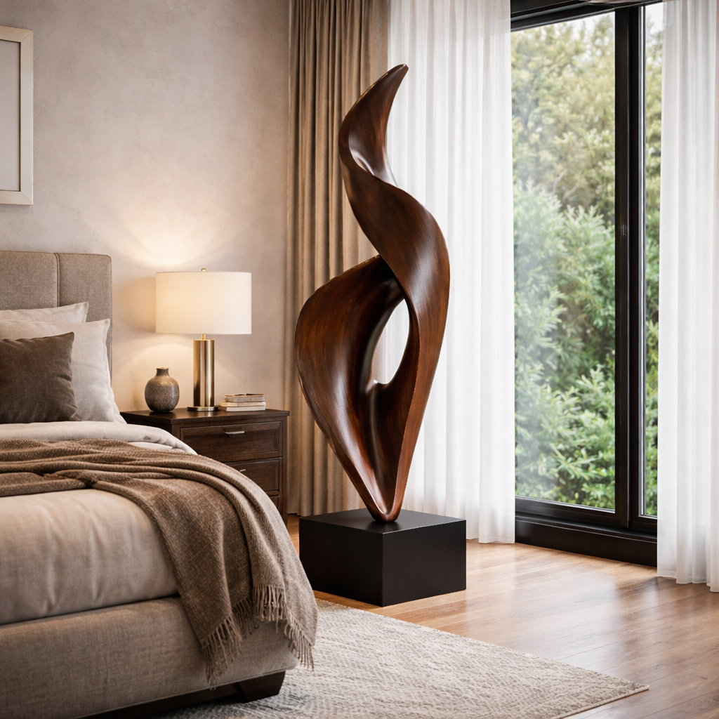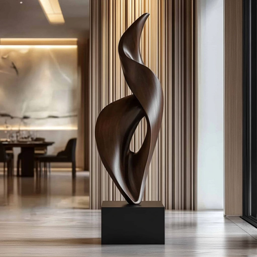 A striking abstract sculpture handcrafted from natural solid wood, designed to bring depth, movement, and refined artistry into modern interiors. The flowing vertical form features smooth curves and a sculpted open center, creating a balanced composition that feels both dynamic and elegant. Its organic silhouette allows the piece to stand out as a focal point while still blending harmoniously with contemporary architectural spaces.