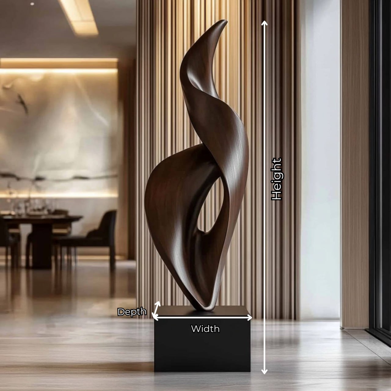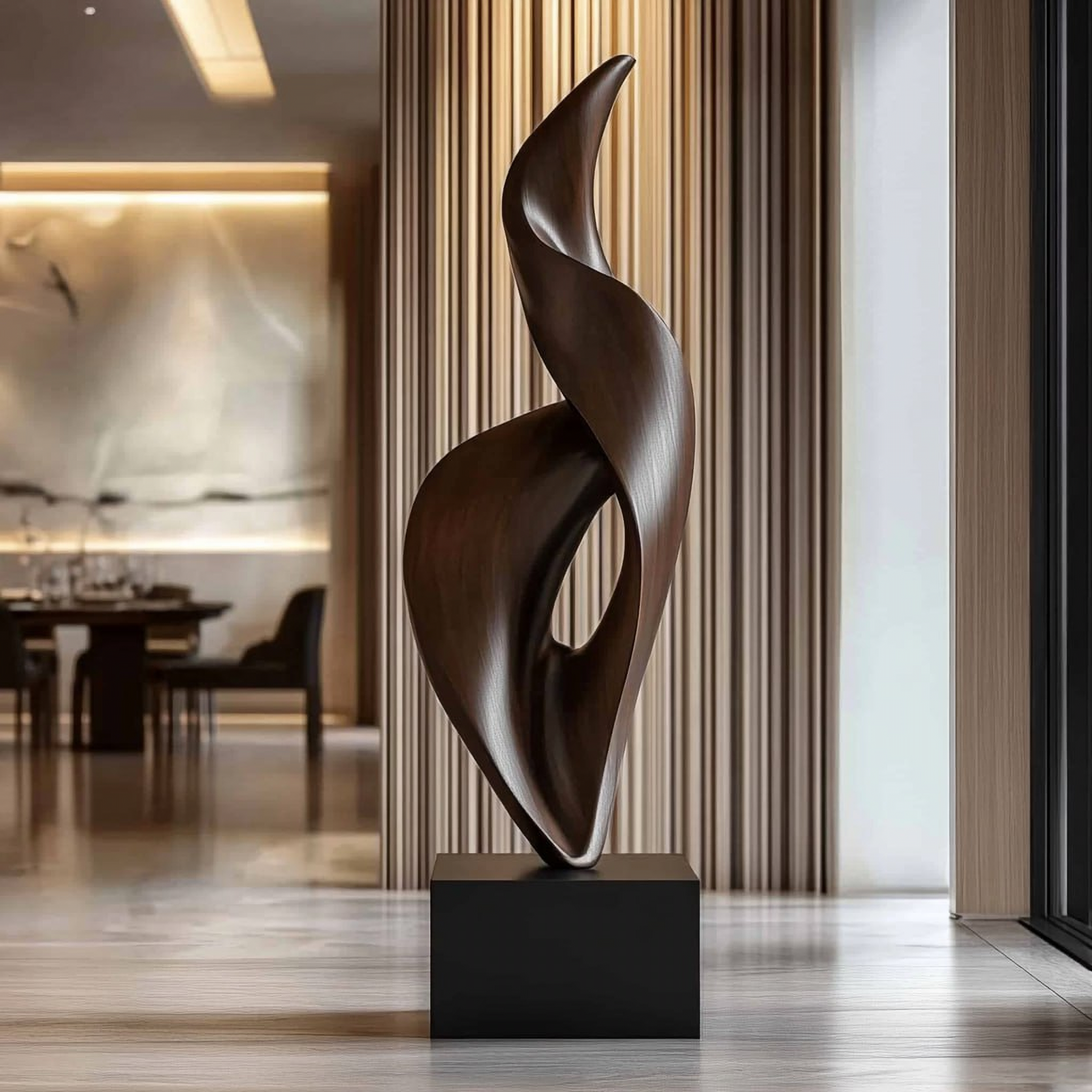 Perfect for living rooms, entryways, offices, hotel lobbies, and gallery-style interiors, this solid wood sculpture adds vertical presence without overwhelming the space. Placed on a pedestal, console, or floor base, it creates a strong visual anchor that enhances minimalist, modern, organic, and luxury interior styles. The sculptural form interacts beautifully with light and shadow, adding dimension throughout the day.