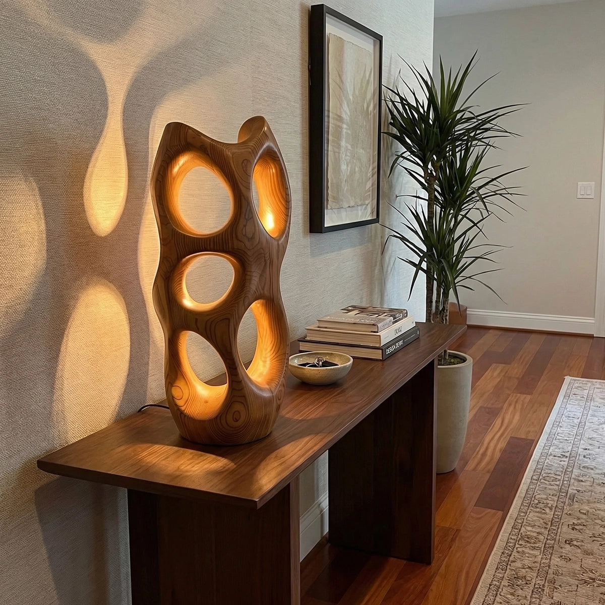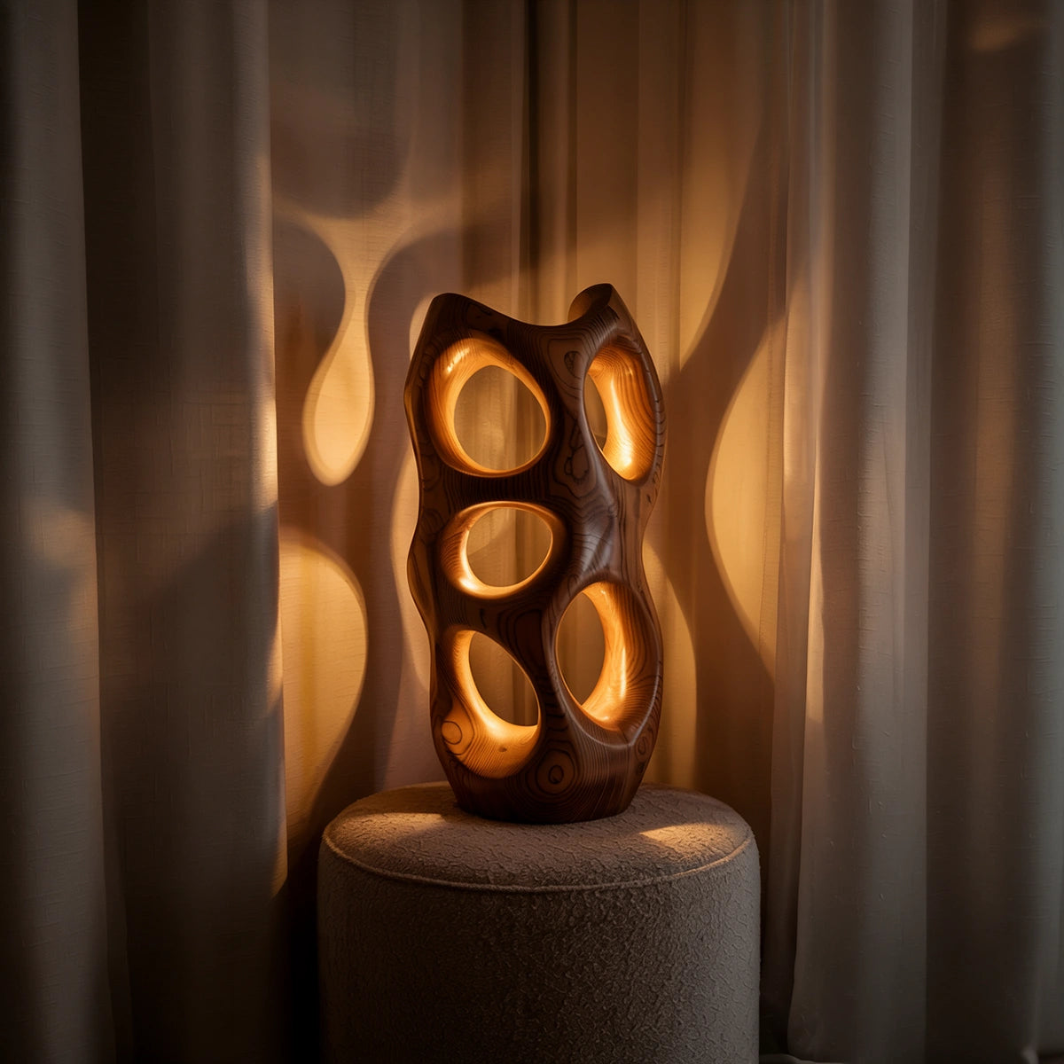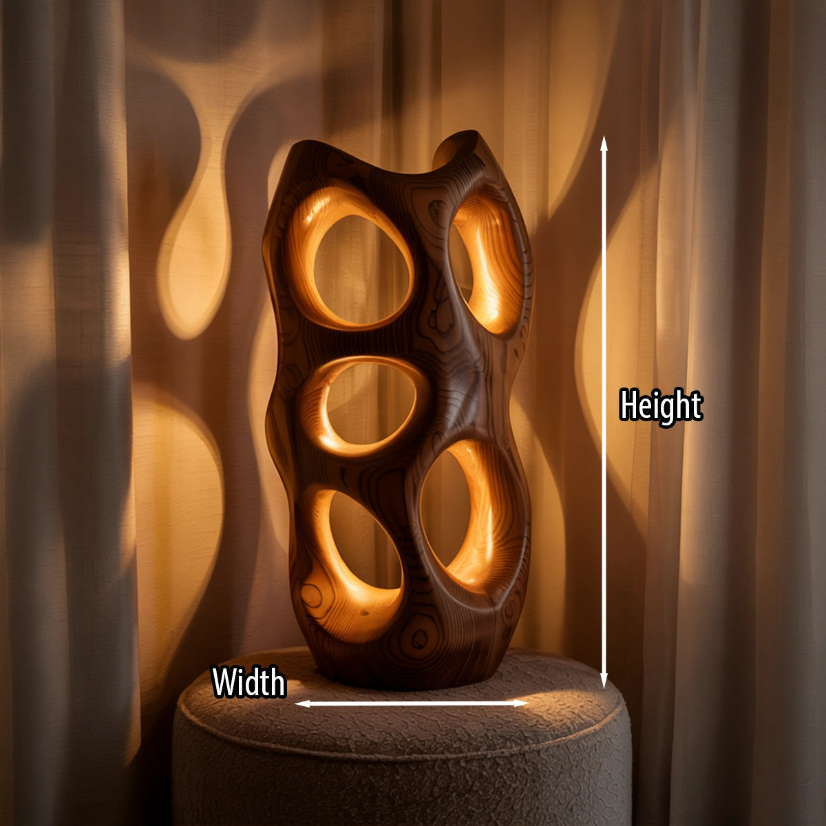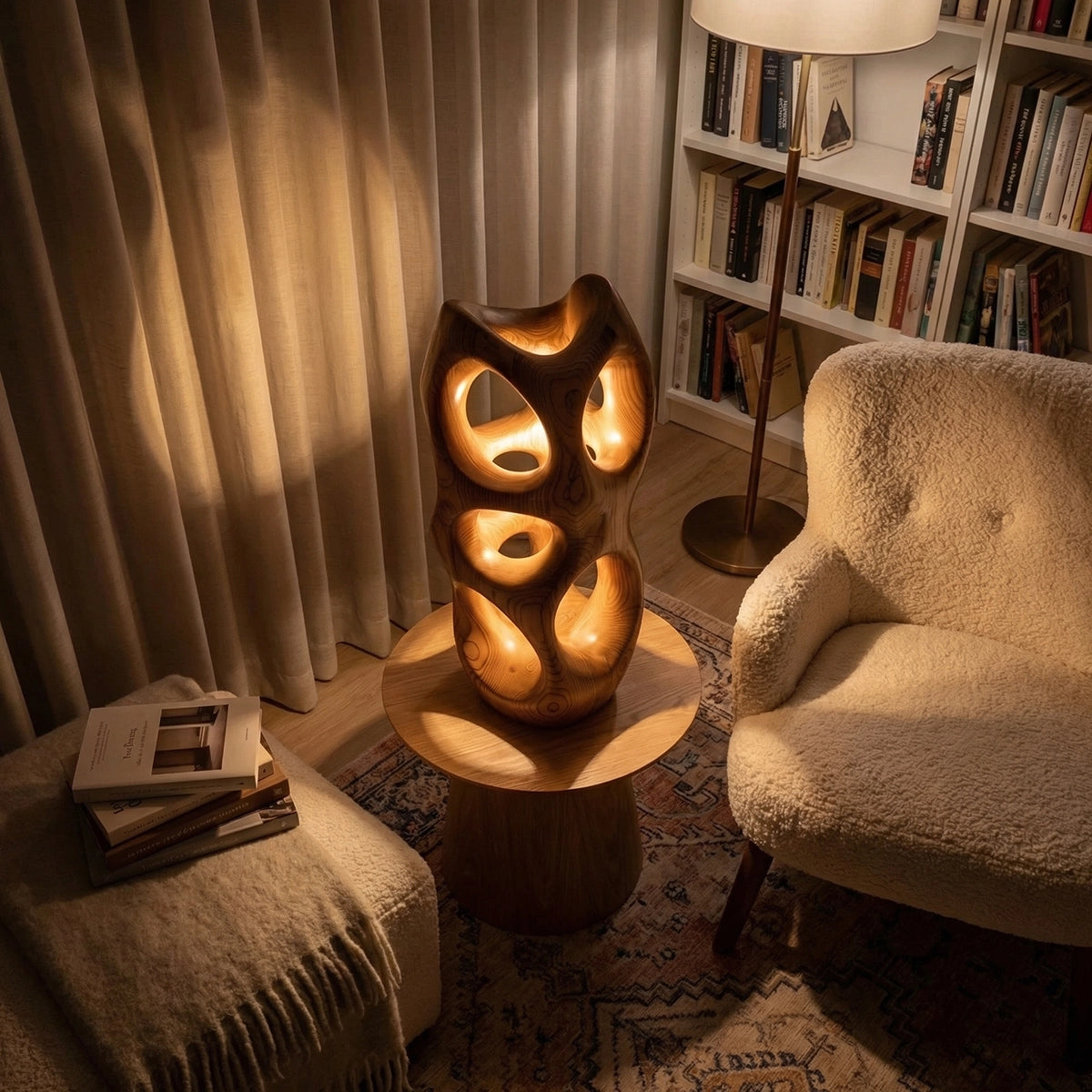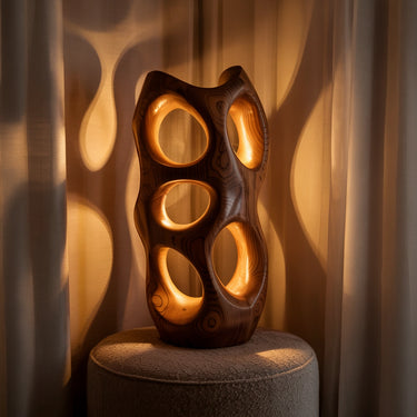 Striking and atmospheric, this handcrafted solid wood accent lamp transforms light into an artistic experience. Its abstract, vertical form is carved with multiple organic openings, allowing warm light to radiate through the structure and project soft, glowing patterns onto surrounding surfaces. The result is a calming interplay of light and shadow that brings depth, texture, and visual warmth to any interior.