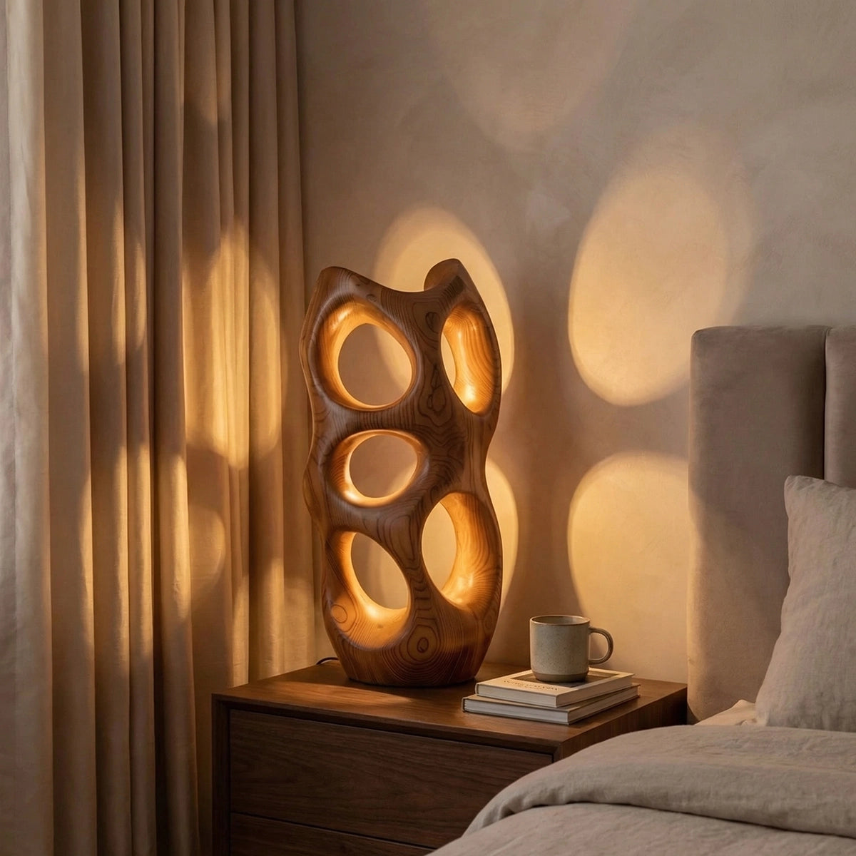 Perfect for bedside tables, living rooms, or ambient lighting in cozy corners, this lamp functions as both decor and mood lighting. Its organic modern aesthetic pairs effortlessly with minimalist, contemporary, and warm neutral interiors, adding a soft, artistic glow without the need for a traditional shade.
