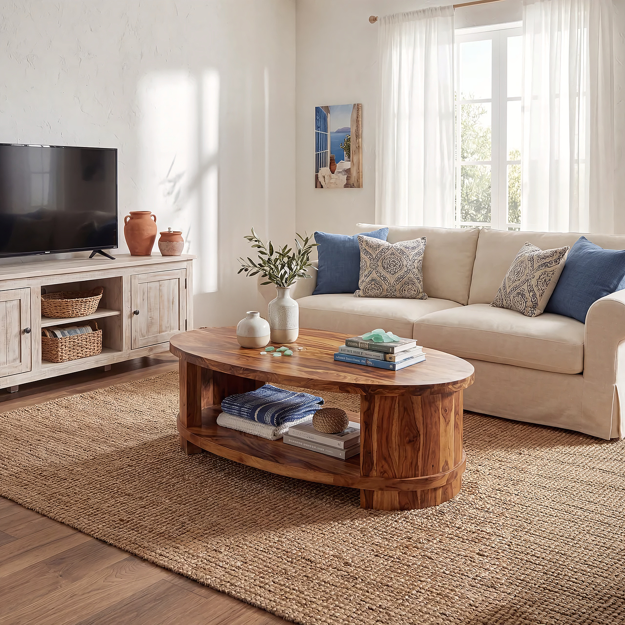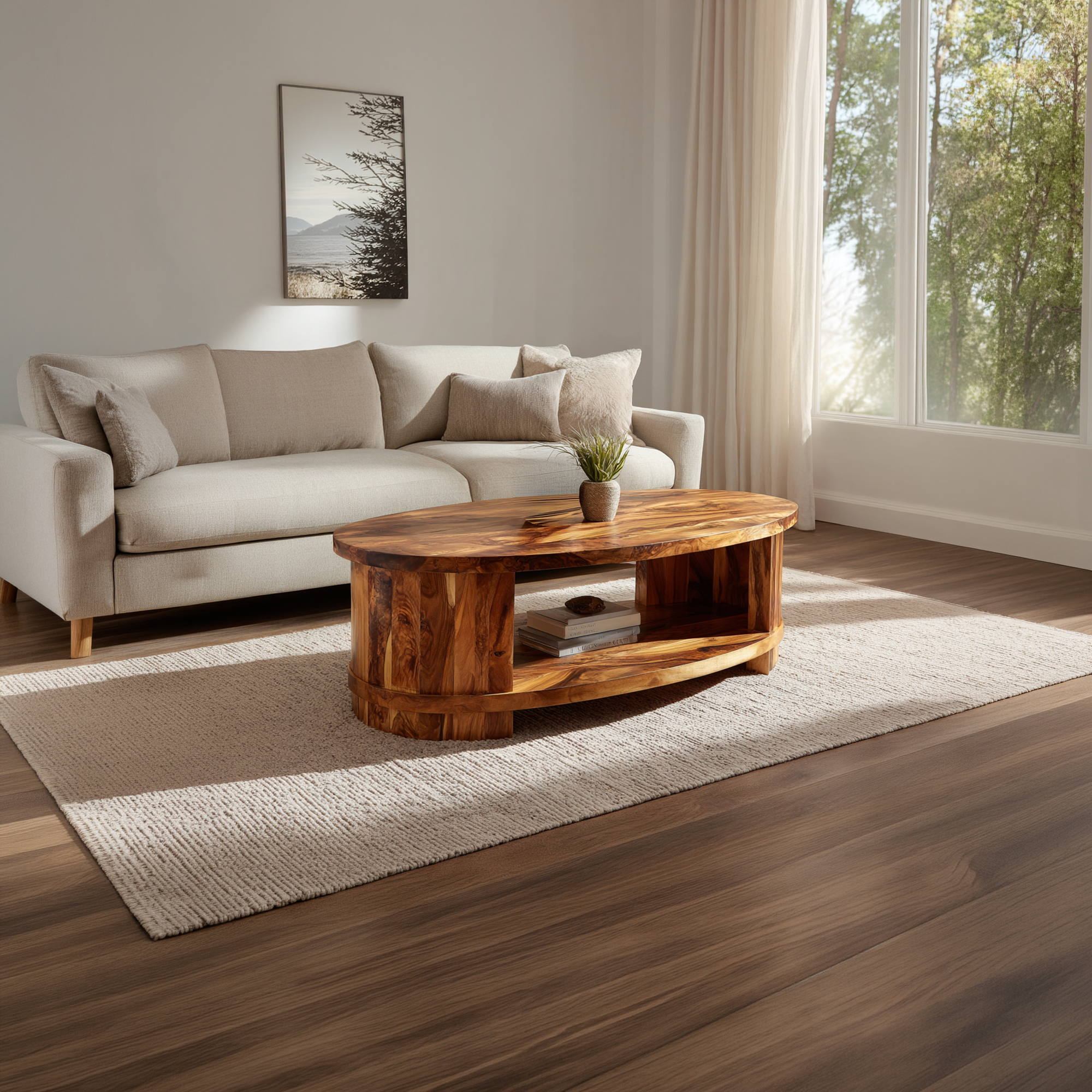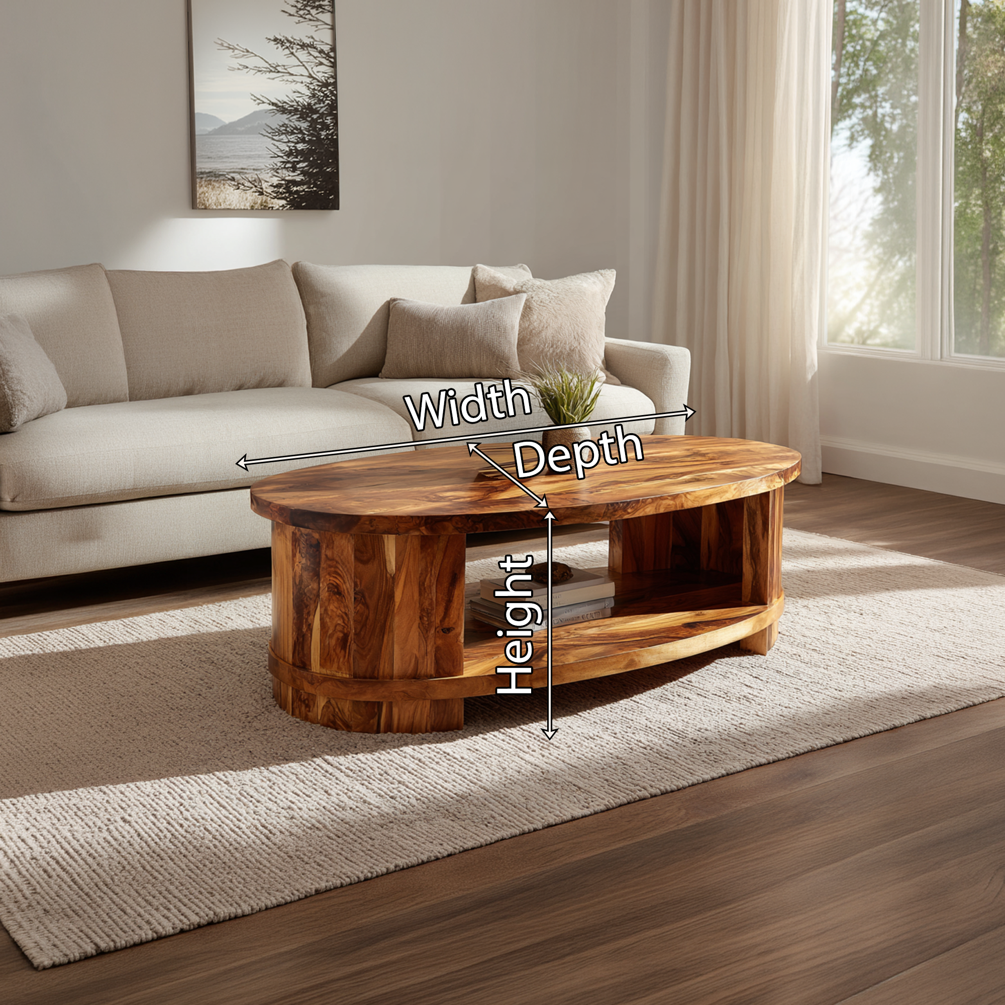 The Oval Coffee Table with Curved Frame and Open Storage Shelf brings a sense of balance and warmth to the living space through its soft silhouette and functional design. Its elongated oval shape creates a smooth, inviting presence, while the integrated open shelf offers practical storage for everyday essentials. Designed to combine refined form with usability, this table enhances interiors with understated elegance.
