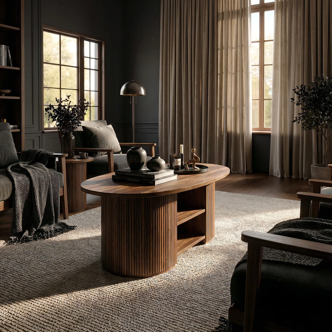 The Oval Coffee Table with Fluted Base and Dual Shelf Storage offers a refined balance of texture, form, and everyday functionality. Its elongated oval silhouette creates a soft, welcoming presence, while the vertically detailed base introduces subtle depth and visual rhythm. Designed with layered open storage, this table supports both display and organization within a clean, cohesive structure.