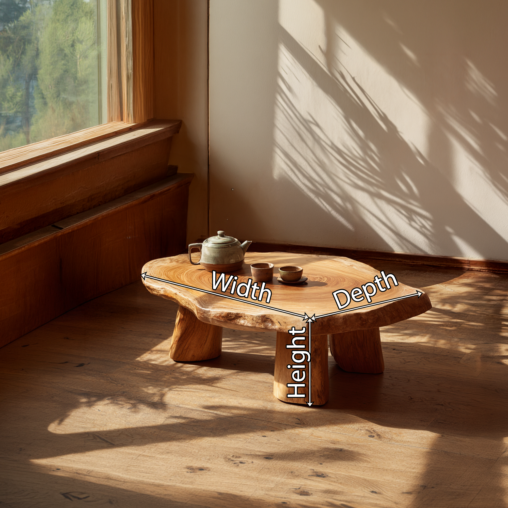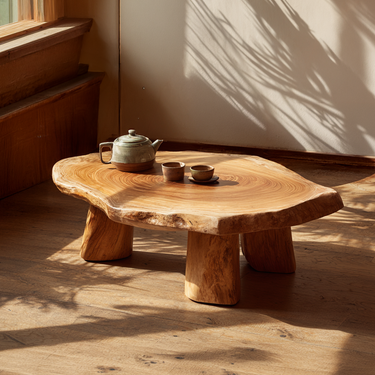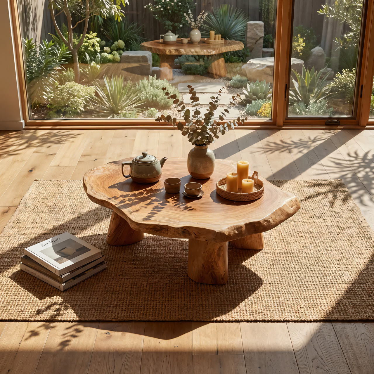 The tabletop features a rounded live edge shape with gently irregular contours that reflect the natural flow of the material. Its low profile creates an open and relaxed atmosphere, while the solid legs anchor the piece with a sense of strength and stability. The combination of organic shaping and simple structure allows the table to feel both expressive and harmonious within modern and nature-inspired spaces.